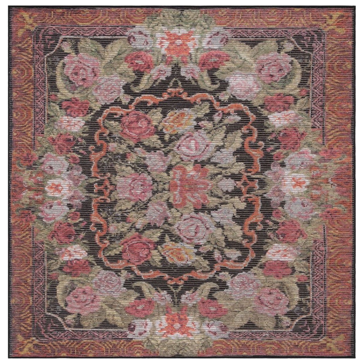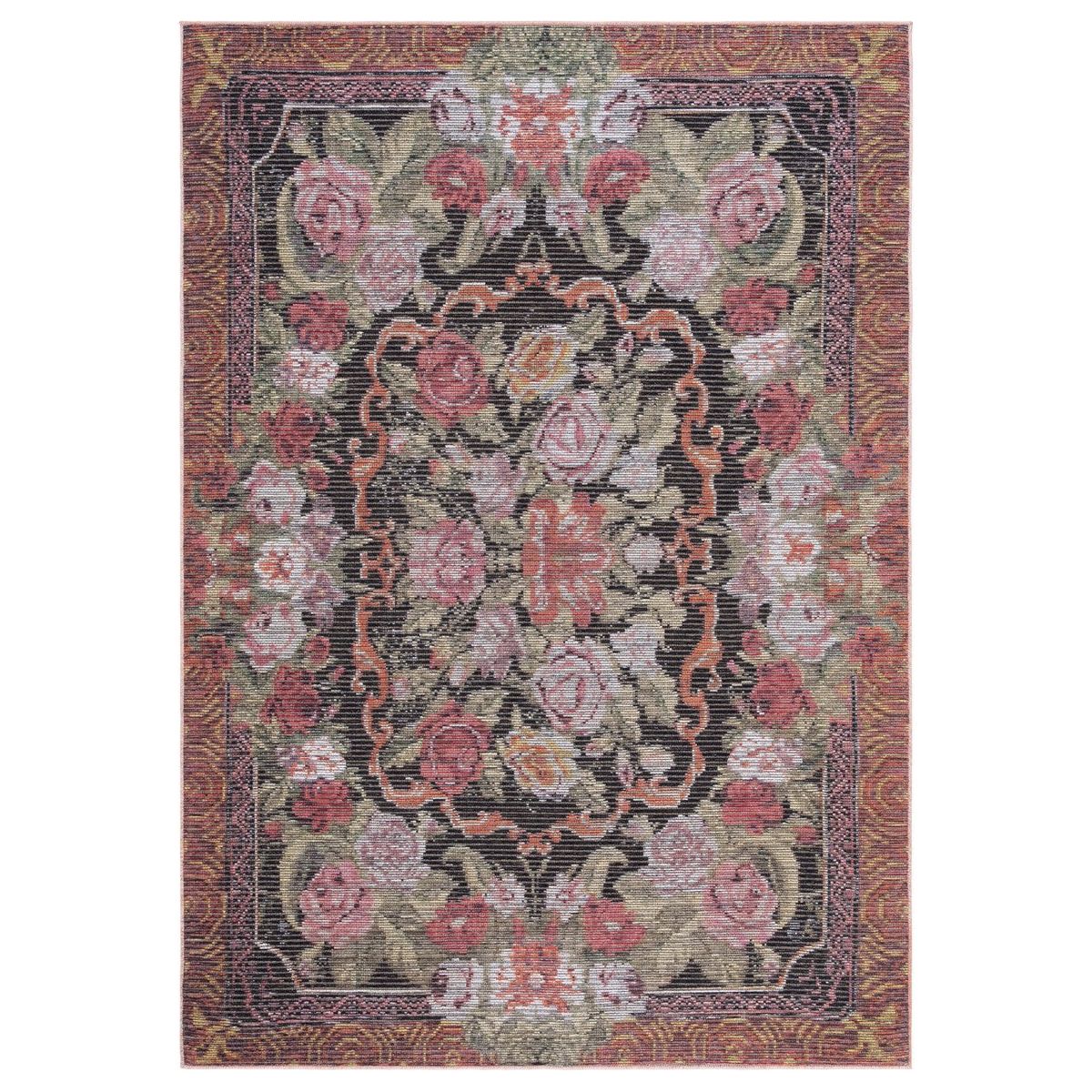 luxurious Besarabian BES220Y Black Sage Rust rug, a stunning piece that draws inspiration from the vibrant culture of Eastern Europe. Adorned with intricate floral patterns in vivid hues, this rug effortlessly elevates the aesthetic of any space. Crafted through power looming techniques, it is made from a blend of cotton, jute, and chenille for a soft and comfortable feel underfoot.