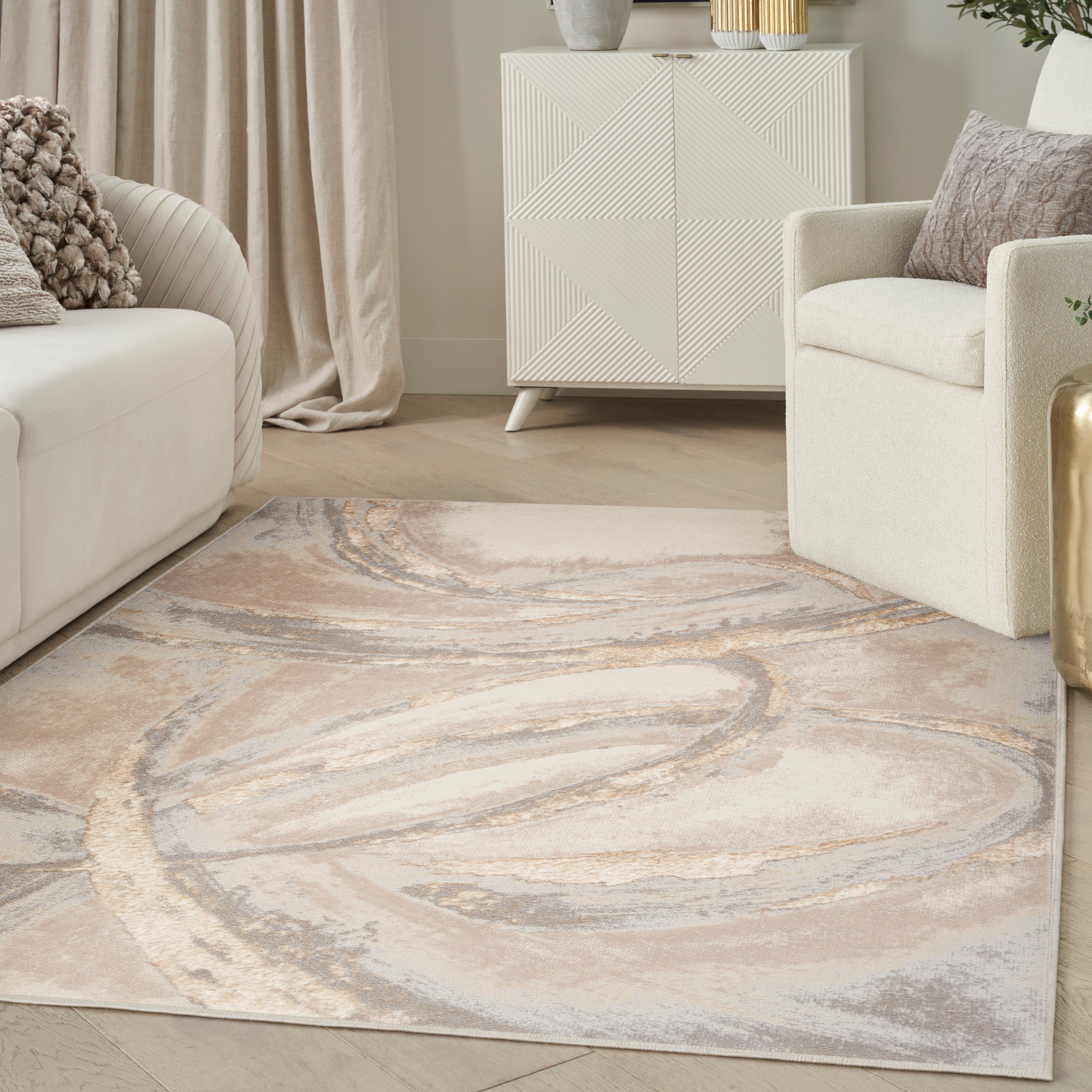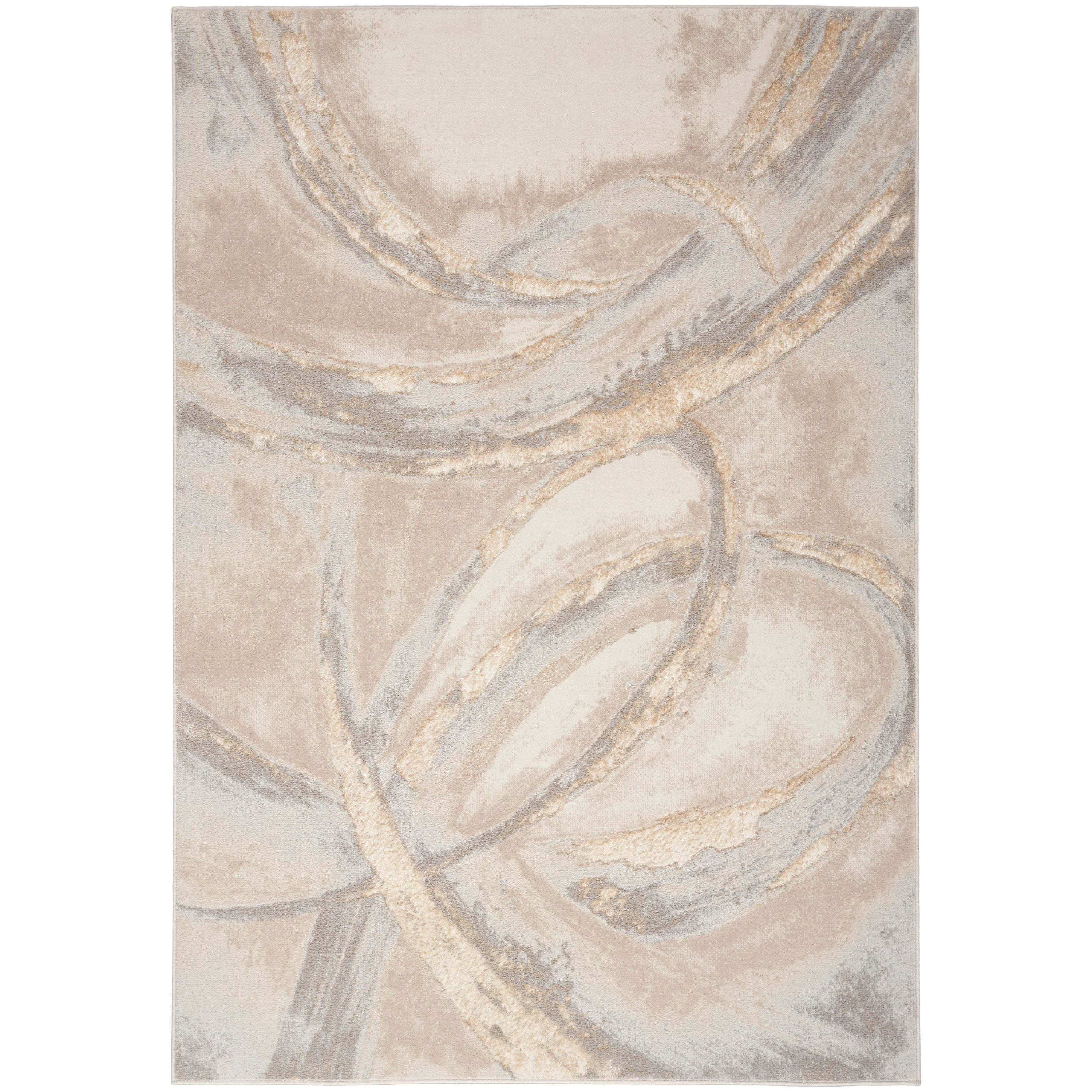 Brushstrokes BSK01 Beige Grey rug from the Inspire Me! Home Décor collection. Elevate your space with these exquisite area rugs that boast softly textured patterns and a captivating metallic sheen. The Brushstrokes series exudes glamour, featuring subtle high-low textural variations for added depth. Crafted from a durable polypropylene and polyester blend, these rugs offer both beauty and functionality.
