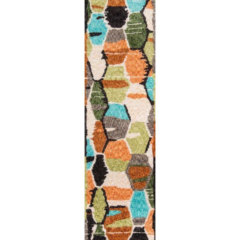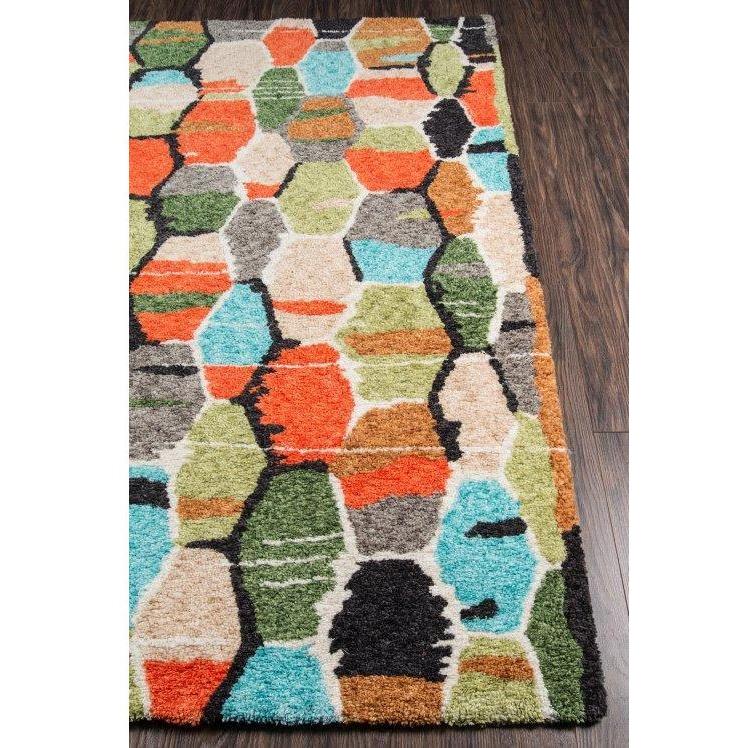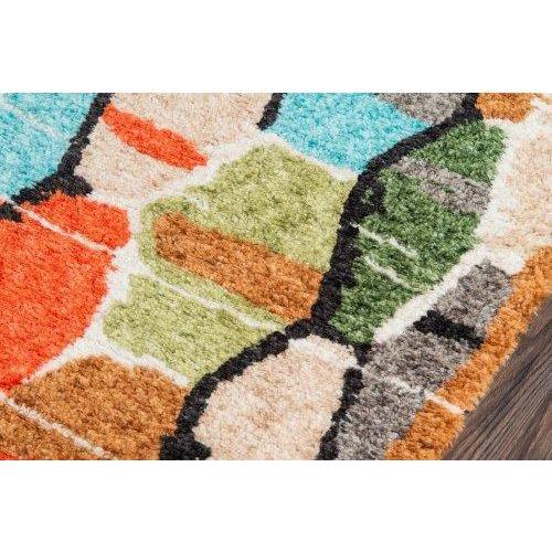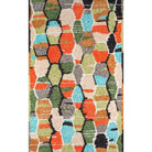 Bungalow Bun 3 Multi rug collection, featuring eye-catching geometric patterns and a vibrant bohemian color scheme. This modern area rug brings a retro flair to any space with its eclectic designs inspired by past decades. The rug showcases freeform diamonds, tribal prints, colorful hexagons, and stripes that add a touch of vintage charm to your decor.