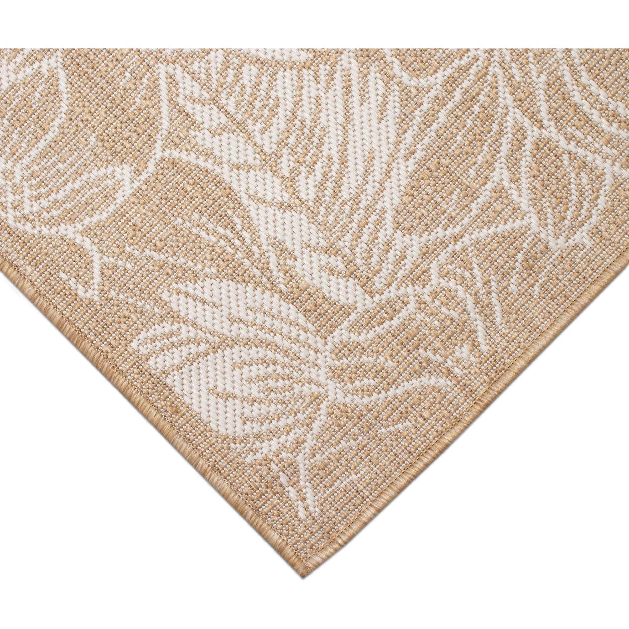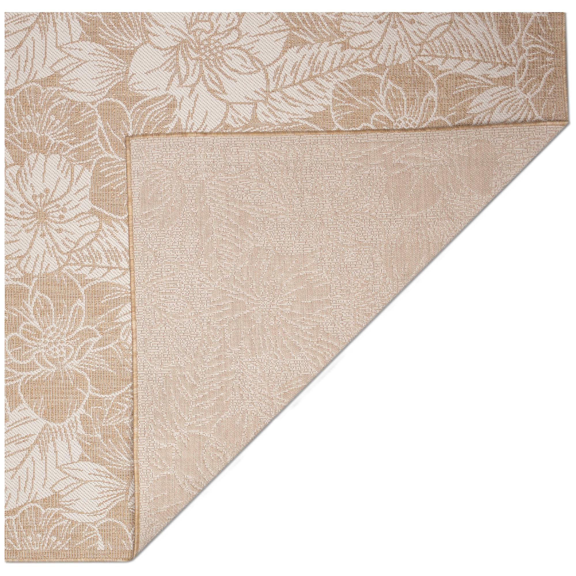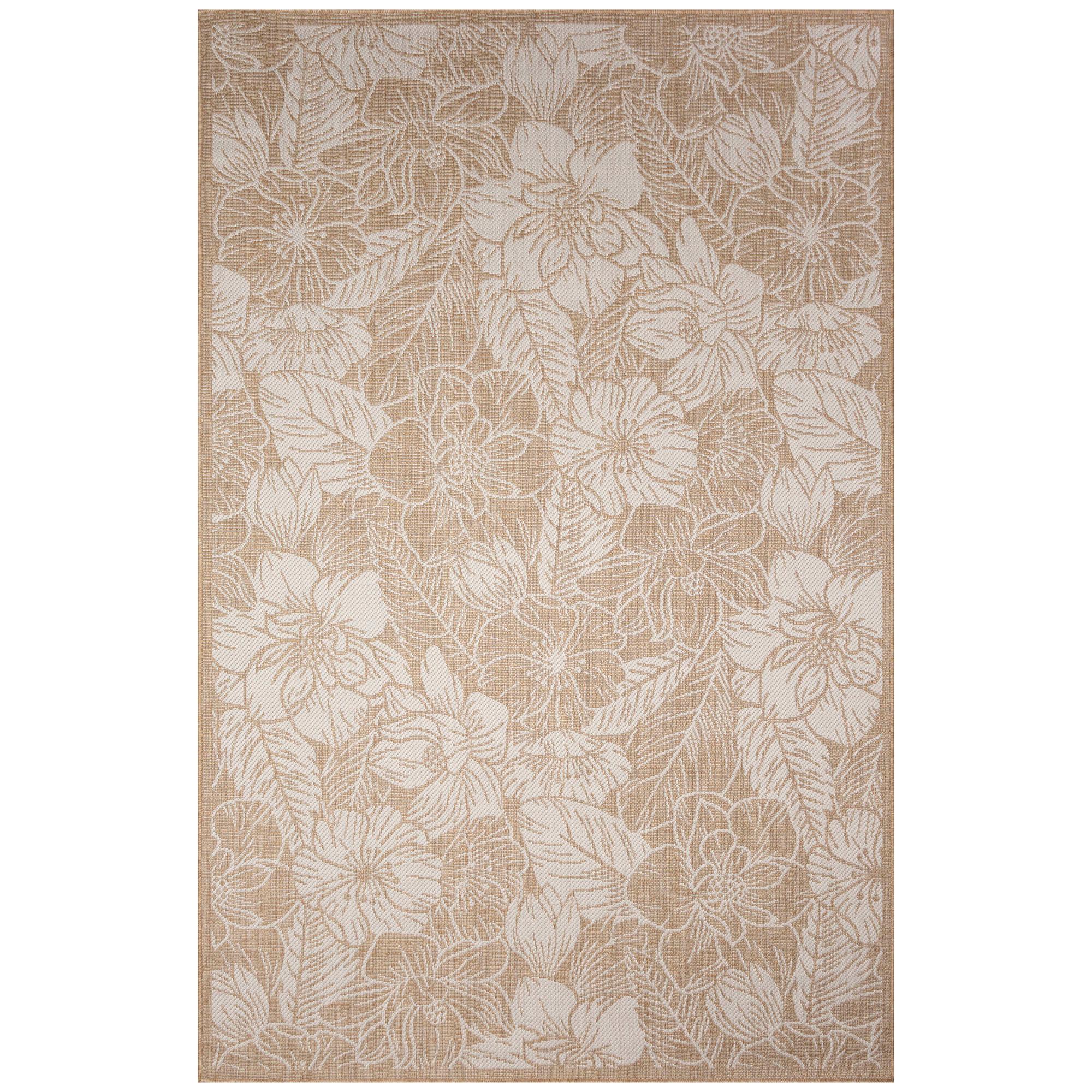 Carmel Botanical Beige area rug, a stunning addition to your home decor. Inspired by nature, this flatweave rug showcases a beautiful botanical pattern with etched florals in ivory against a tan sand background. The inverse colors create a striking visual contrast that will elevate any room's aesthetic.