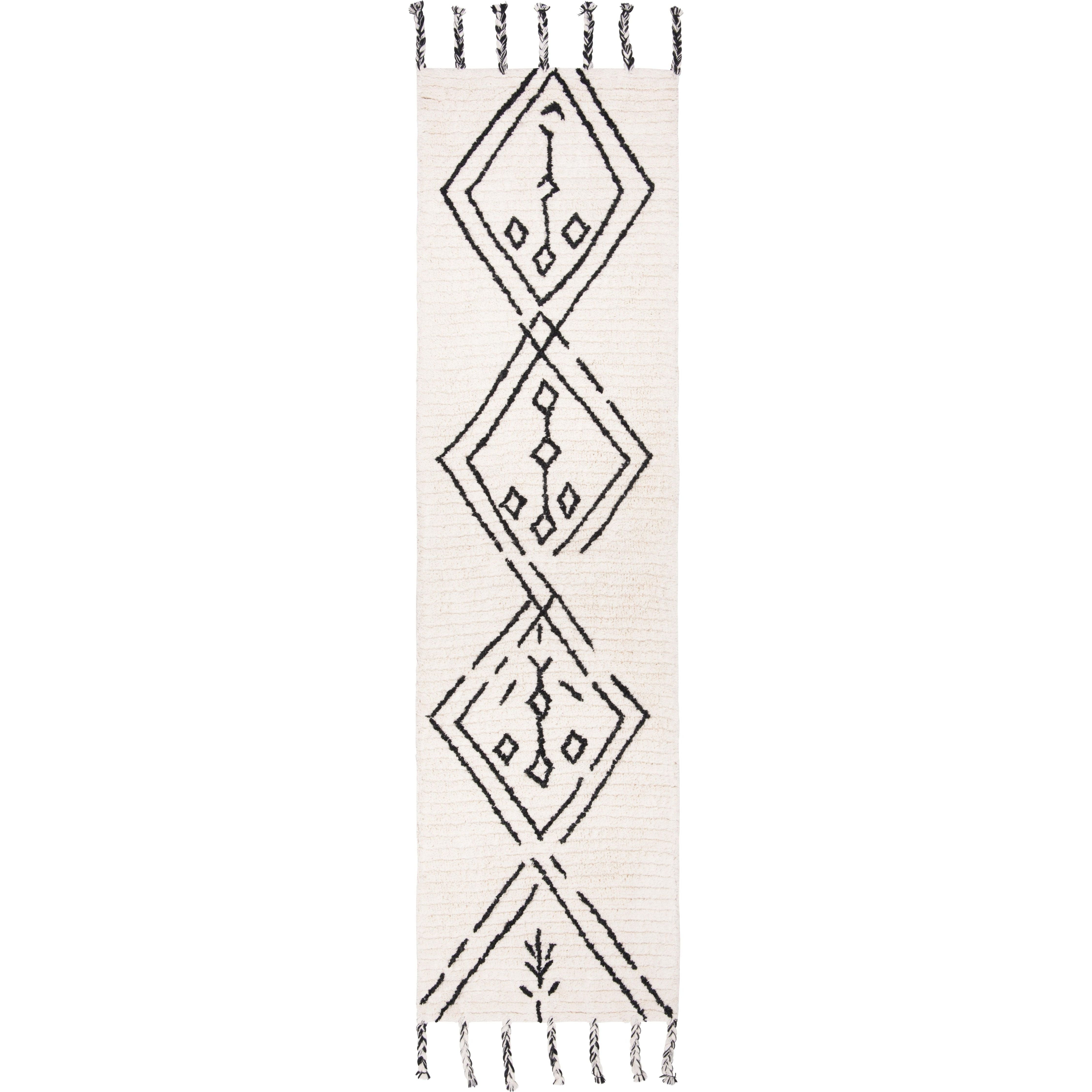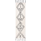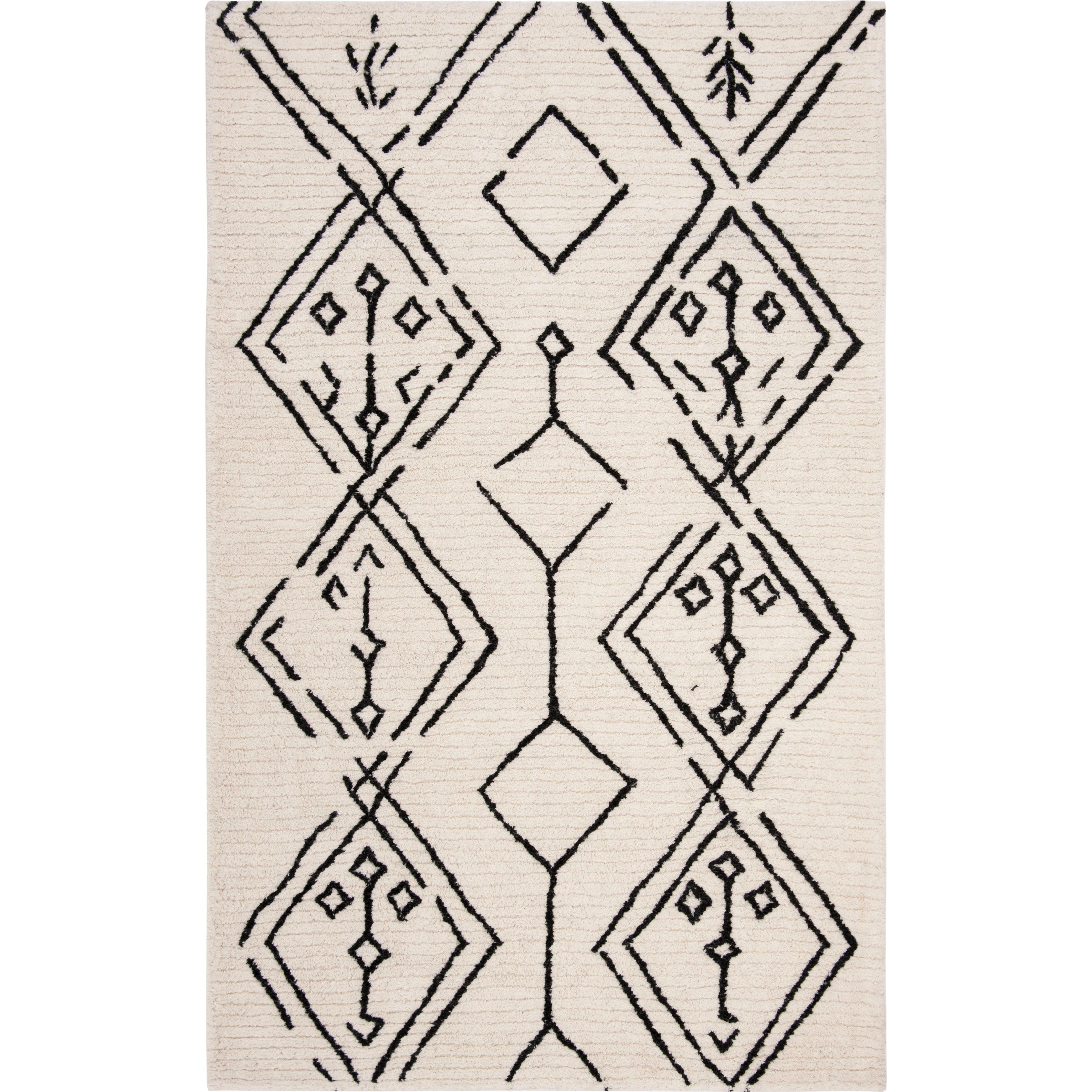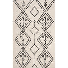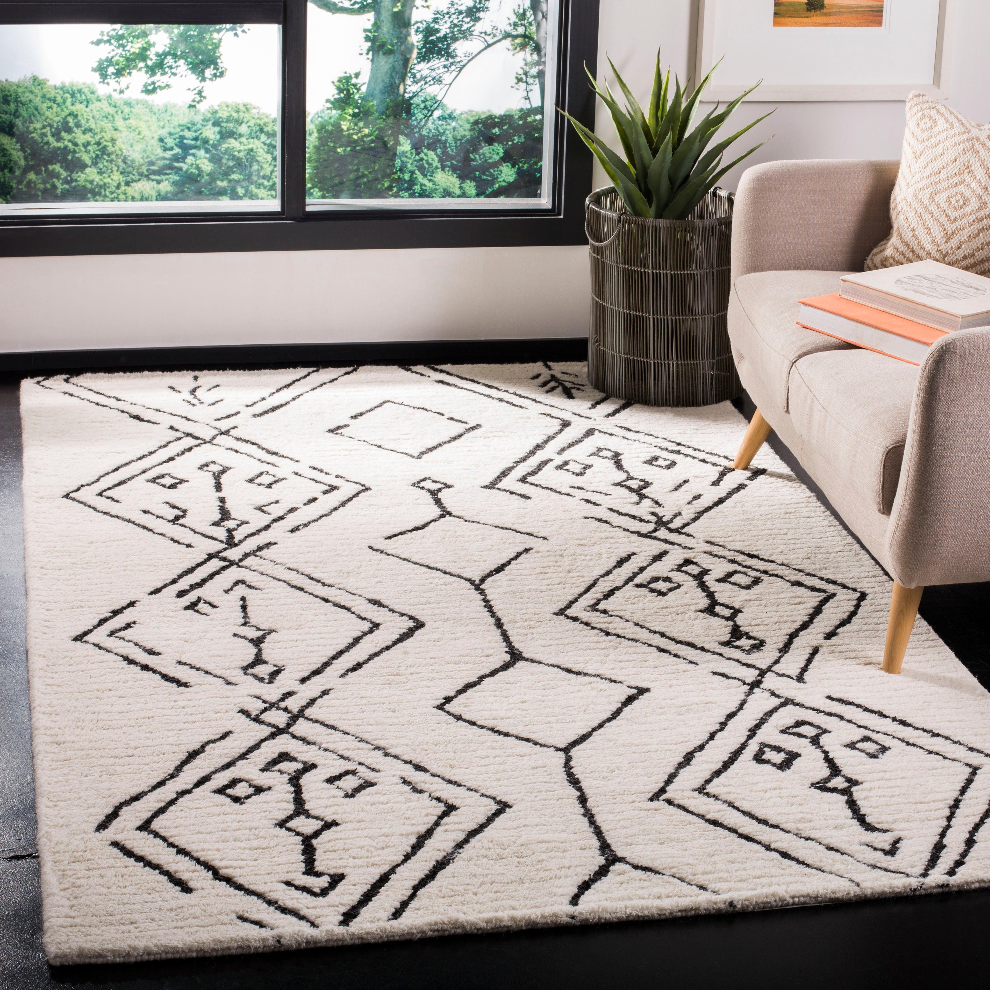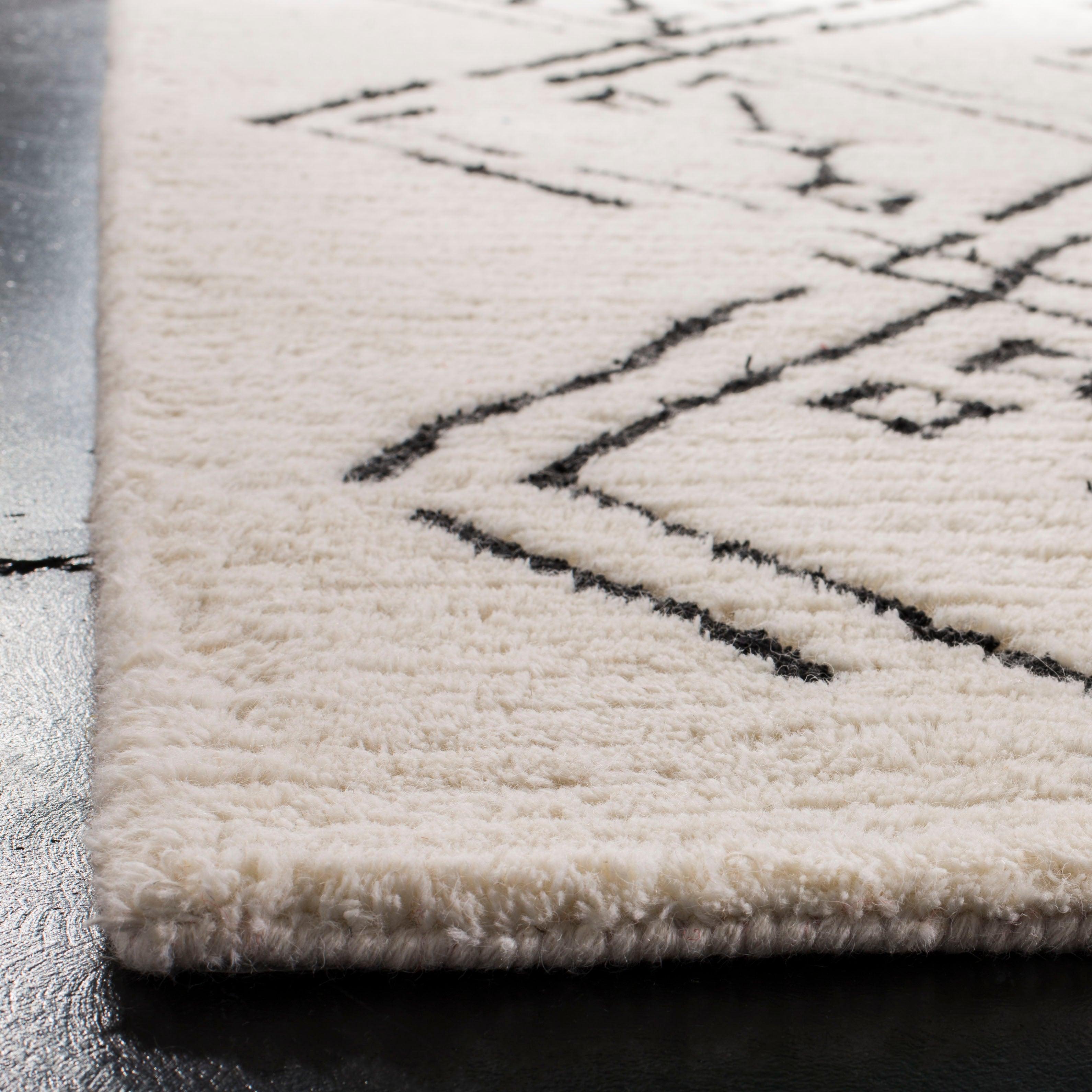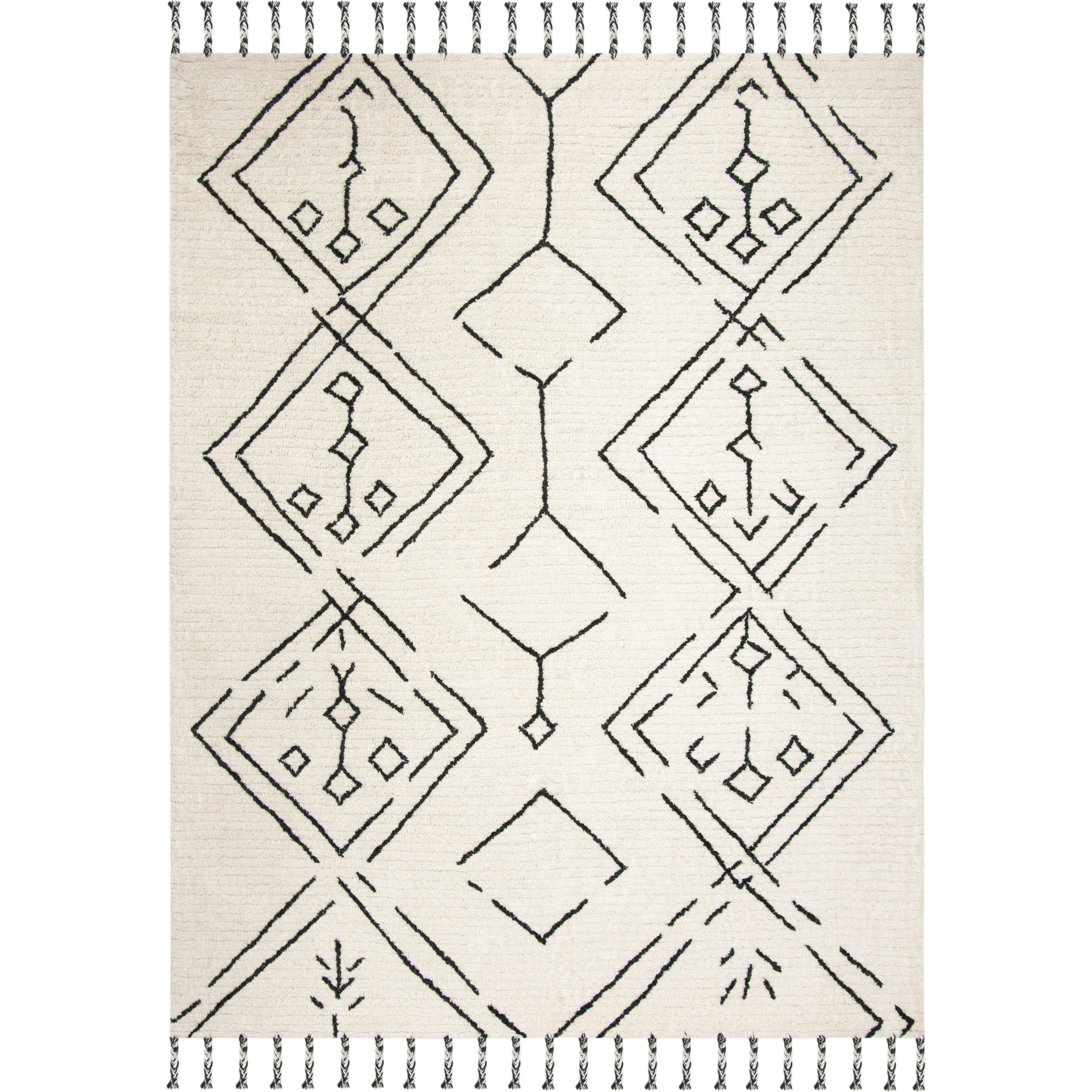 Casablanca CSB201Z Ivory Black rug, a stunning addition to any modern home. Inspired by the minimalistic designs of Moroccan Beni Ourain rugs, this piece from Safavieh's Casablanca Collection beautifully reinterprets classic mosaic patterns. The rug features a serene combination of navy and ivory geometrics set against a washed blue shag pile, creating a soft and rustic touch perfect for metropolitan-modern interiors.