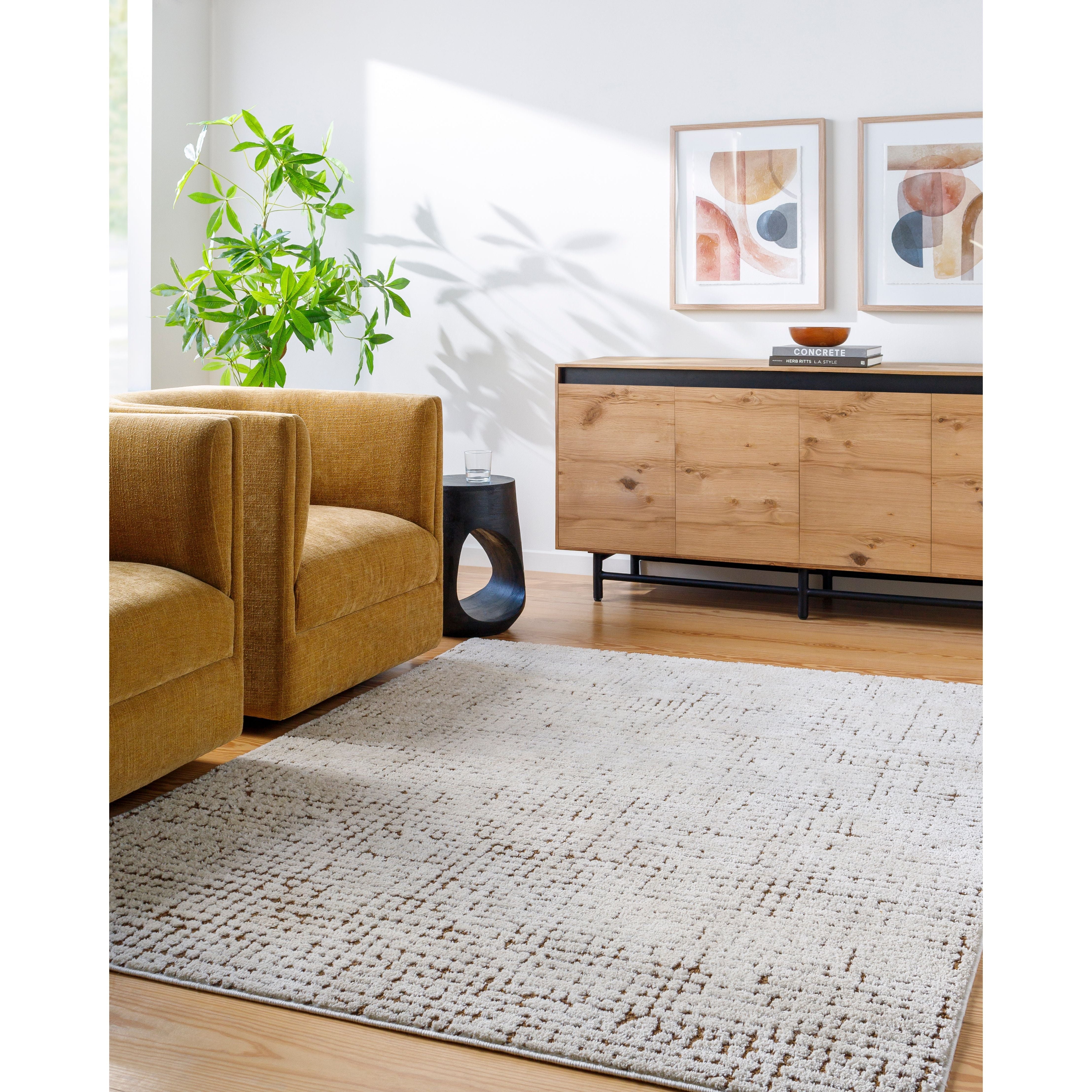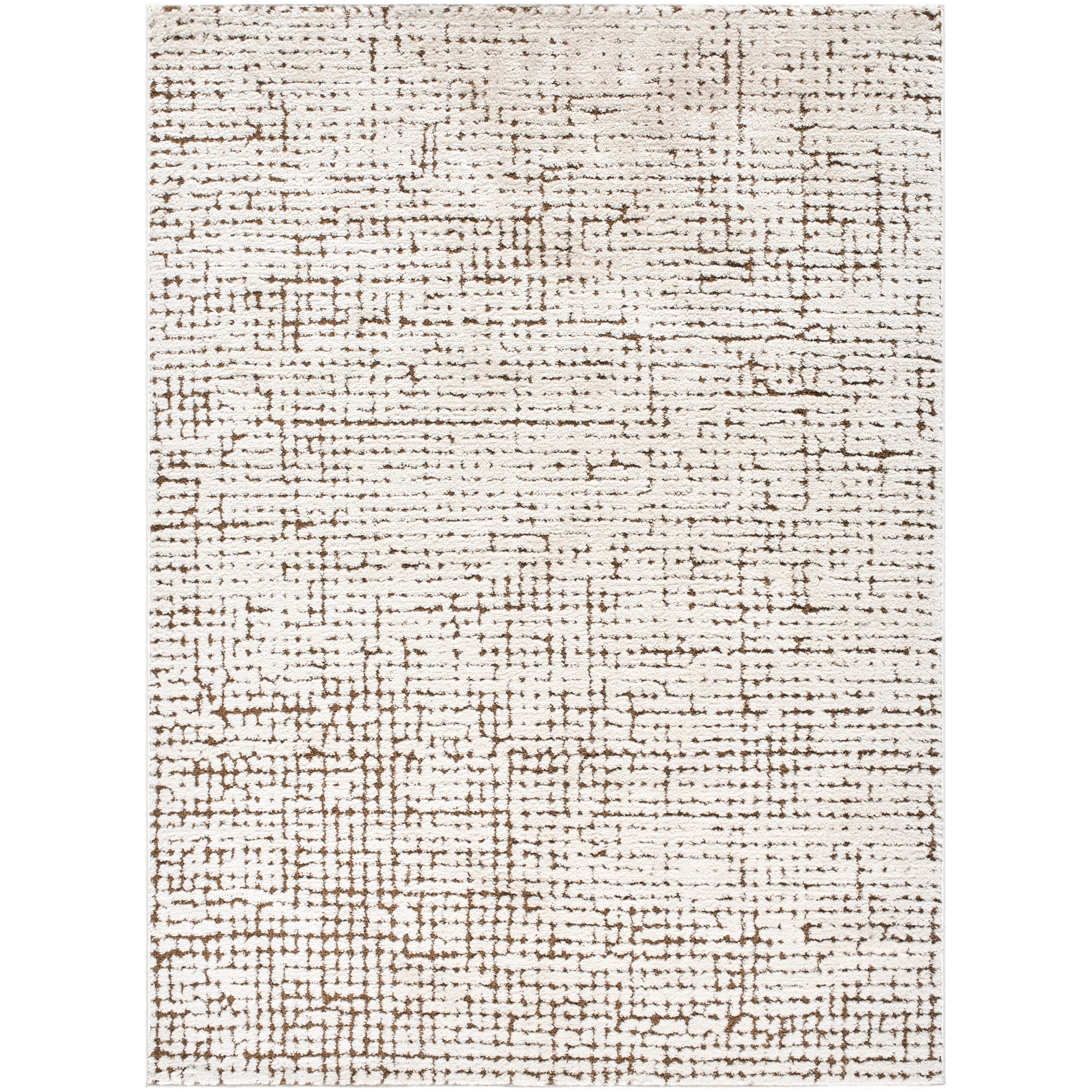 Introducing the Cascade area rug, a unique creation from the collaborative minds at PNW Home x Livabliss. This machine-woven piece hails from Turkey and displays an intriguing minimalist modern style. Its design features a neutral off-white base interrupted by an irregular earthy brown grid pattern, which effortlessly adds texture and interest to any room. Made from high pile polyester, this rug offers delightful high-low texture underfoot and ensures durability for long-lasting beauty in your home. To maintain its aesthetic appeal, we recommend spot cleaning with mild detergent as needed. For optimum comfort and to prevent slippage, using this piece with a rug pad is advised.