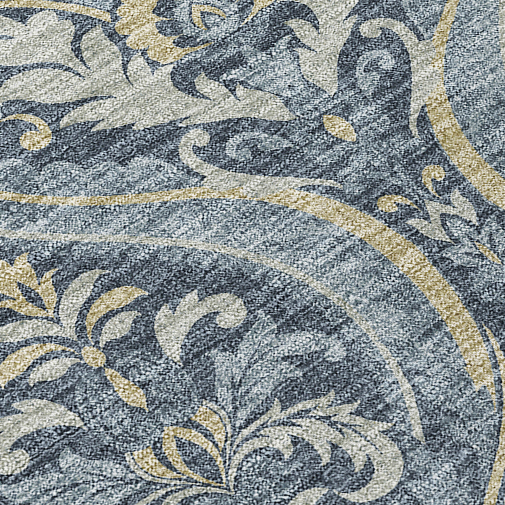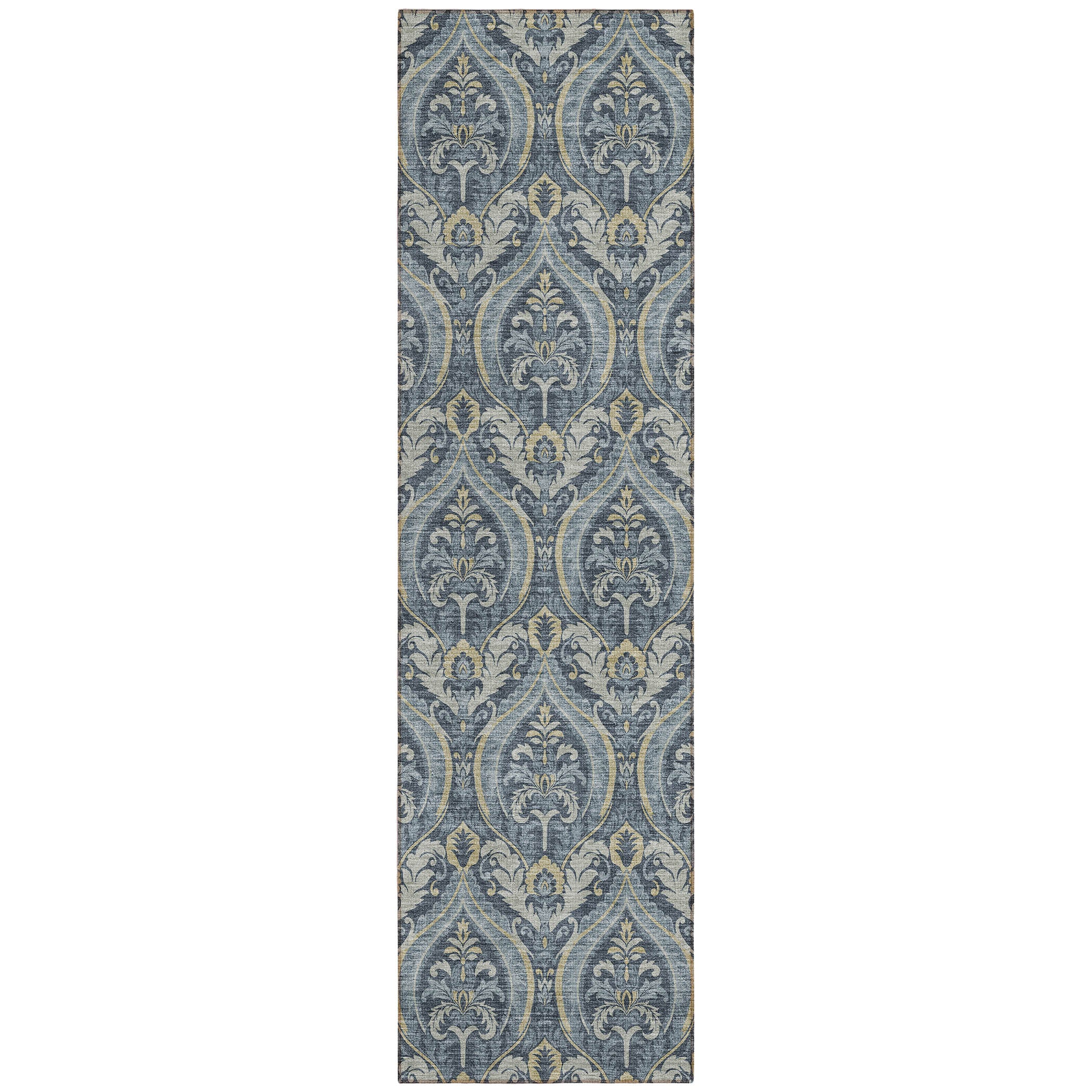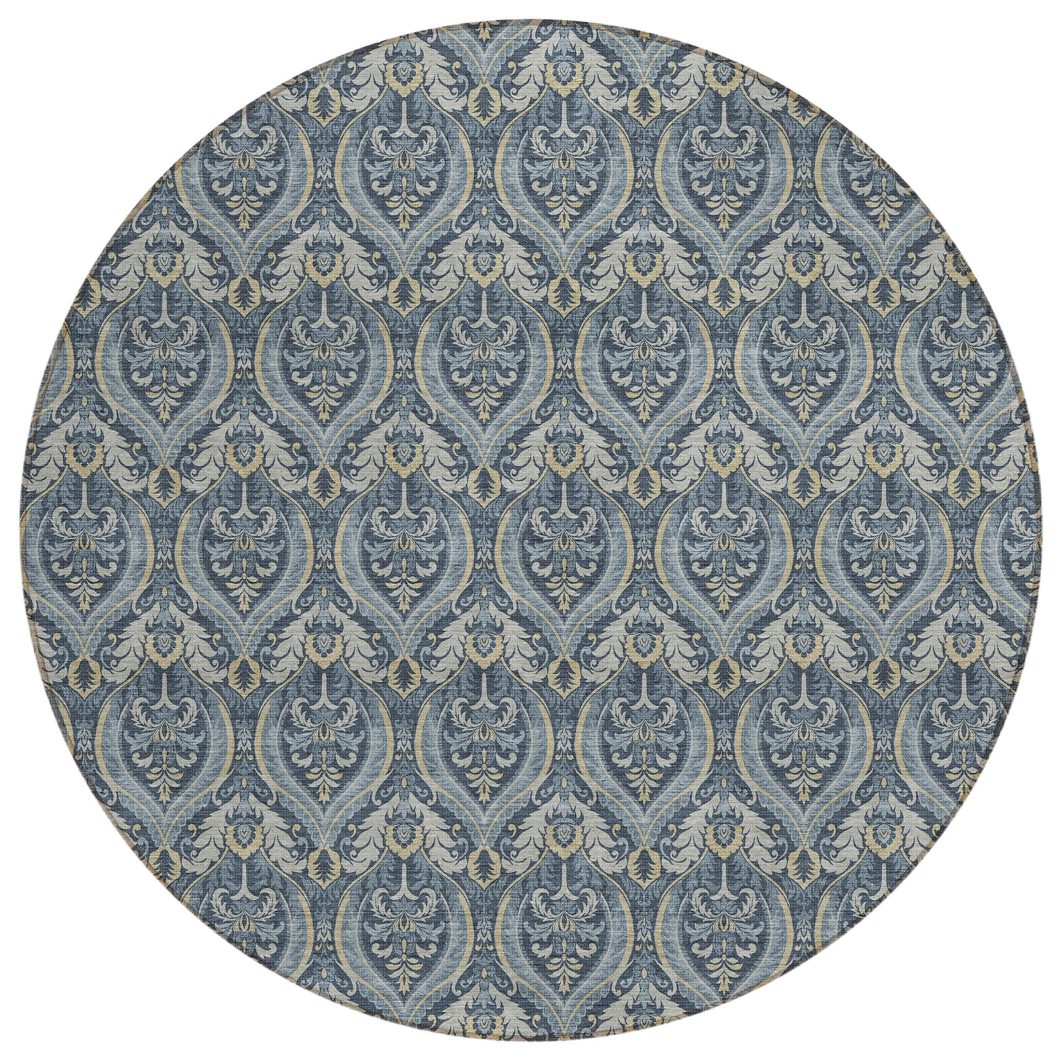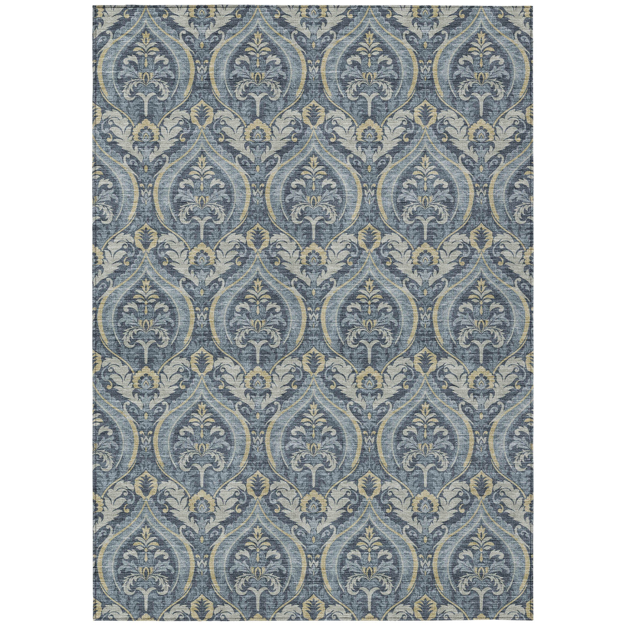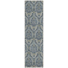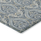 luxurious Chantille ACN572 Blue area rug, designed to elevate the ambiance of any space. Immerse yourself in the opulence of this rug adorned with formal damask-like motifs arranged in a uniform pattern. The transitional panel design effortlessly blends classic elegance with contemporary flair.