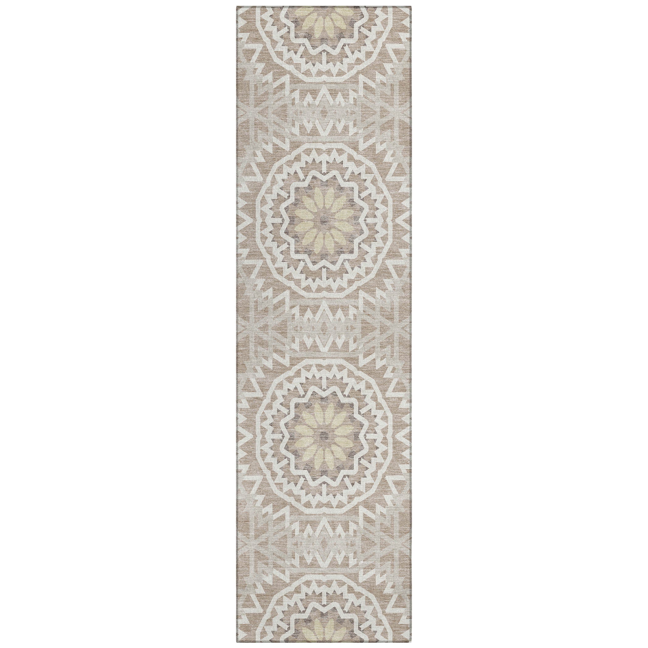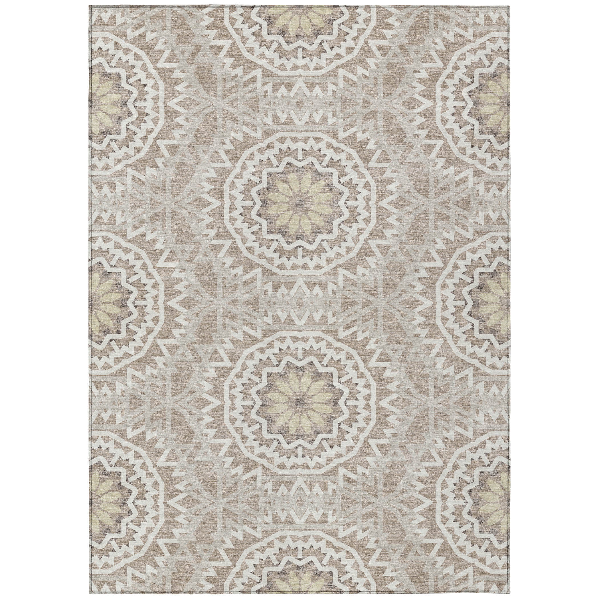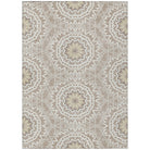 Chantille ACN619 Taupe rug, a perfect blend of elegance and functionality for your living space. Inspired by the captivating beauty of stained glass, this transitional rug showcases interlocking medallion circles that create a harmonious focal point in any room.