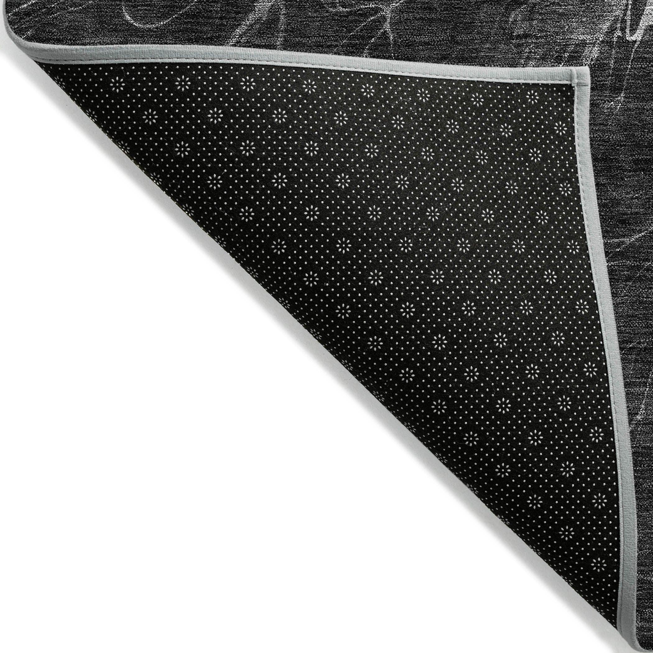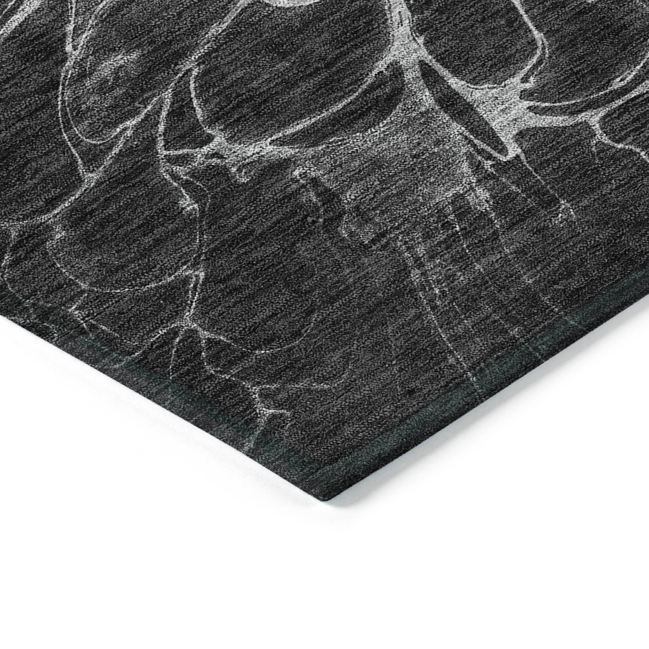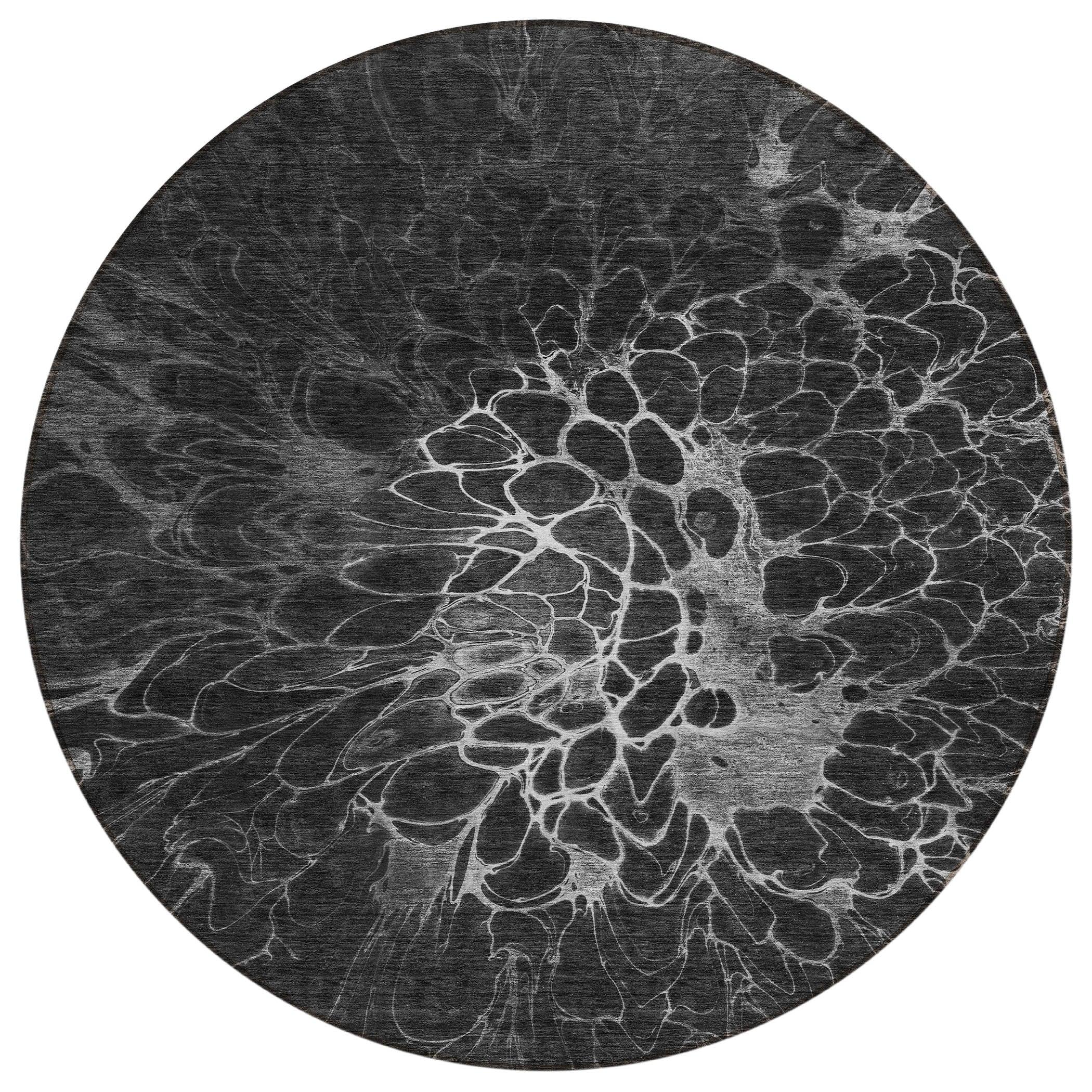 Chantille ACN652 Charcoal rug, where modern style meets practical functionality. This unique design features merging cells at the center, reminiscent of intricate spider webs, adding a touch of elegance to any space. Its transitional aesthetic effortlessly complements contemporary decor trends.