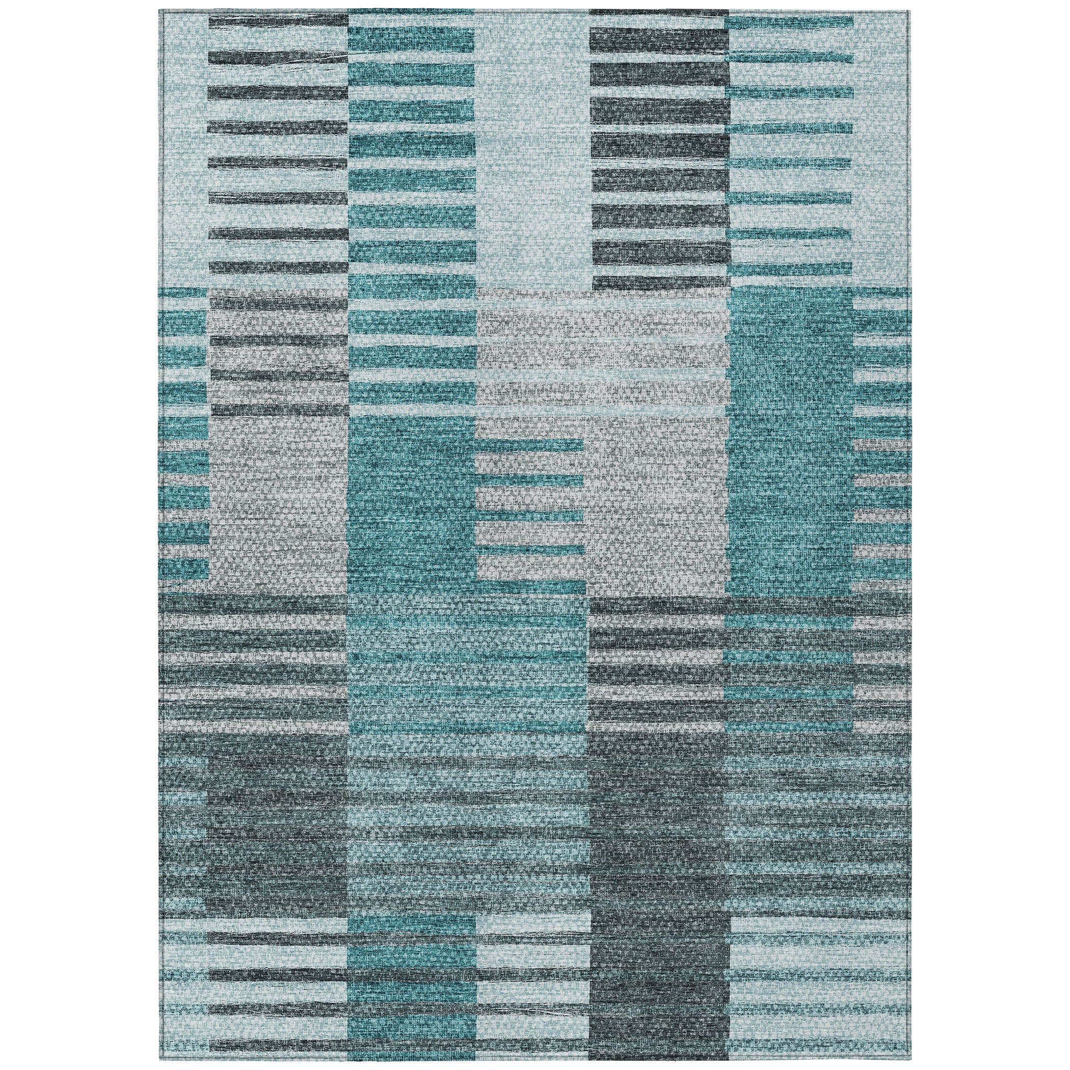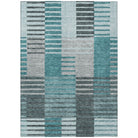 Chantille ACN687 Teal rug, a captivating addition to your home decor. This rug features a unique design with broken horizontal bars flowing seamlessly in beautiful color shades, blending transitional and striped patterns effortlessly. Its versatility makes it a perfect fit for any space, whether indoors or outdoors, thanks to its UV stabilization.