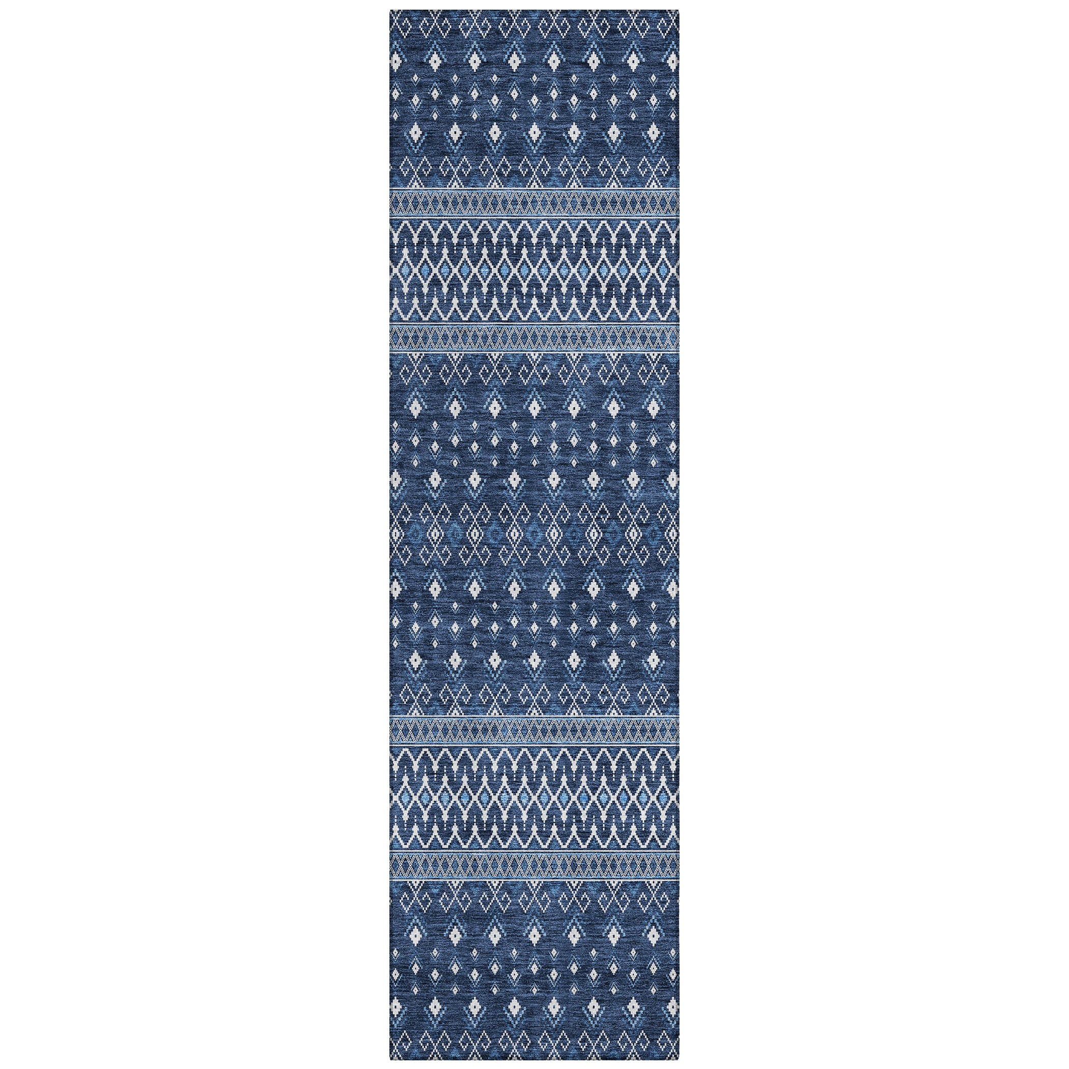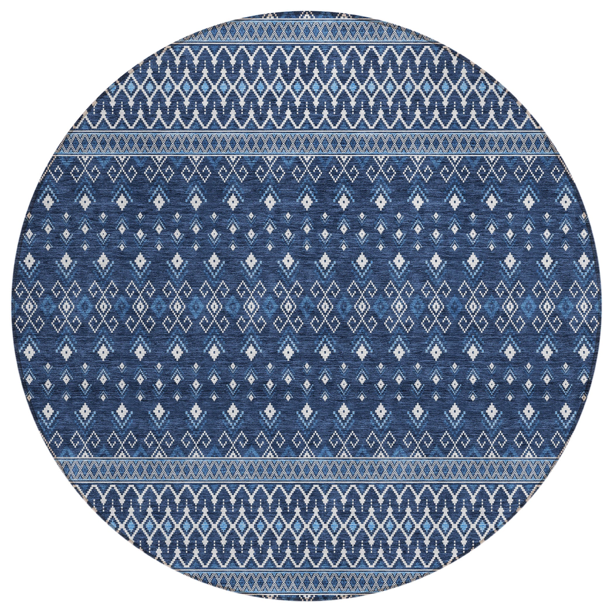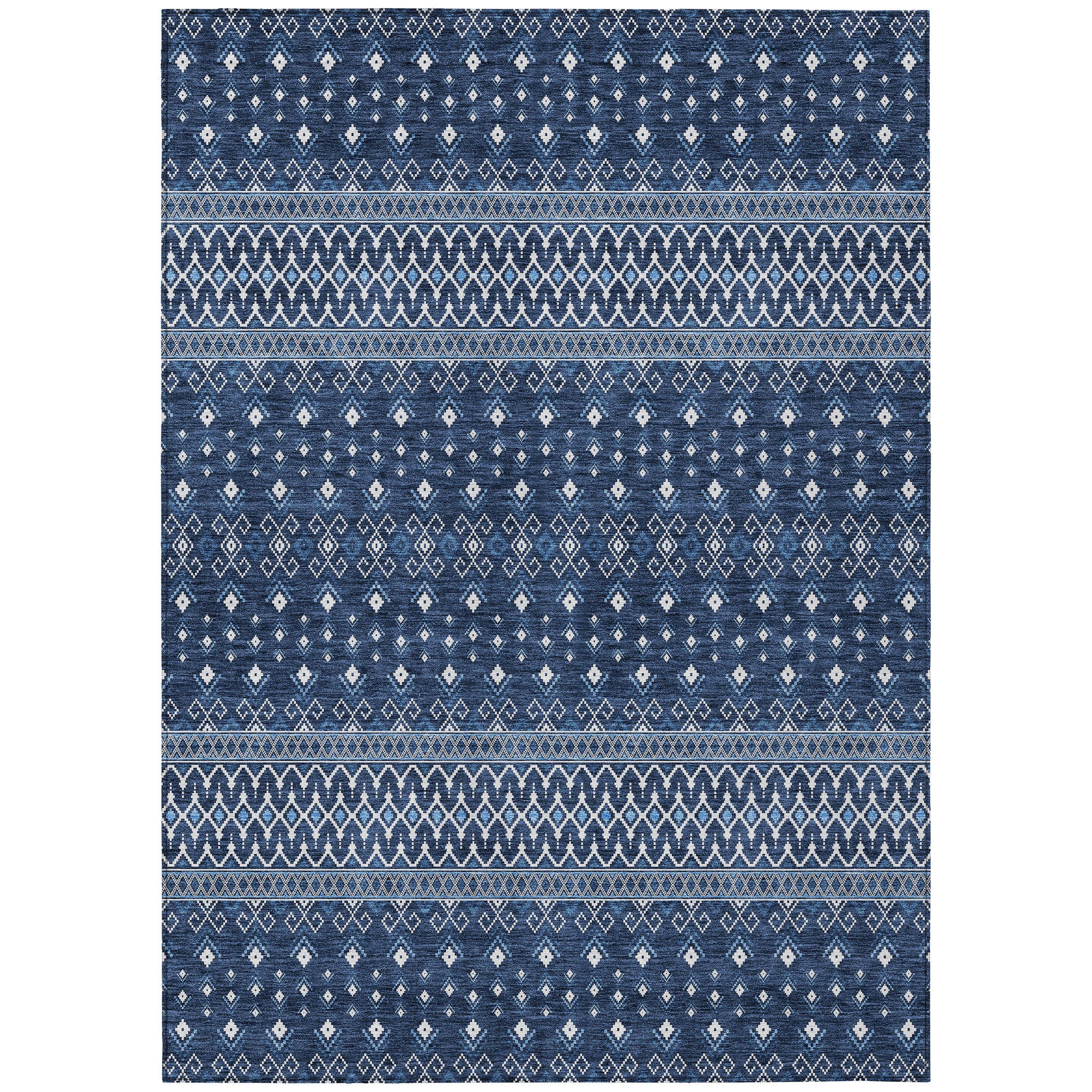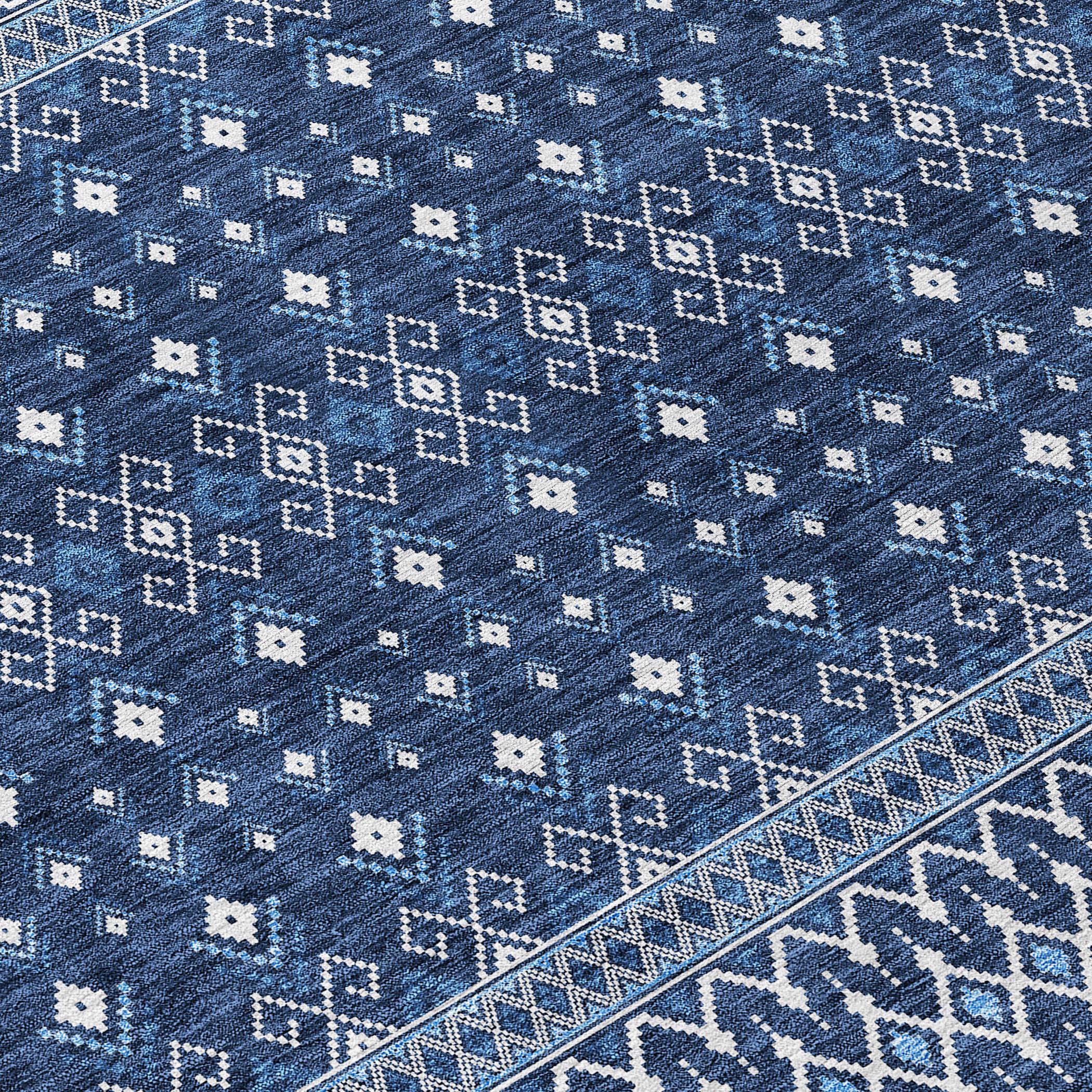 Chantille ACN708 Navy rug, a stunning piece that embodies the essence of boho chic design. Featuring delicate diamond patterns, this rug effortlessly combines transitional elegance with bohemian flair, creating a visually captivating focal point for any space.