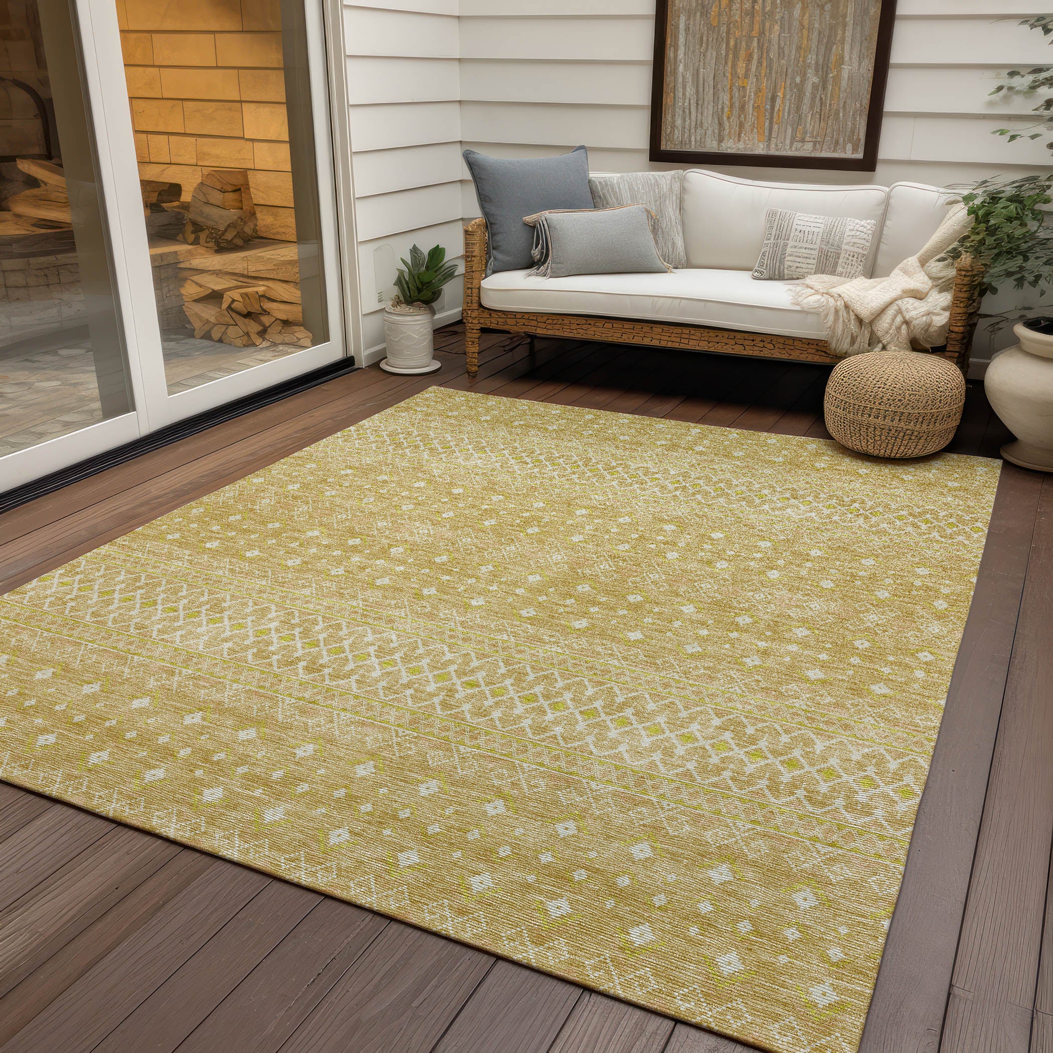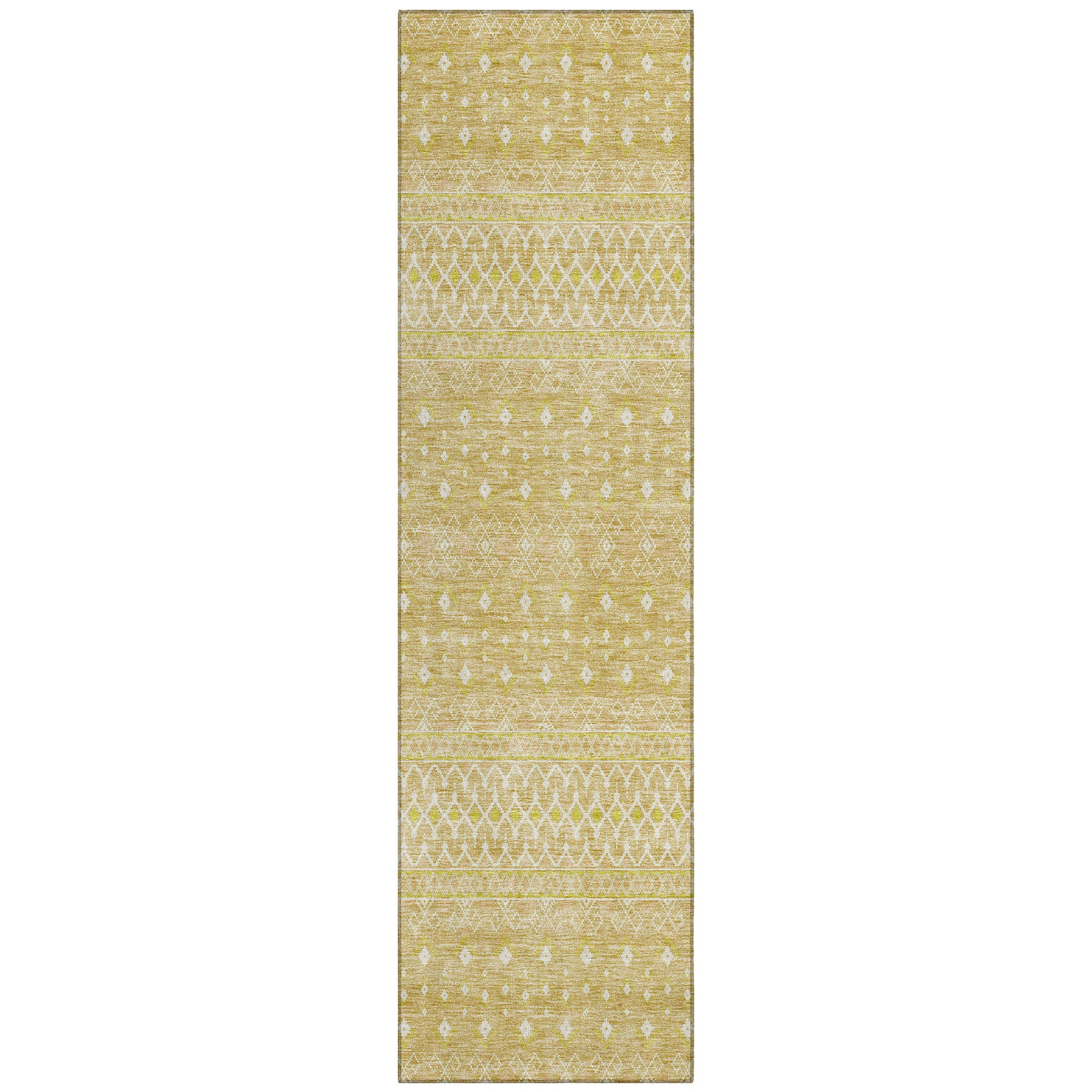 Chantille ACN709 Gold rug, a stunning blend of bohemian charm and timeless transitional style. This rug features intricate diamond patterns that capture the essence of boho chic, adding a touch of elegance to any space. Crafted with UV-protected fabric, it is perfect for indoor lounges or outdoor terraces, ensuring its beauty lasts for years to come.