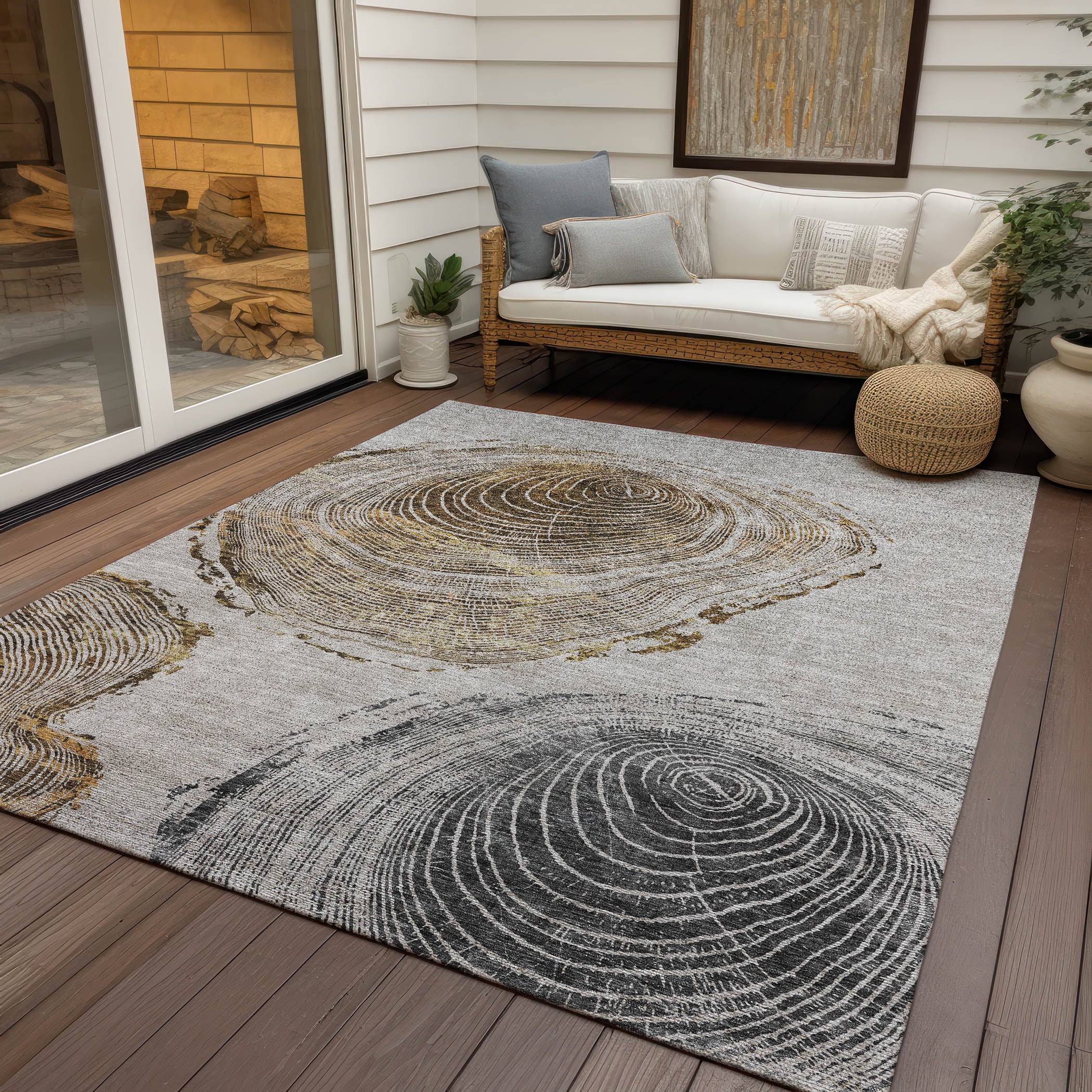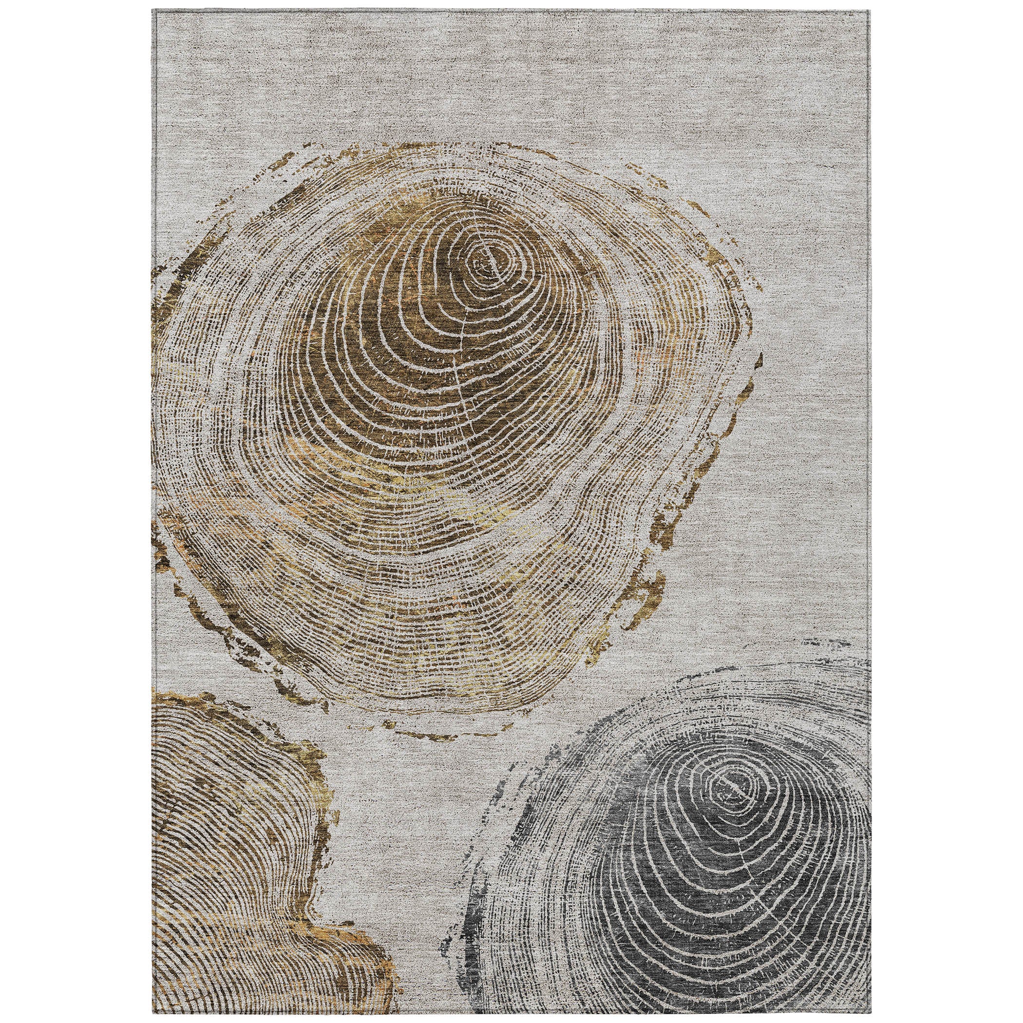Chantille ACN713 Taupe rug, a stunning piece that brings the raw beauty of nature into your home. This unique rug features three wood-sliced patterns that create an organic ambiance, blending seamlessly with both transitional and organic styles.