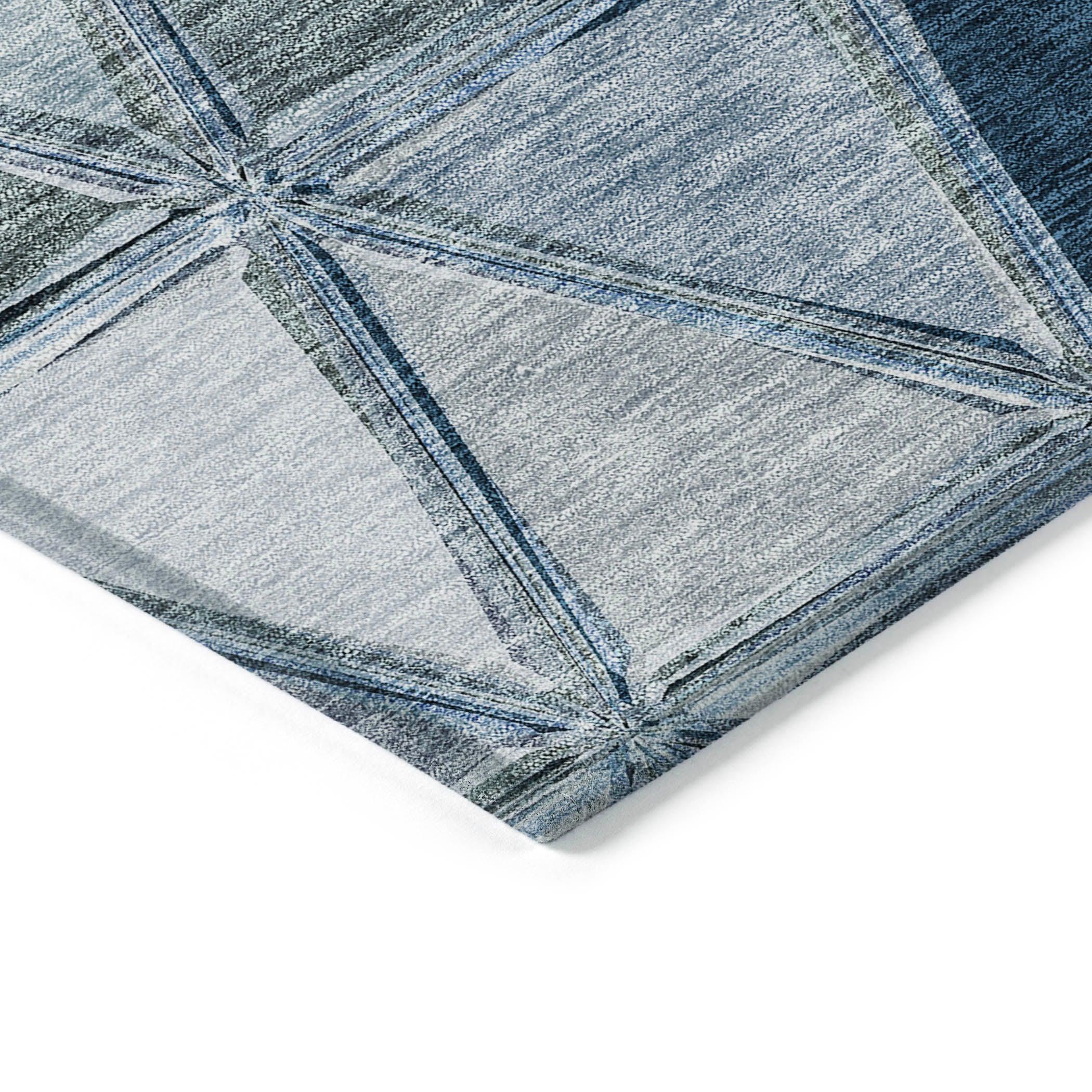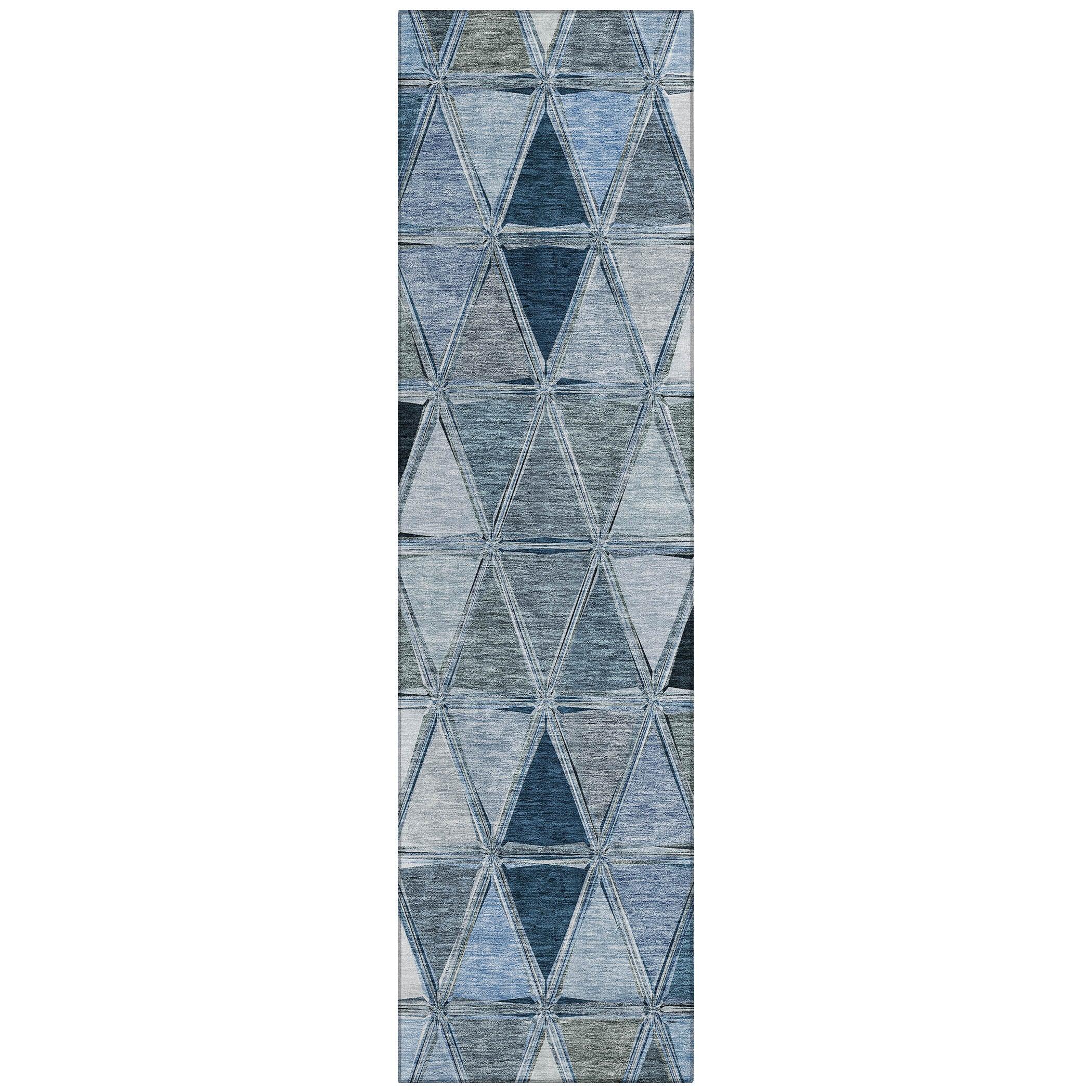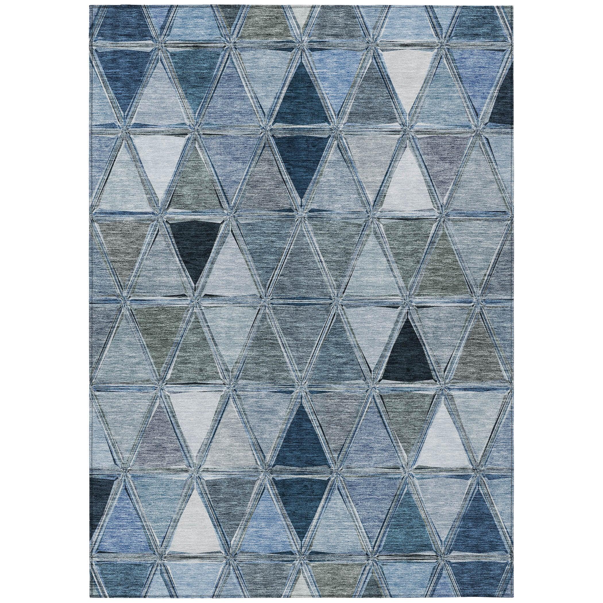 Chantille ACN722 Blue rug - a stunning piece that brings geometric elegance to any space. Featuring a unique triangle motif arranged in horizontal bars, this rug adds a touch of transitional charm to your decor.