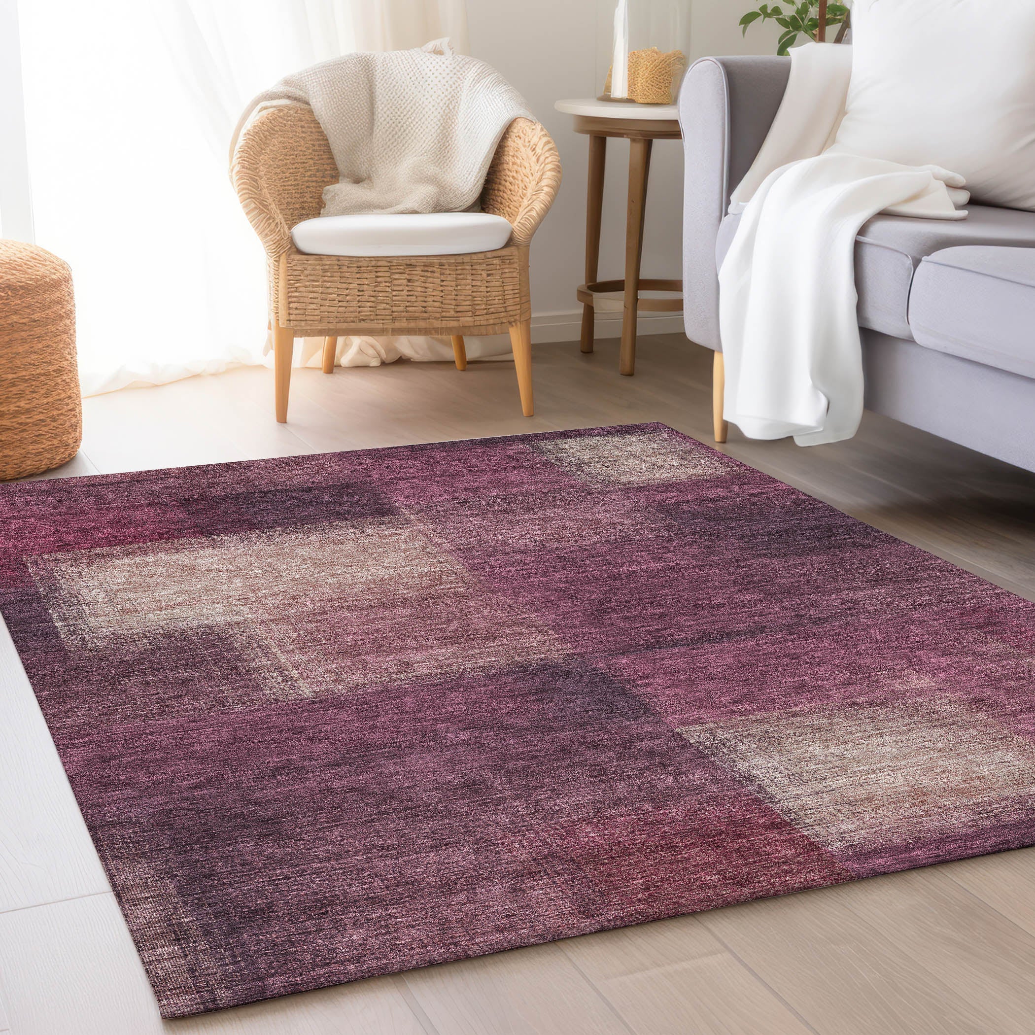 Chantille ACN742 Plum rug, a charming addition to your home decor. This rug features a lovely patchwork design with soft-toned squares, blending transitional style with a warm, inviting ambiance. The subtle square pattern brings a touch of sophistication, making it a versatile choice for any room in your home.