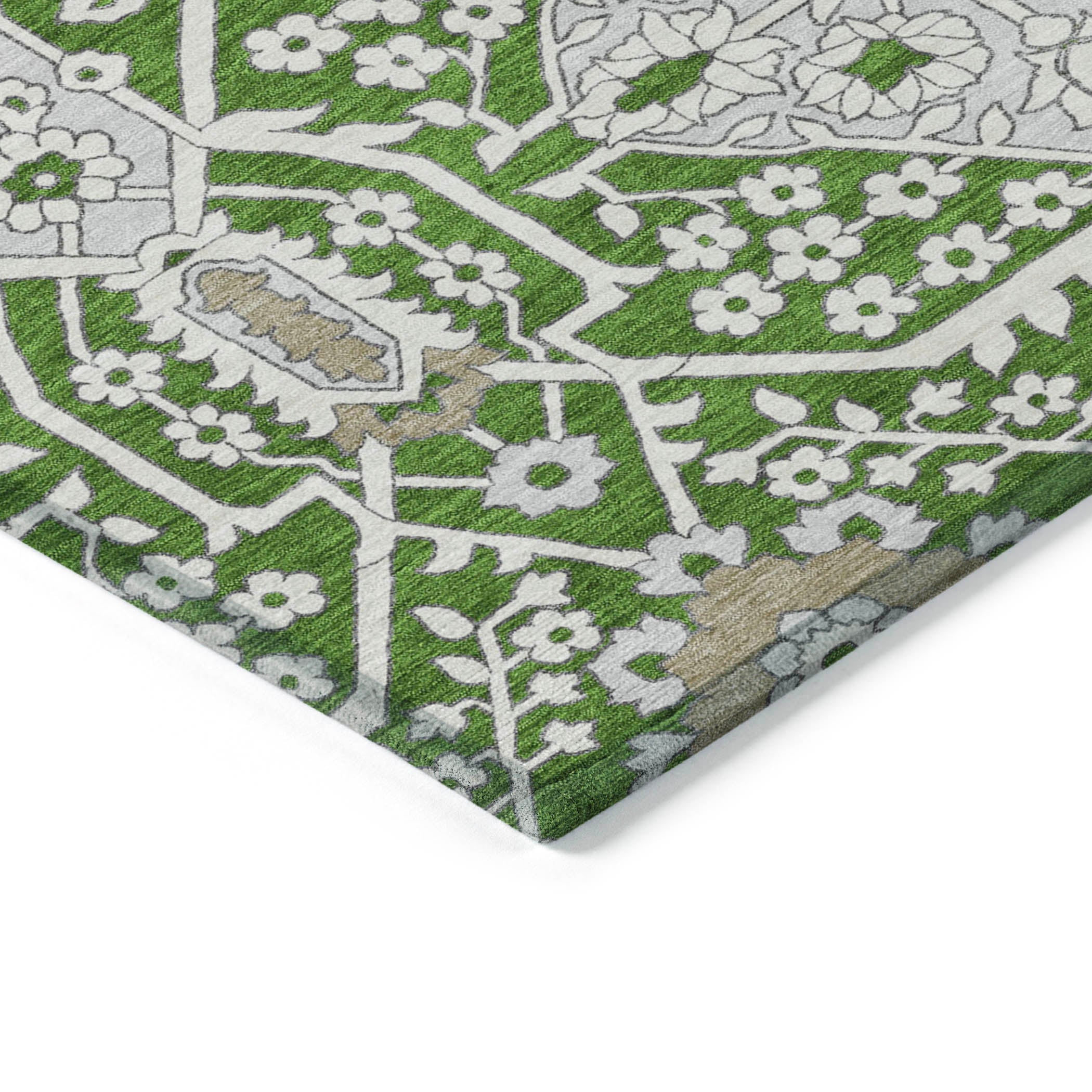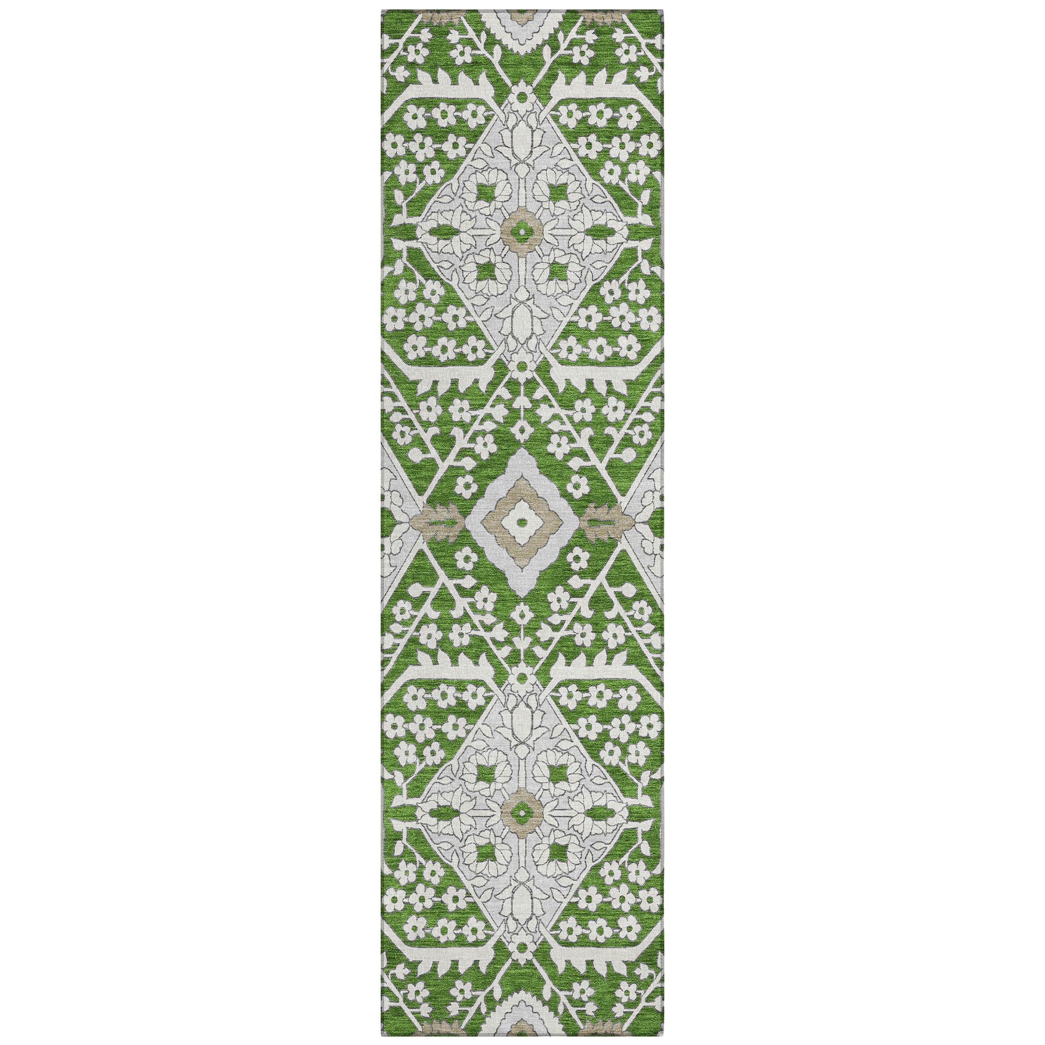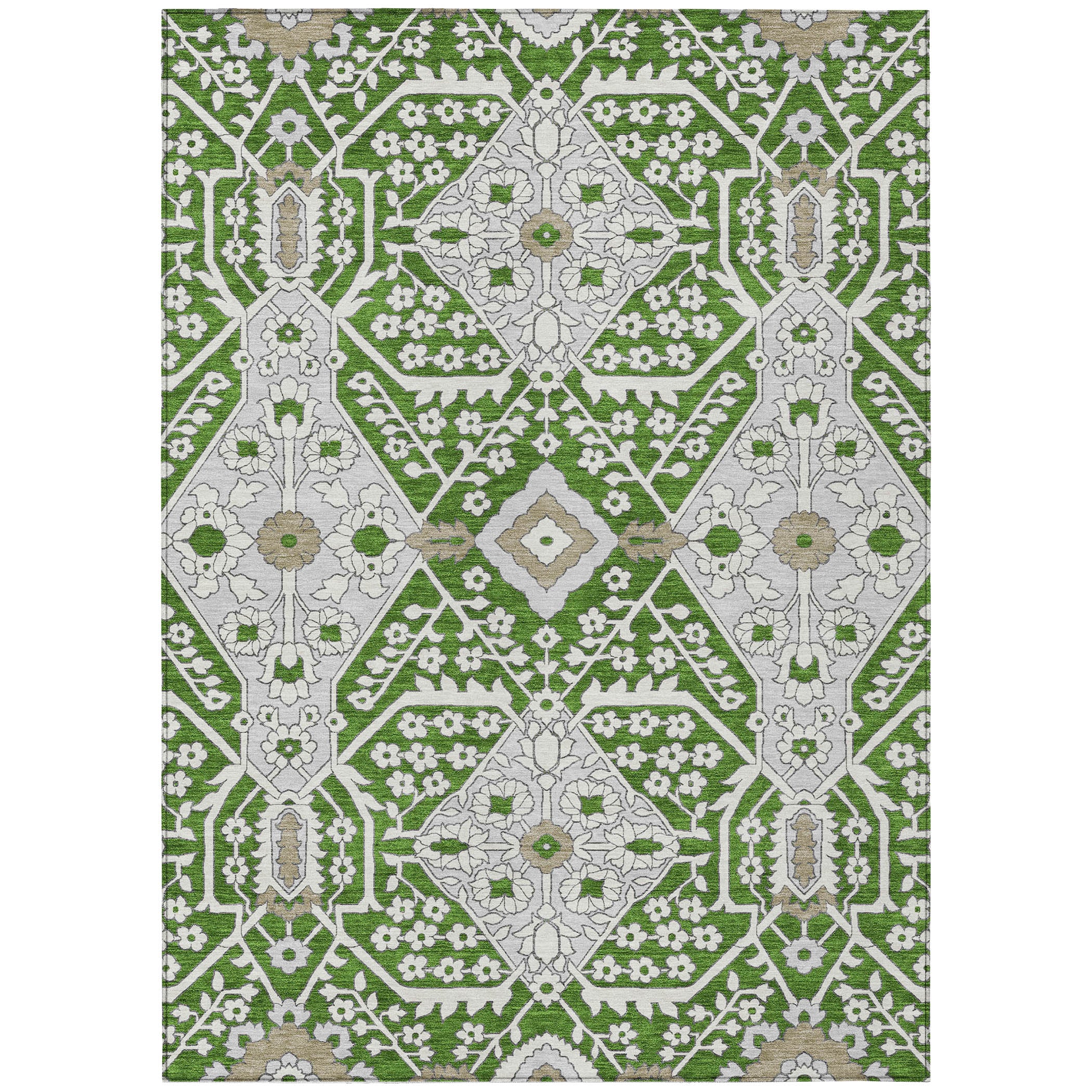 Chantille ACN863 Green area rug, a perfect blend of tradition and contemporary style. This rug features a modern Agra pattern with oversized diamonds that will elevate the decor of any room. Crafted with UV stabilization, it offers versatility and durability to withstand daily use. The ultra-thin construction makes it easy to place in any space, while the machine-washable fabric ensures hassle-free maintenance.