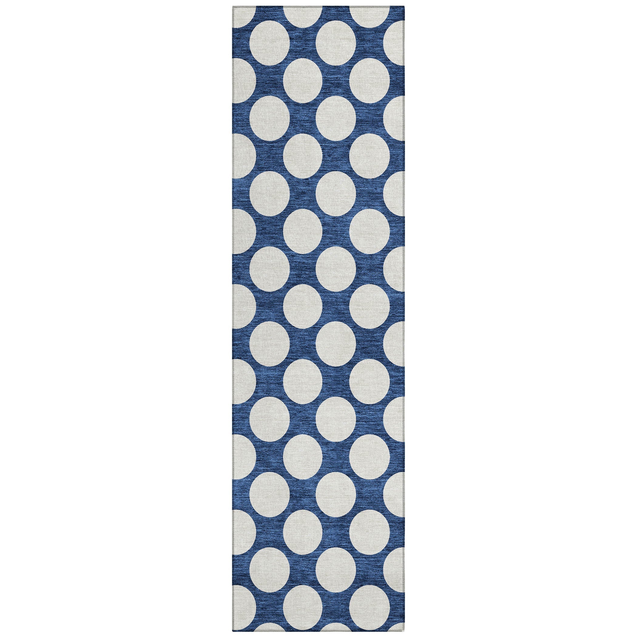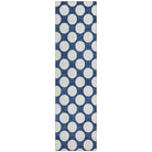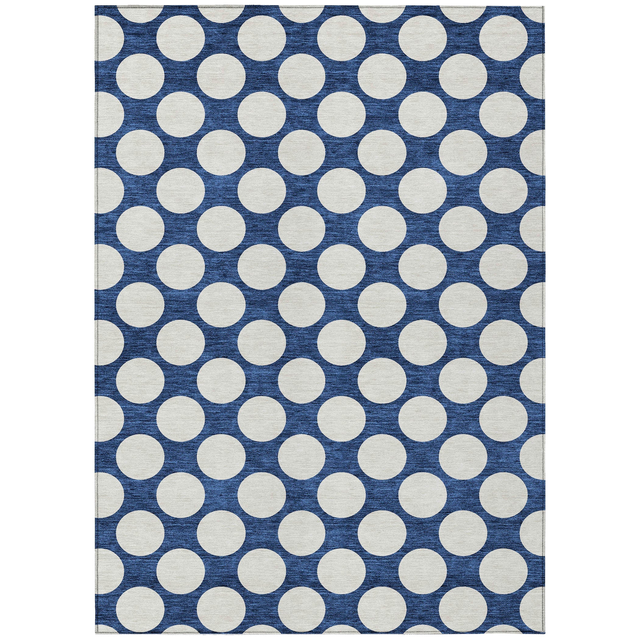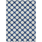 Chantille ACN921 Navy area rug, a stylish addition to any space. This rug features medium-sized circles arranged in a classic polka dot pattern, adding a touch of playfulness and elegance to your decor. Whether you place it indoors or outdoors, its transitional design seamlessly fits any setting.