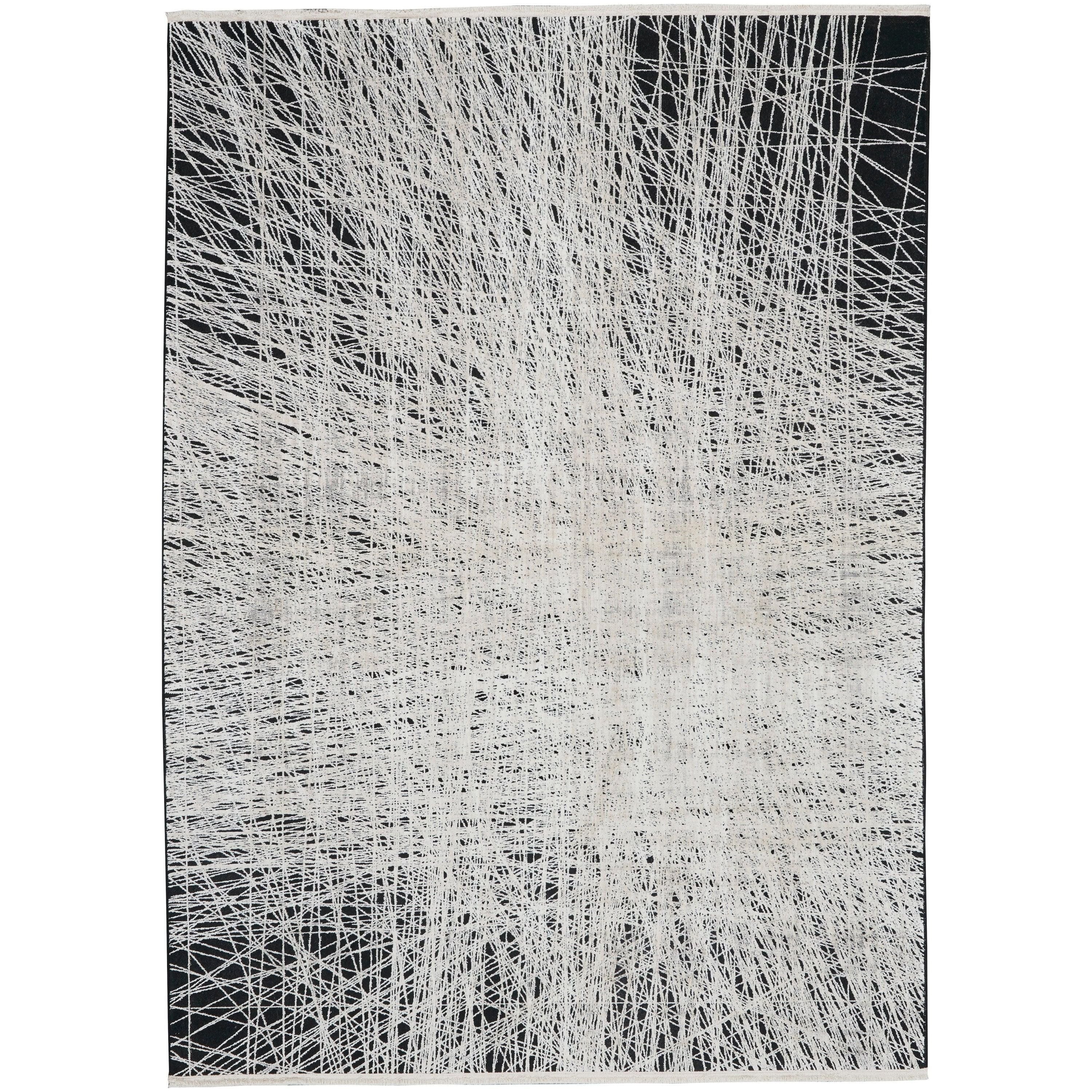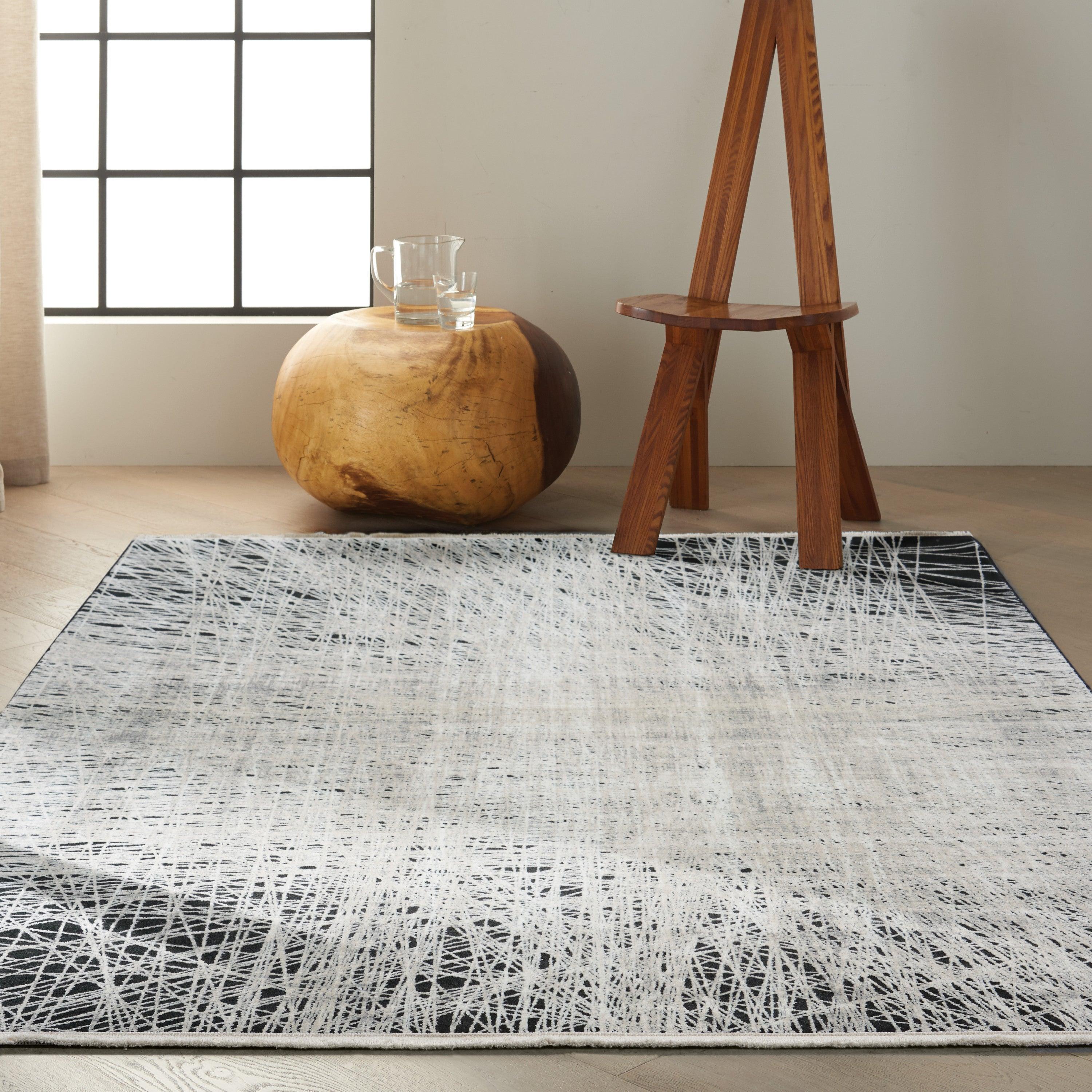 CK50 Balian and CK55 Black Silver area rugs from CALVIN KLEIN's innovative Balian Collection. Using captivating trompe l’oeil designs, these rugs offer a sense of depth and dimension that instantly enlivens any space. The loom-woven construction of these low-pile rugs showcases intricate carved details, elegantly fringed edges, and a luxurious silk-like sheen.