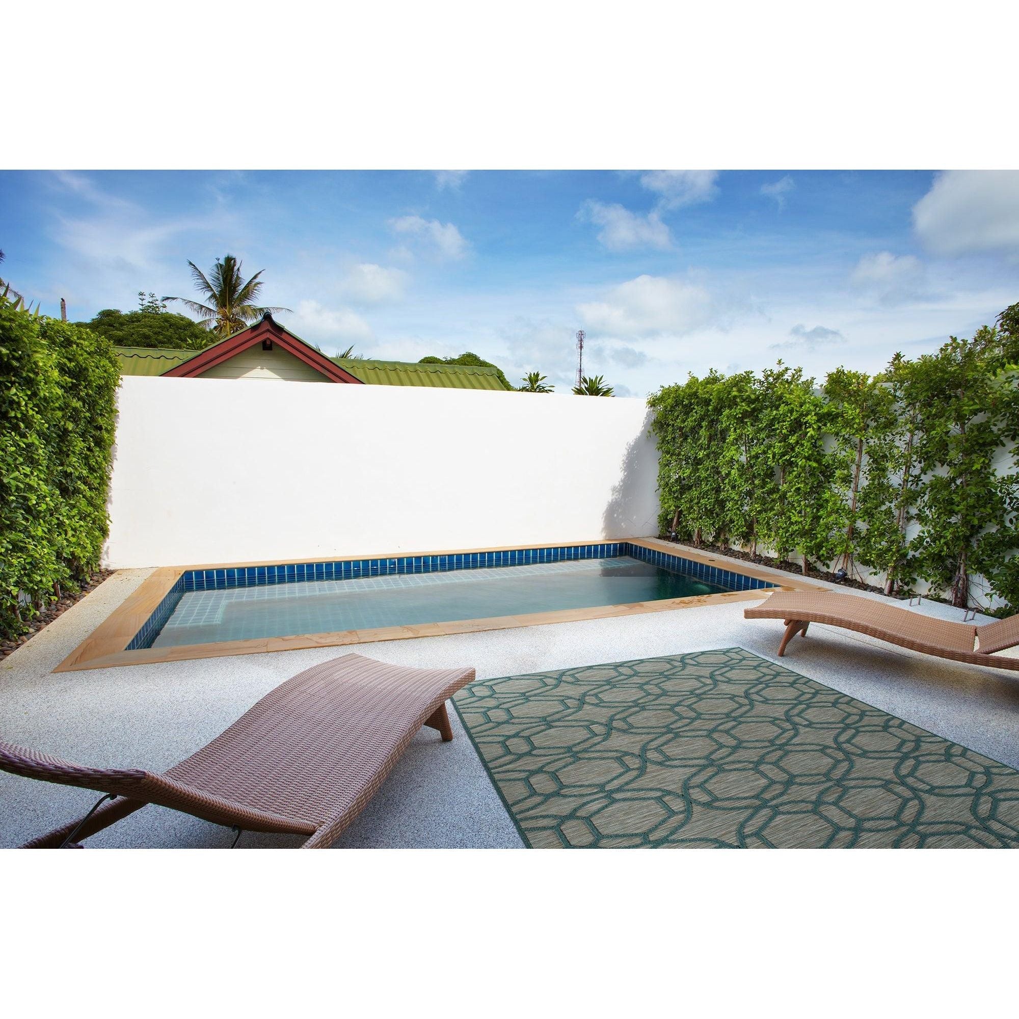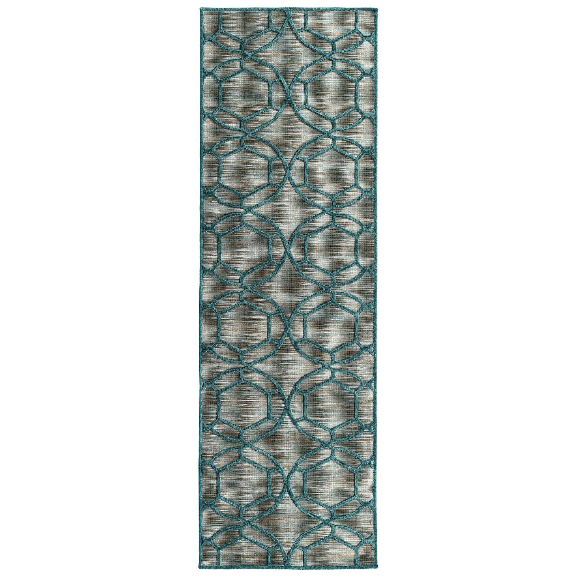 Cove COV05 91 Teal rug from our captivating Cove collection. Inspired by the beauty of Tahiti, this rug features simple yet engaging geometric designs in a variety of nature-inspired vibrant colors. Crafted in Turkey using 100% Polypropylene, the Cove COV05 91 Teal rug is ideal for outdoor spaces, bringing a touch of elegance to your patio or deck.
