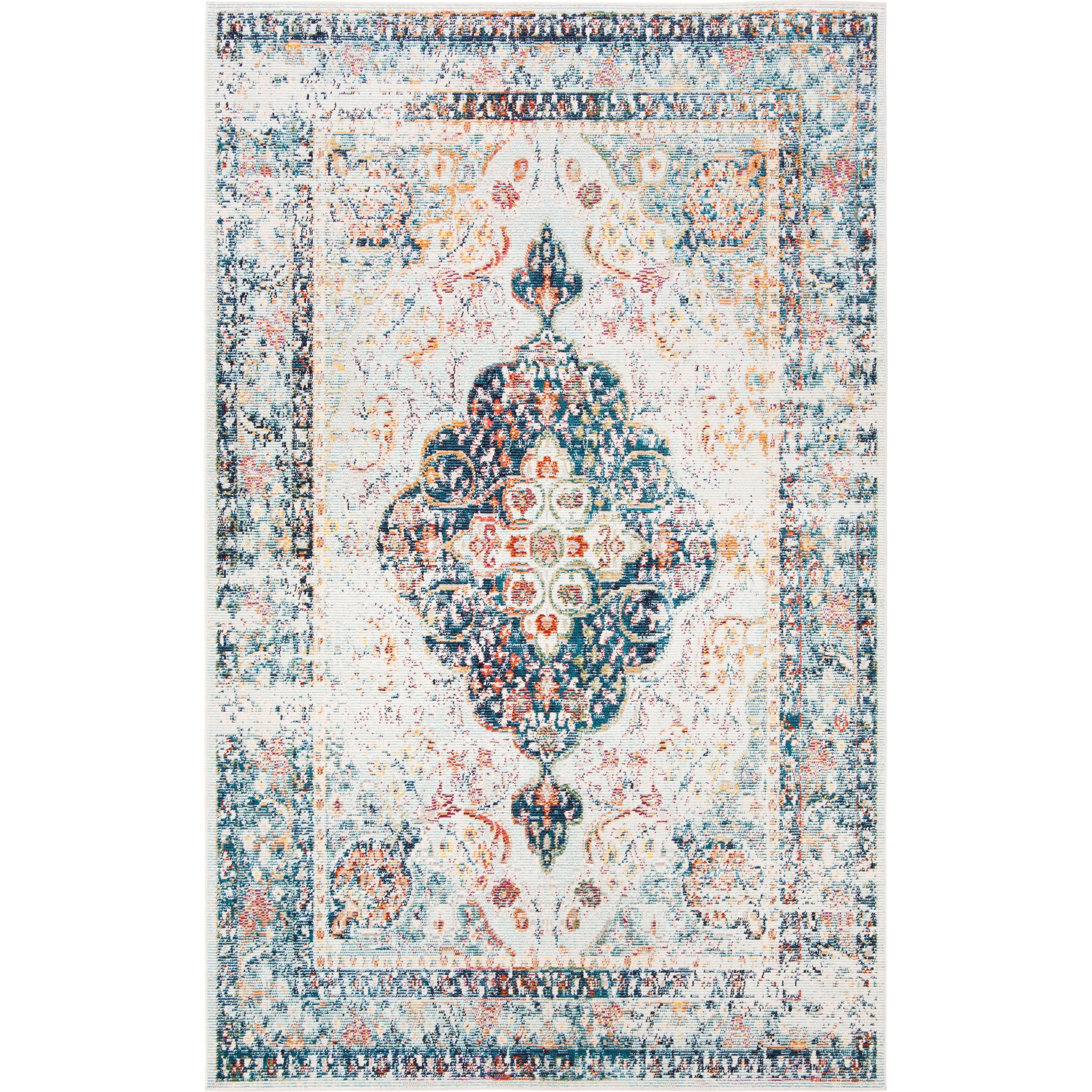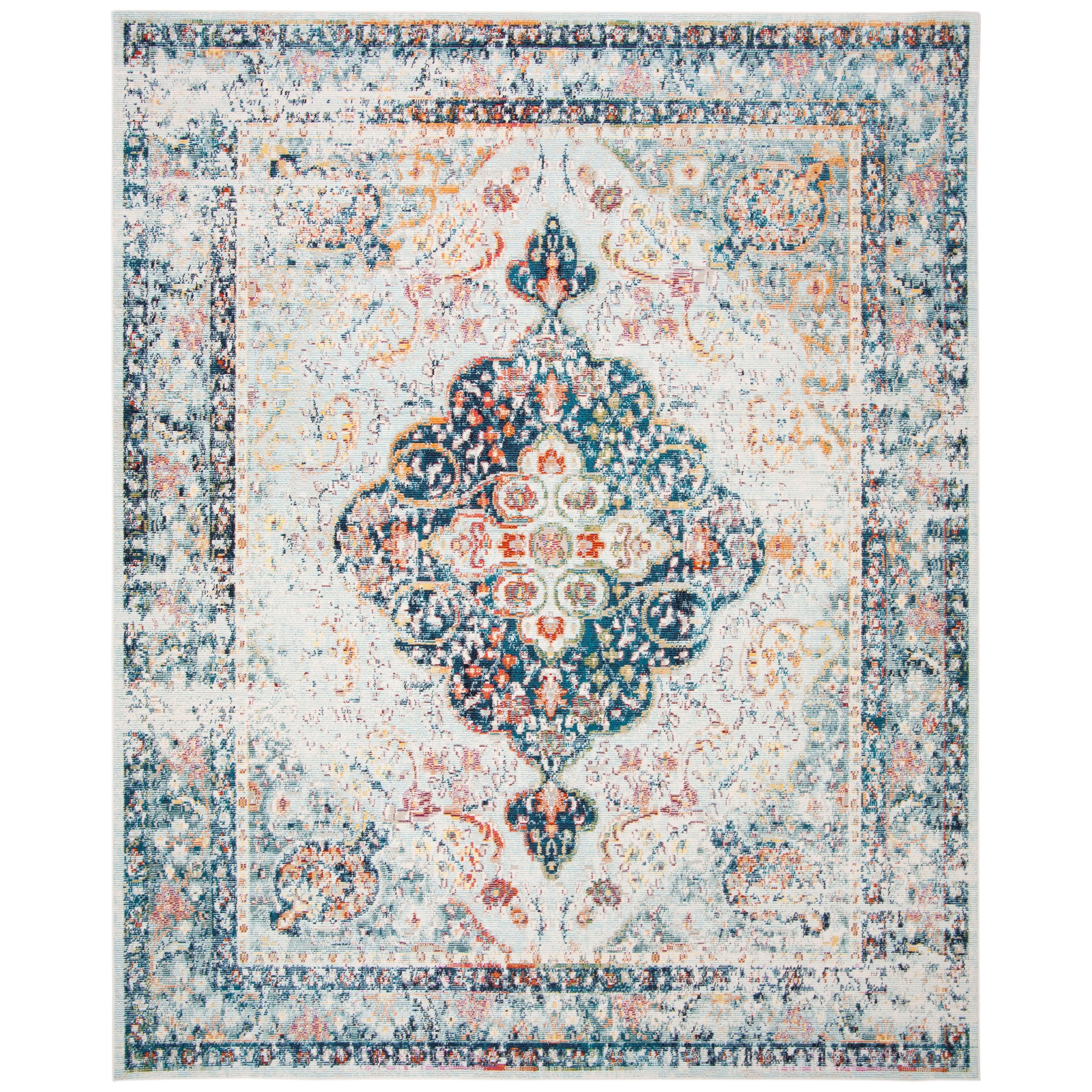 Crystal CRS523H Blue Ivory rug from Safavieh's Crystal Collection, designed to enhance creativity and style in any space. This distressed bohemian rug features timeless oriental motifs with a modern twist, perfect for those seeking a trendy yet classic look. Crafted from durable polypropylene fibers, this rug is not only easy to care for but also vibrant and colorful.