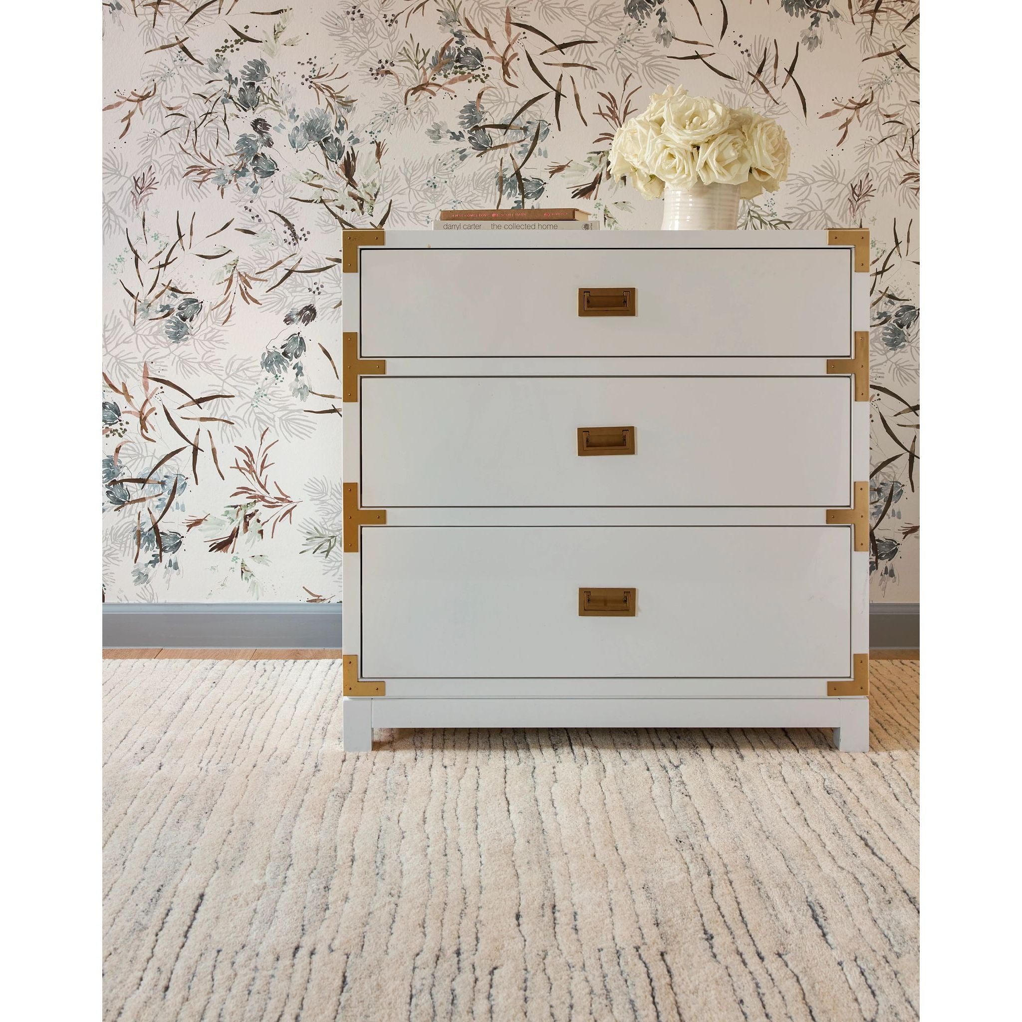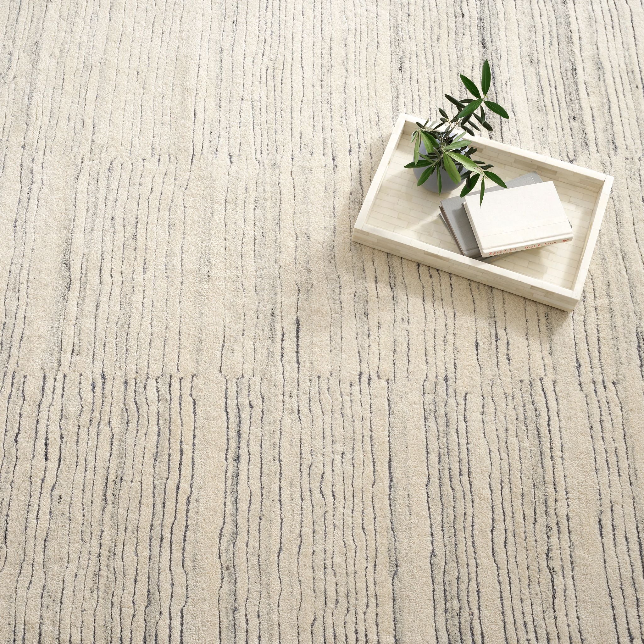 Inspired by substrate layers of sandstone sediments that chronicle the millennia, this luxurious, irregularly striped wool rug will stand the test of time. The subtle degradations of a natural undyed fleece pile enhance the finely observed irregular striping in a softly mineral palette. The subtle beauty of the higher sheared tufts emphasizes the contrast of the densely looped stripes. A signature motif of Marie Flanigan, an award-winning interior designer. This luxurious wool rug is a part of our design collaboration with Marie to produce a lifestyle collection that reflects her signature style of timeless elegance and innovative simplicity.