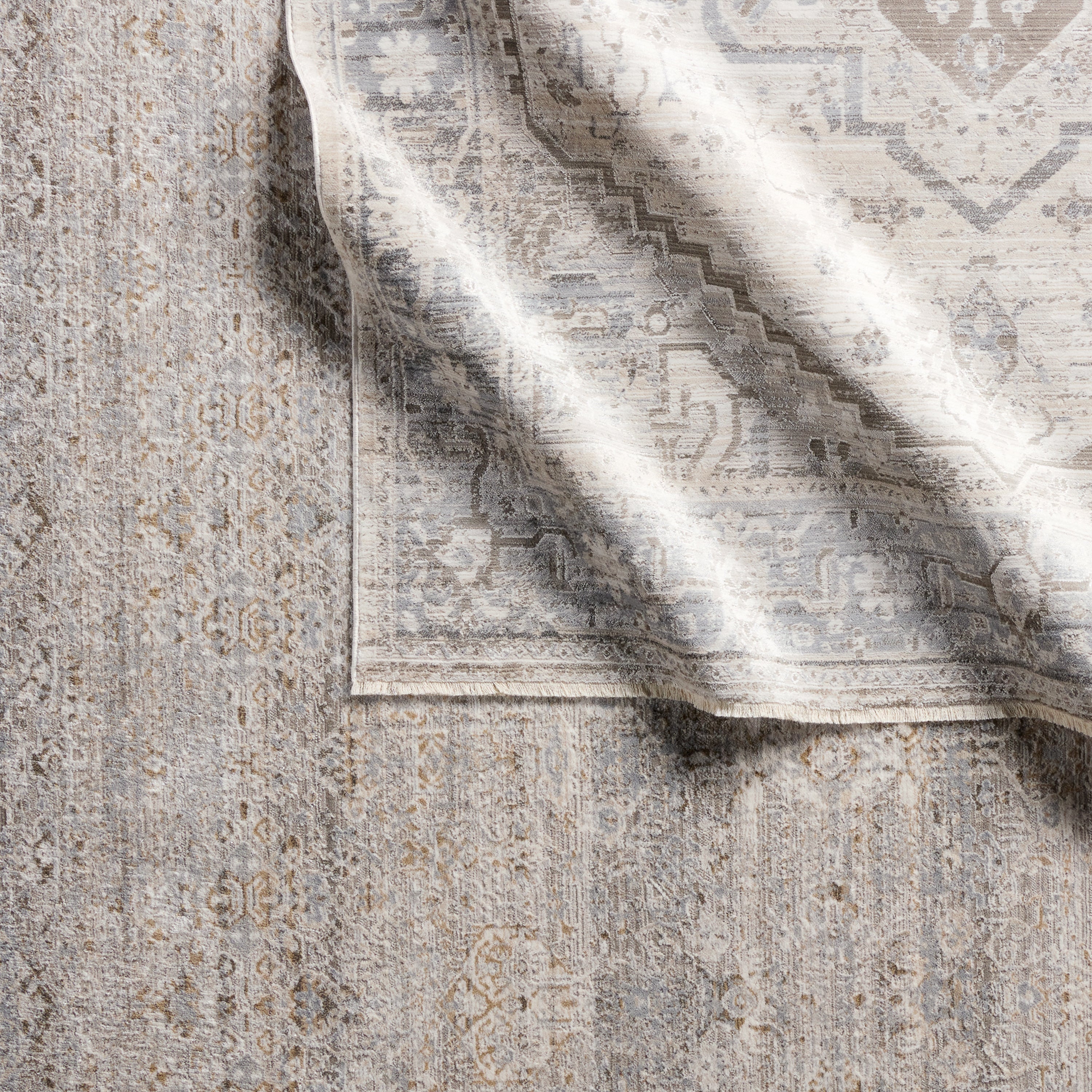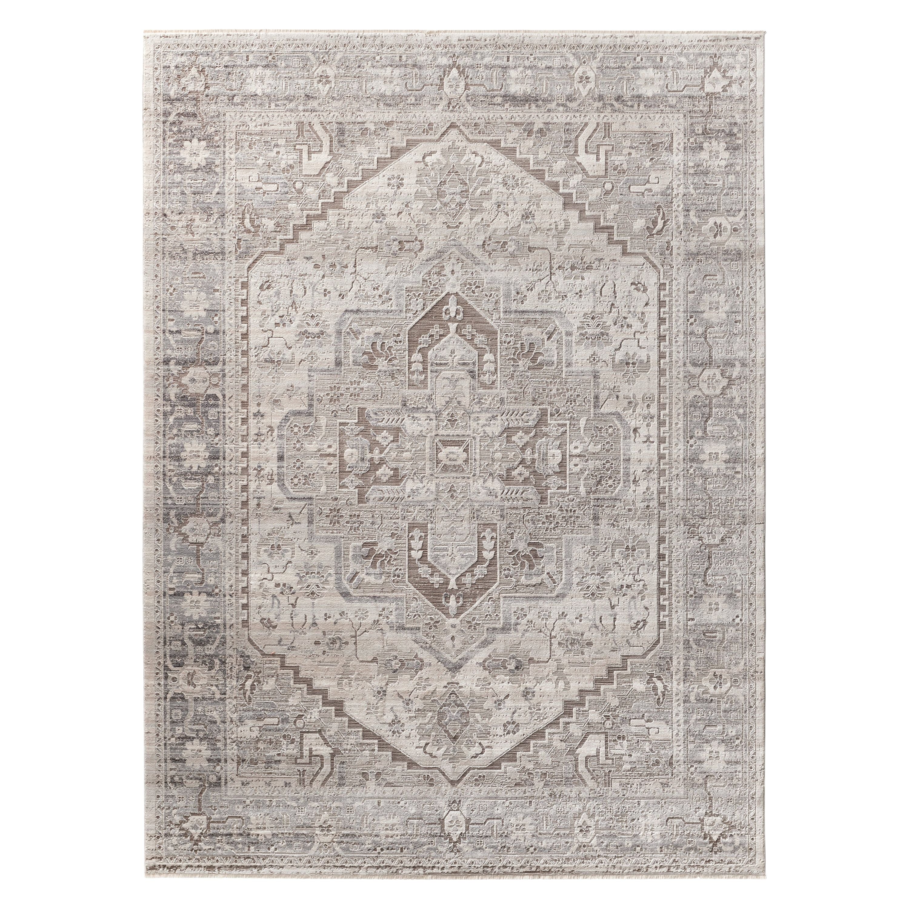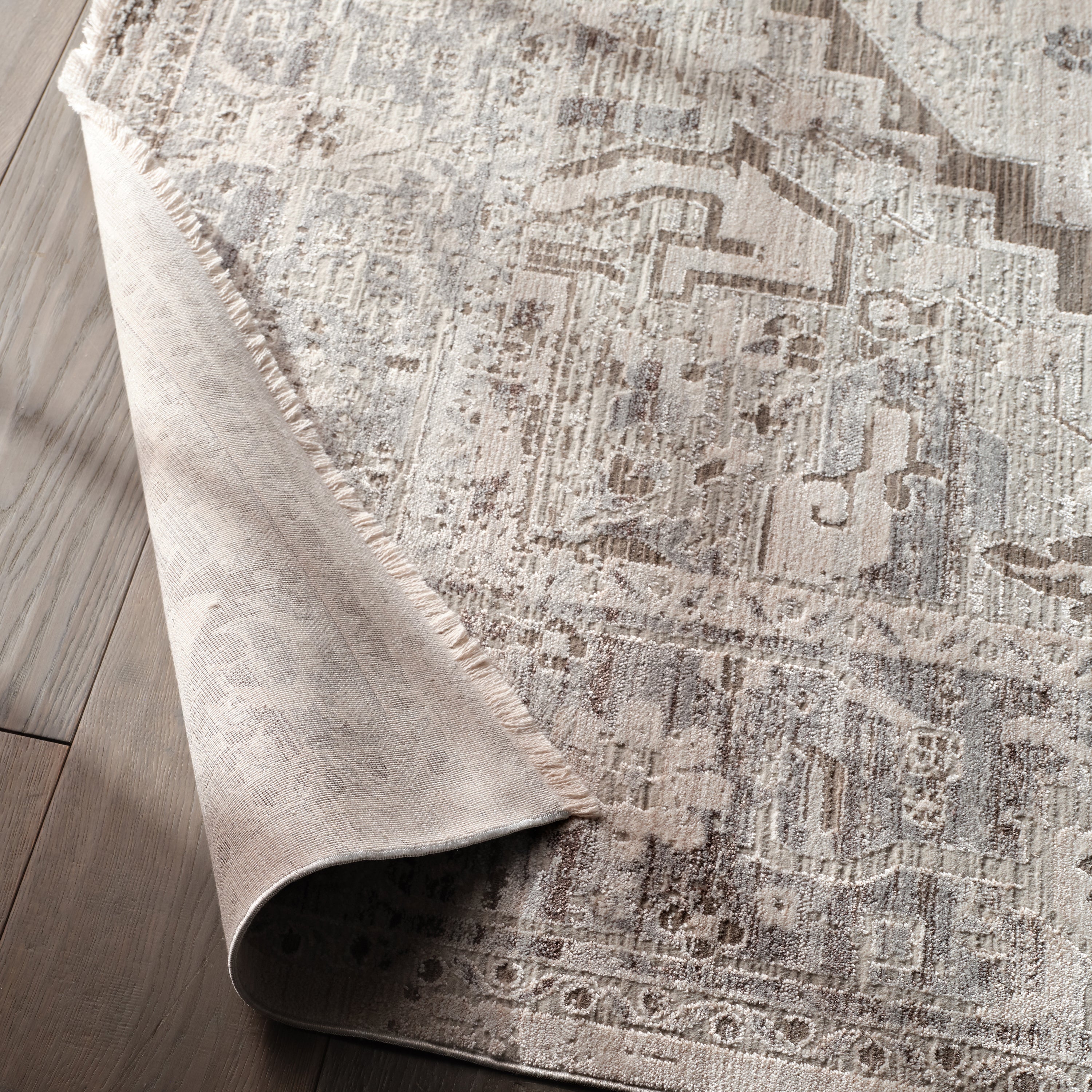 The stunning En Blanc collection captures the elegance of neutral, vintage-inspired patterns and melds Old World aesthetics with an updated and luxurious vibe. The Venn rug boasts an ornate center medallion motif in tonal hues of taupe, silver, and cream. Soft and lustrous, this chameleon-like design emulates the timeless style of a Turkish hand-knotted rug, but in an accessible polyester and viscose power-loomed quality.