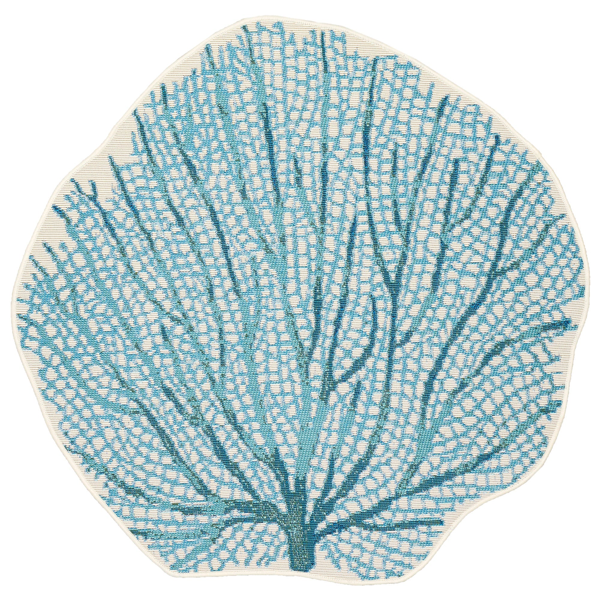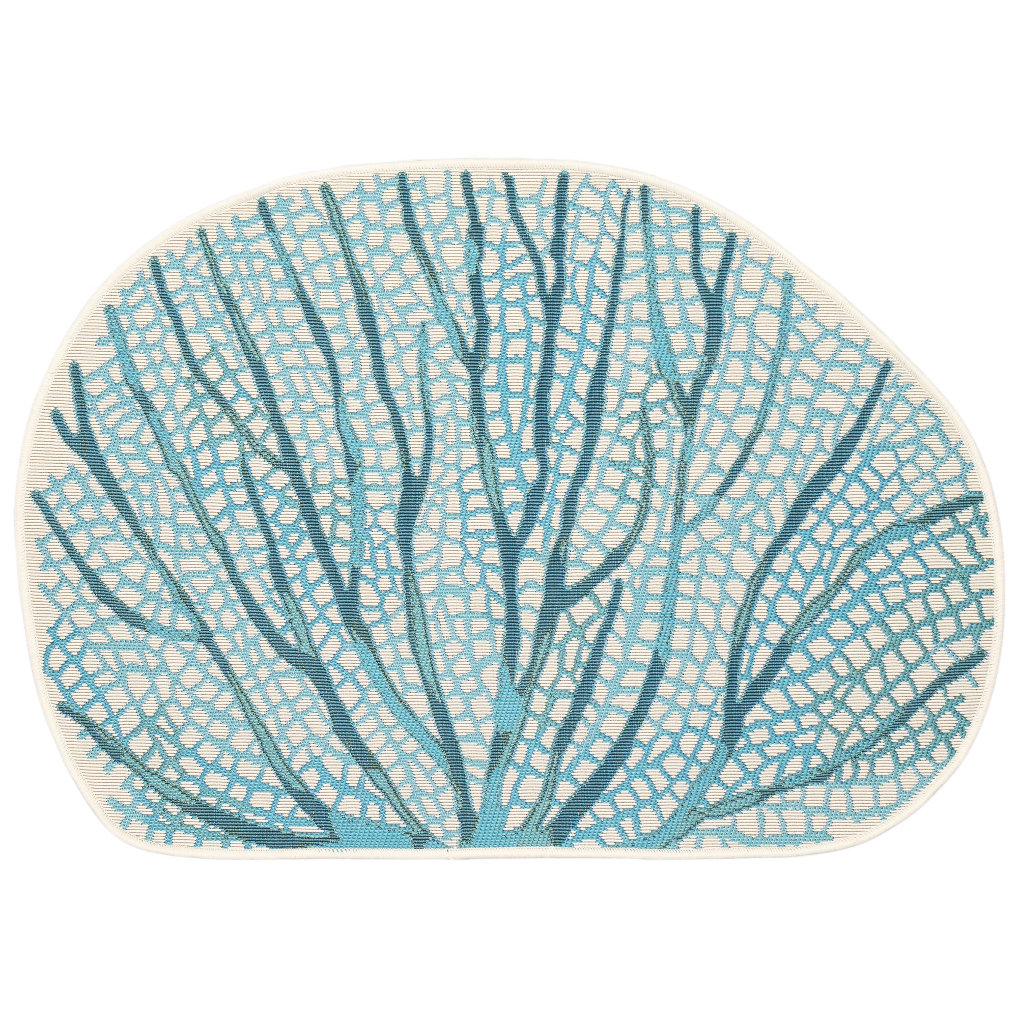 stunning Esencia Coral Fan Blue, a charming addition to your home decor. This decorative coastal novelty mat boasts a unique design with an ivory backdrop that beautifully showcases the delicate aqua fanned coral branch shape. Perfect for adding a touch of whimsical elegance to any room, this mat is sure to capture attention and elevate your space's aesthetic.