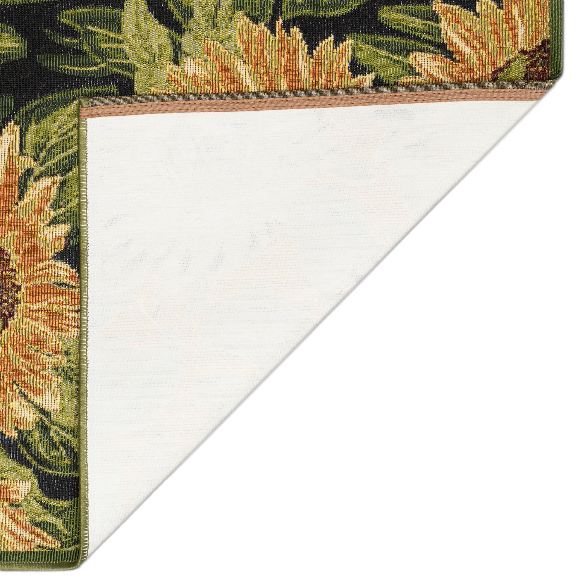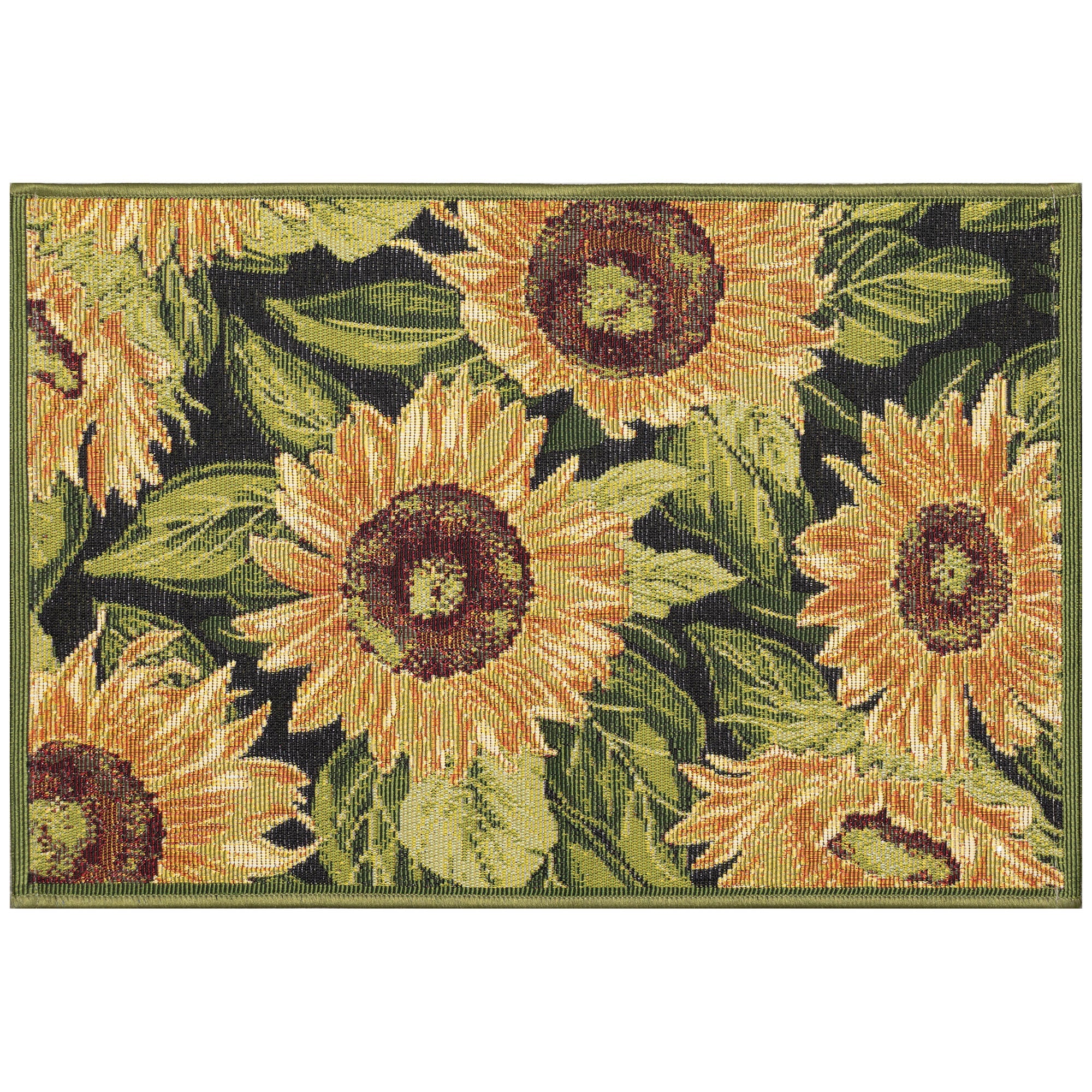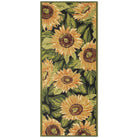 stunning Esencia Sunflowers Black mat, a unique addition to your home decor. This botanical-inspired piece showcases vibrant gold oversized floral blooms and lush green leaves on a sleek black background. The Sunflower transitional design brings a touch of nature indoors while adding a pop of color to any room. Crafted with high-quality materials, this mat is not only beautiful but also durable and easy to maintain. Elevate your space with the Esencia Sunflowers Black mat and make a bold statement in style.