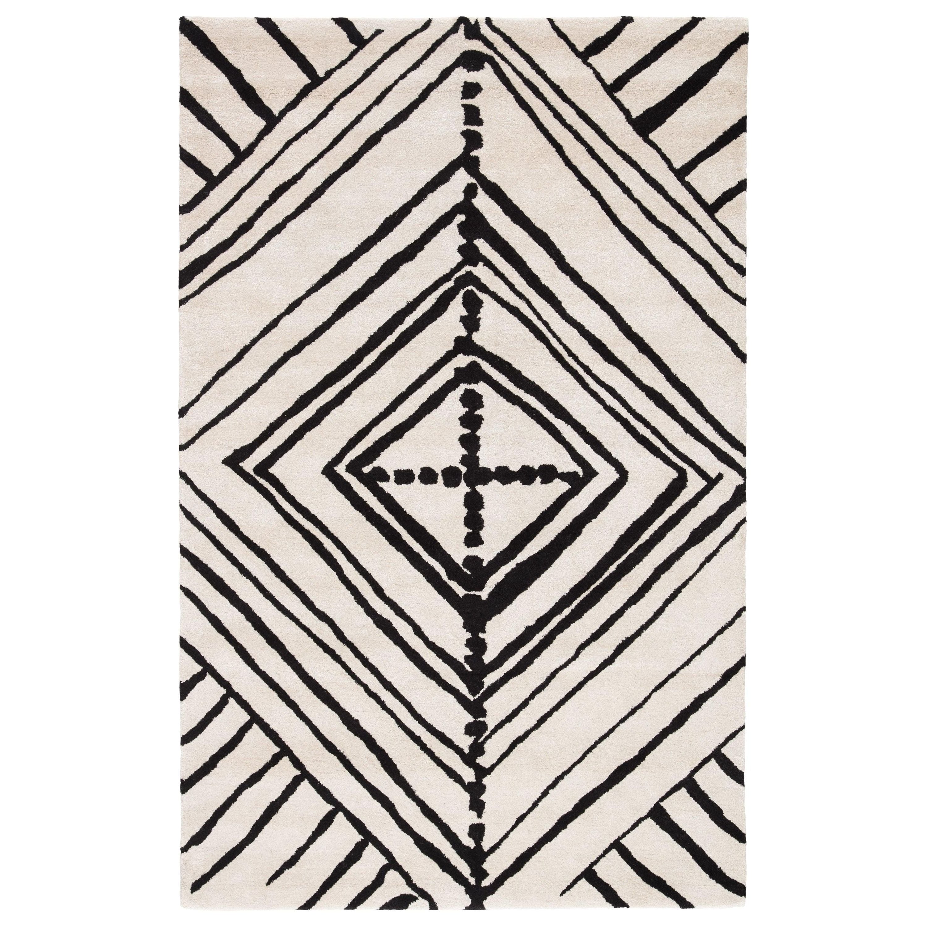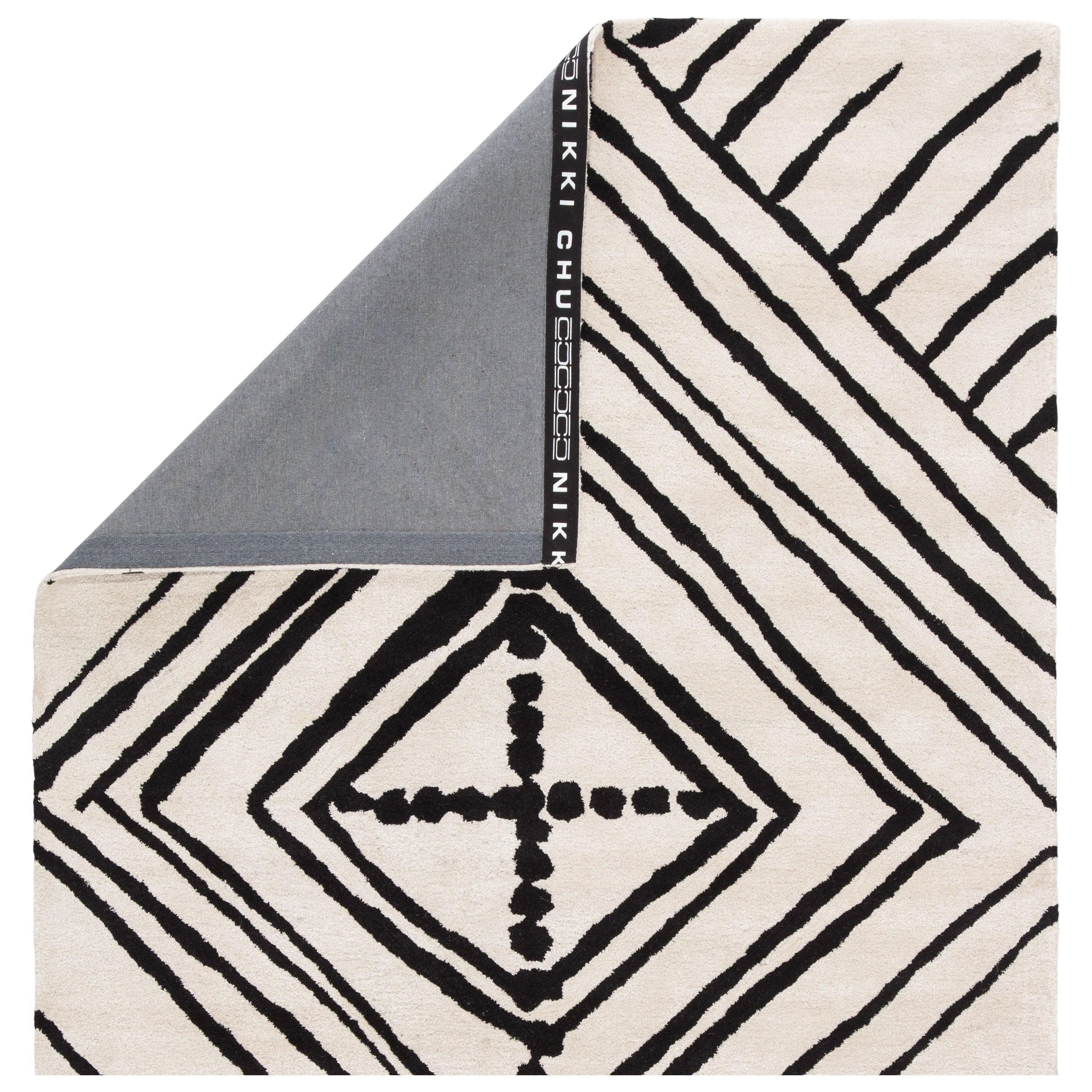 Etho By Nikki Chu ENK10 Gemma area rug, a striking addition to any room. Designed by Nikki Chu, this hand-tufted rug brings a touch of global modernity to your decor. The bold tribal design features large-scale dots and linear patterns that make a statement in chic spaces. The contrasting black and white colorway adds a sophisticated touch to any room.