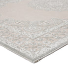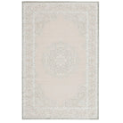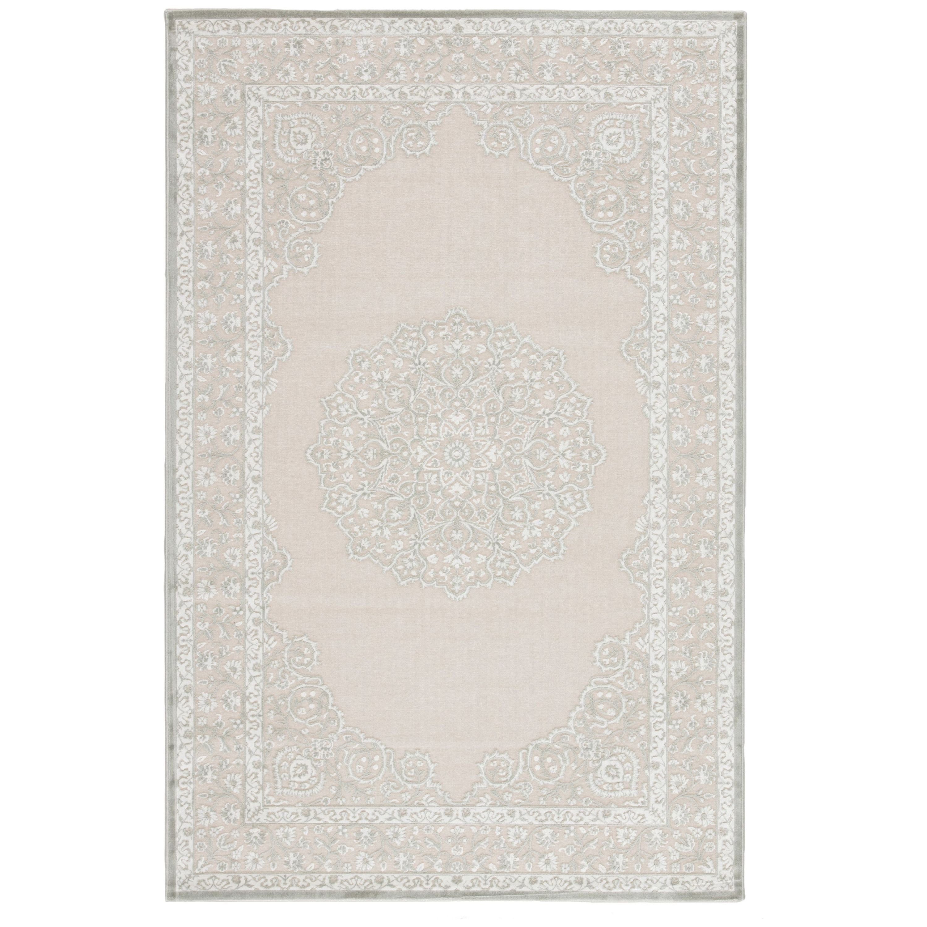 Fables FB124 Malo area rug, a luxurious addition to any bedroom. This rug is crafted from a blend of rayon and acrylic, creating a soft and inviting texture that is sure to enhance your space. The chic gray and white colorway adds a touch of contemporary glamour to the global-inspired center medallion and scrolling border design.