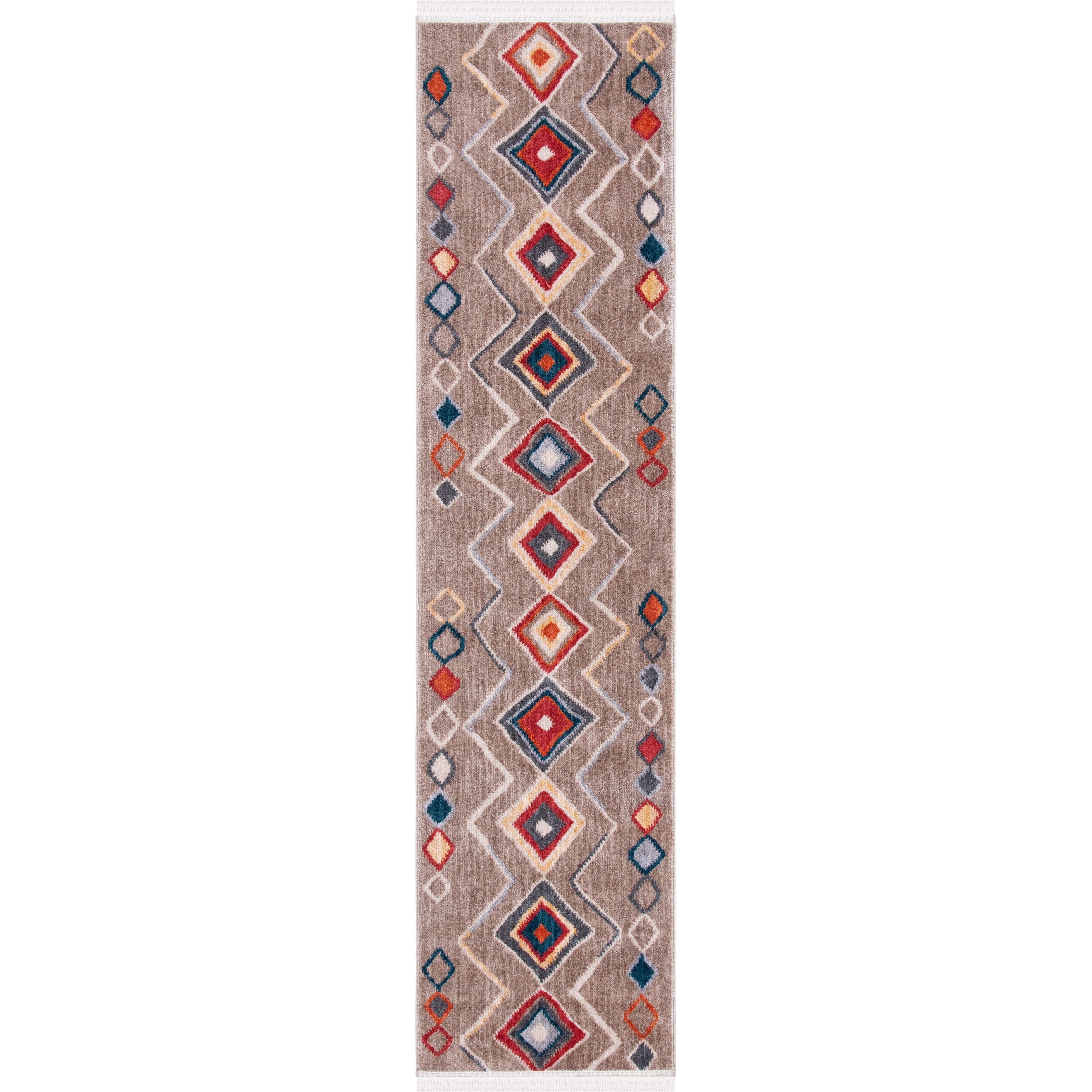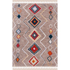Farmhouse FMH599B rug, designed to effortlessly blend modern farmhouse aesthetics with bohemian flair. Featuring braided tassels for a chic touch, this rug showcases a vibrant color palette of blue, orange, yellow, and red reminiscent of traditional southwestern rugs. Crafted with a silky smooth polyester pile, this rug is versatile enough to be layered over a natural fiber rug or stand alone as a statement piece in any room like the living area, bedroom, or dining space. With an approximate thickness of 0.25 inches, it offers both style and comfort.
