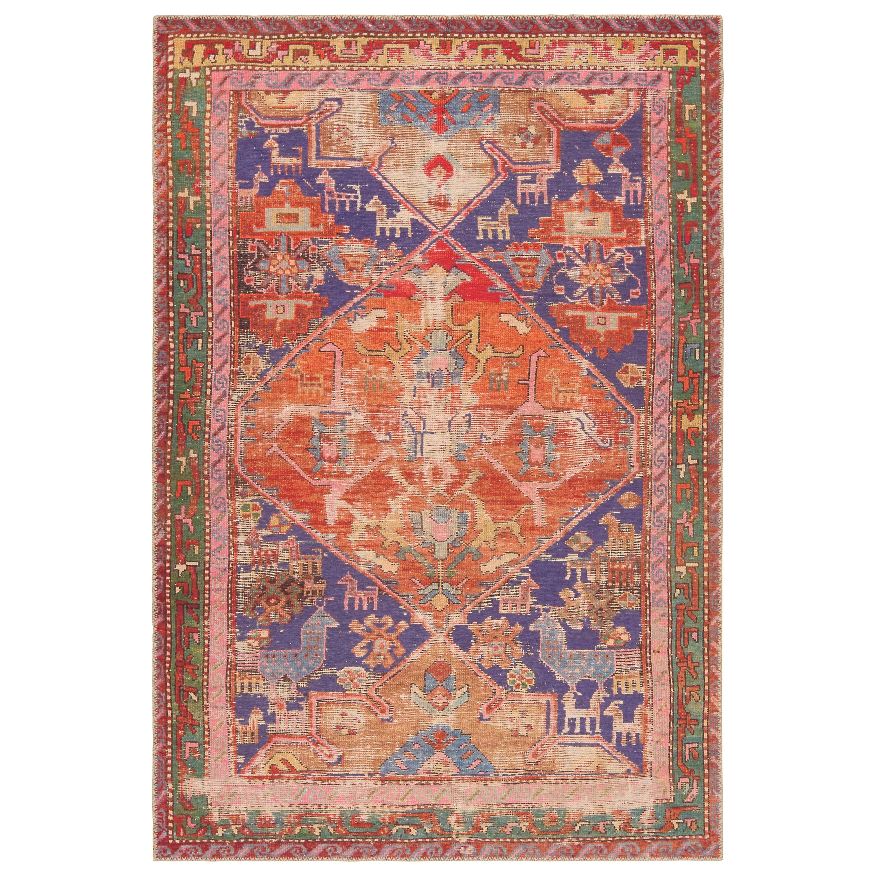 Inspired by coveted vintage finds, the Garcia collection emulates the well-worn details and the beautiful abrash nature of antique textiles. The Sancho design showcases a center medallion and intricate border with llamas and floral details throughout. Bold orange and purple hues dominate this rug with red, gold, green, brown, blue, and pink accent colors that create an intriguing and vivid addition to any home. Distressing adds dimension to the Turkish, traditional style. In Turkey, this digital design is printed onto the 1/5th inch thick, polyester base, cut, and embellished with edge stitching for a finished look. Up to four times machine washable, this printed accent piece provides a durable quality that cleans up effortlessly while withstanding heavy traffic, children, and pets.