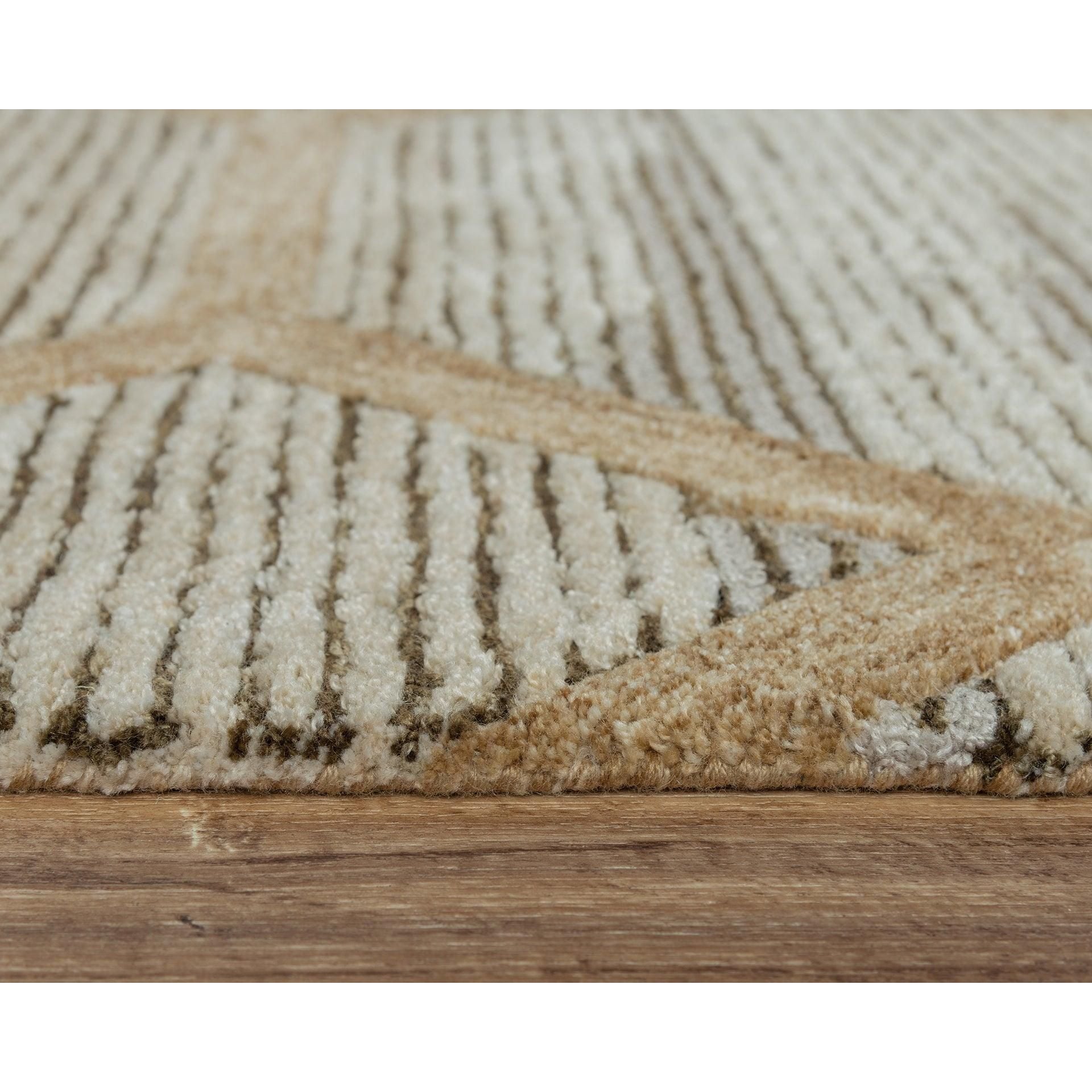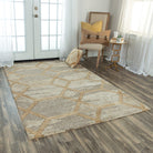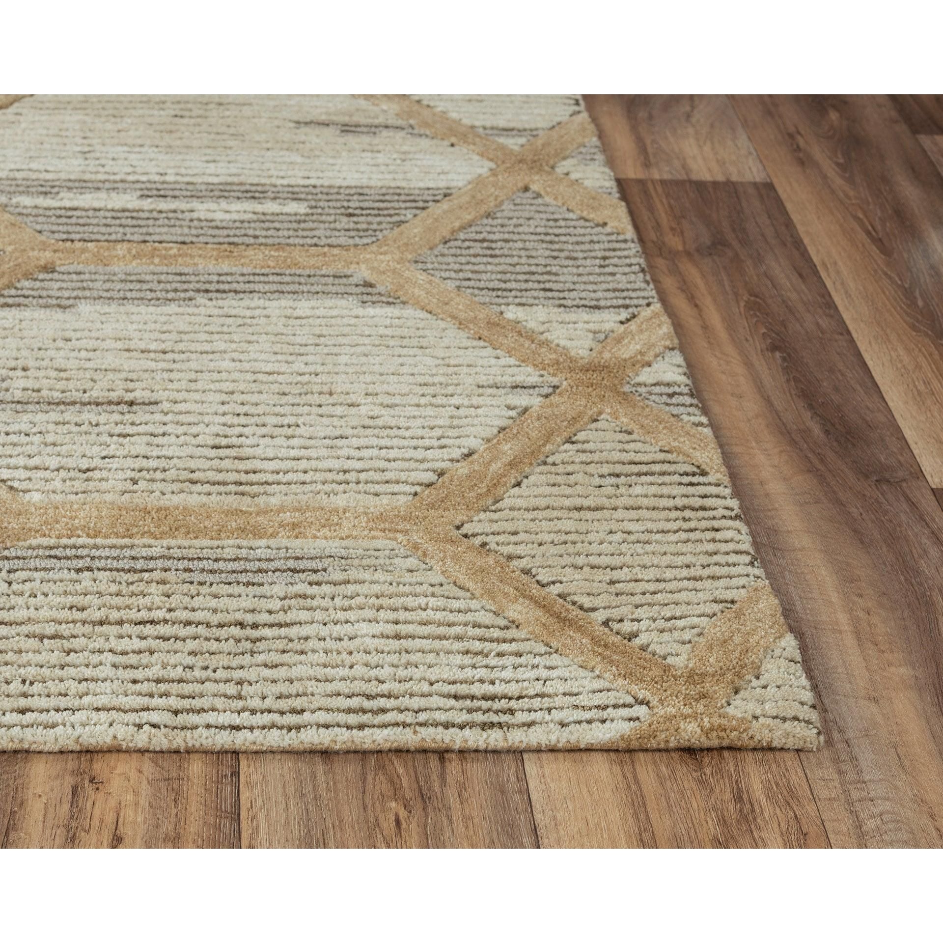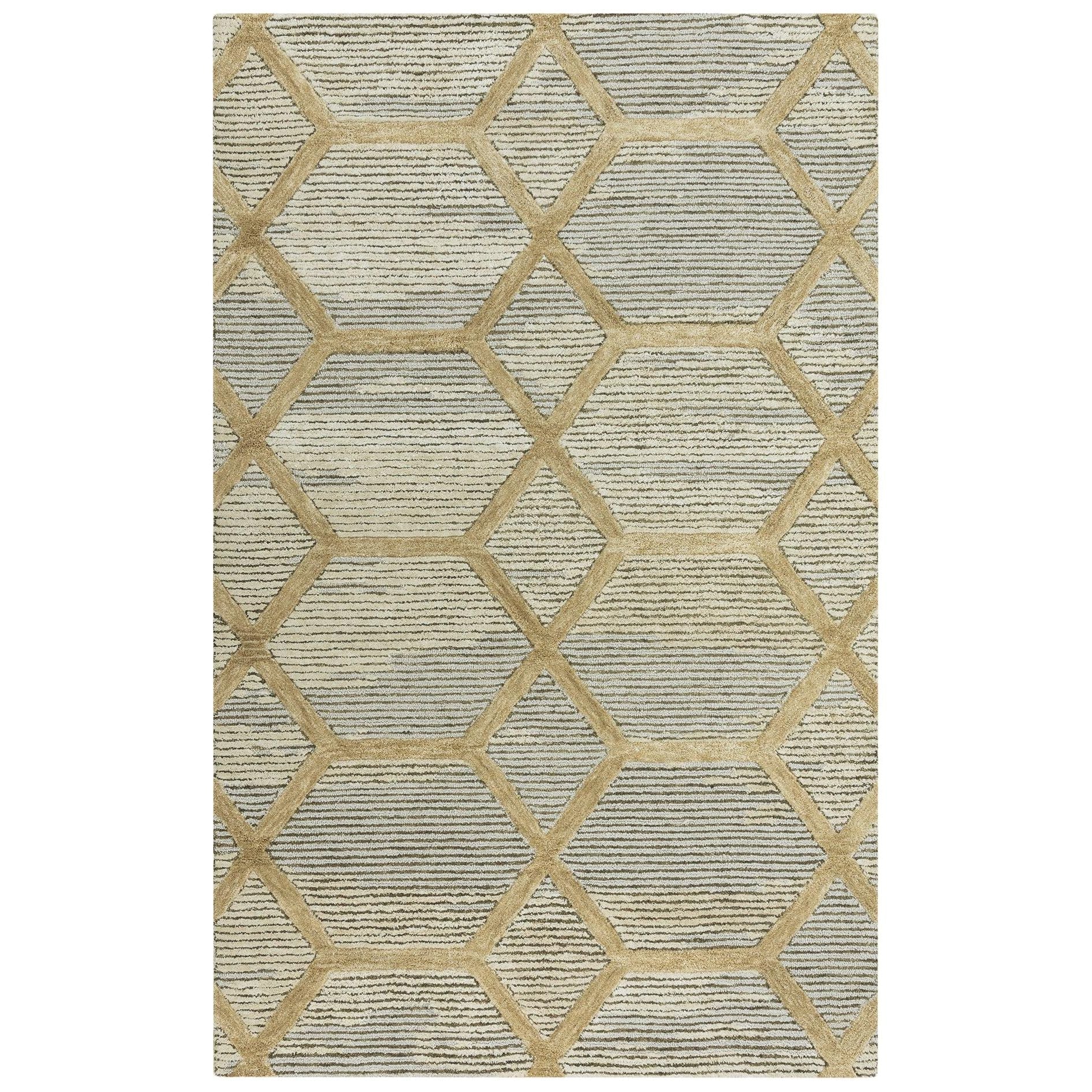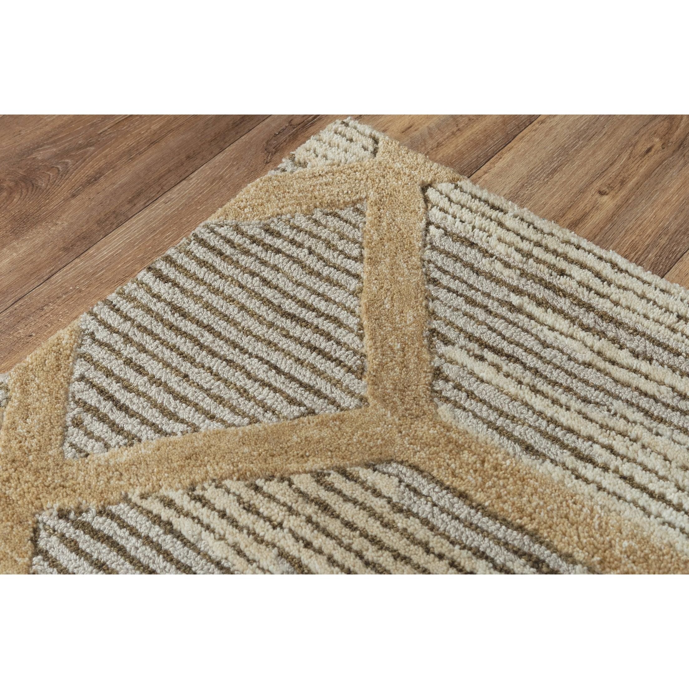 Haven HVN101 rug - your eco-friendly choice for a beautiful home decor accessory. Crafted from 100% recycled polyester fiber that mimics the look and feel of wool, this stunning rug is hand-tufted in India with a unique blend of cut and loop pile techniques. The traditional geometric pattern gets a modern update with an abstract twist, adding a contemporary touch to any room.