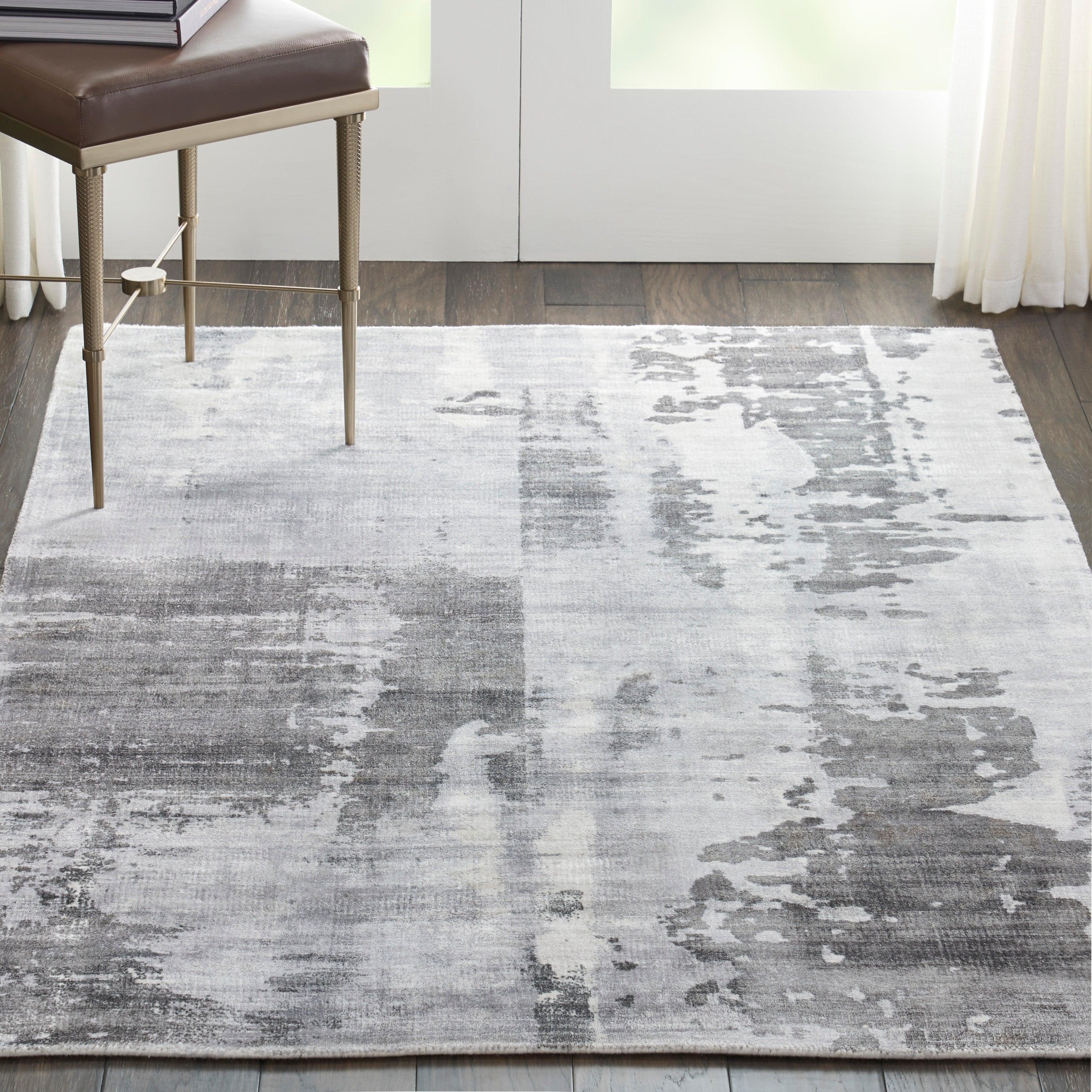 KI37 Safari Dreams KI373 Grey rug from the renowned Kathy Ireland Home collection. This contemporary piece features a stunning palette of sophisticated grey tones, set against a backdrop of pale grey and ivory for a truly artistic touch. The sleek low pile design and simulated brush strokes give this rug a modern aesthetic that effortlessly elevates any room it graces.