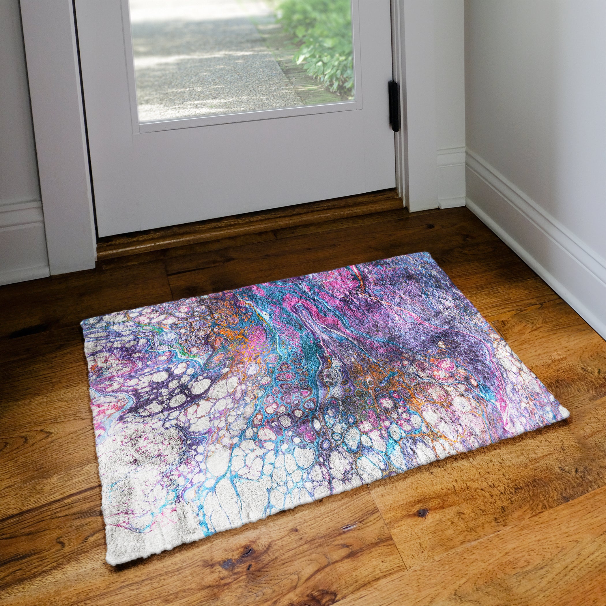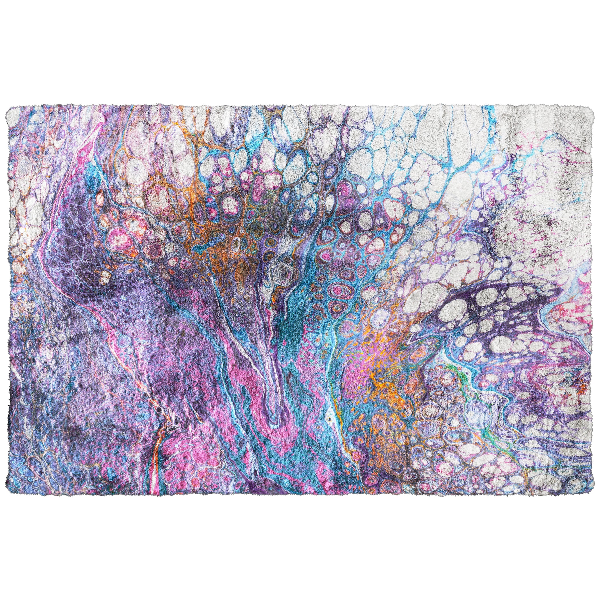Kikiamo KK19 Lavender from the Dalyn Kikiamo collection. This luxurious area rug features a plush 1” thick faux fur shag pile made of 100% polyester, with a premium canvas backing for added durability. The vibrant abstract patterns are exclusive artist originals, making this rug a stylish addition to any home decor.