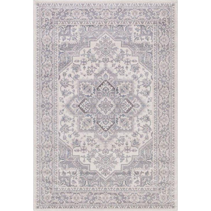 exquisite Lara Heriz Ivory Grey rug from our stunning collection. Crafted in Turkey with 100% heat-set polypropylene, this rug seamlessly blends transitional and traditional styles to enhance any living or workspace. The beautiful mix of blue and gray hues adds a touch of elegance and modernity, following today's top color trends.