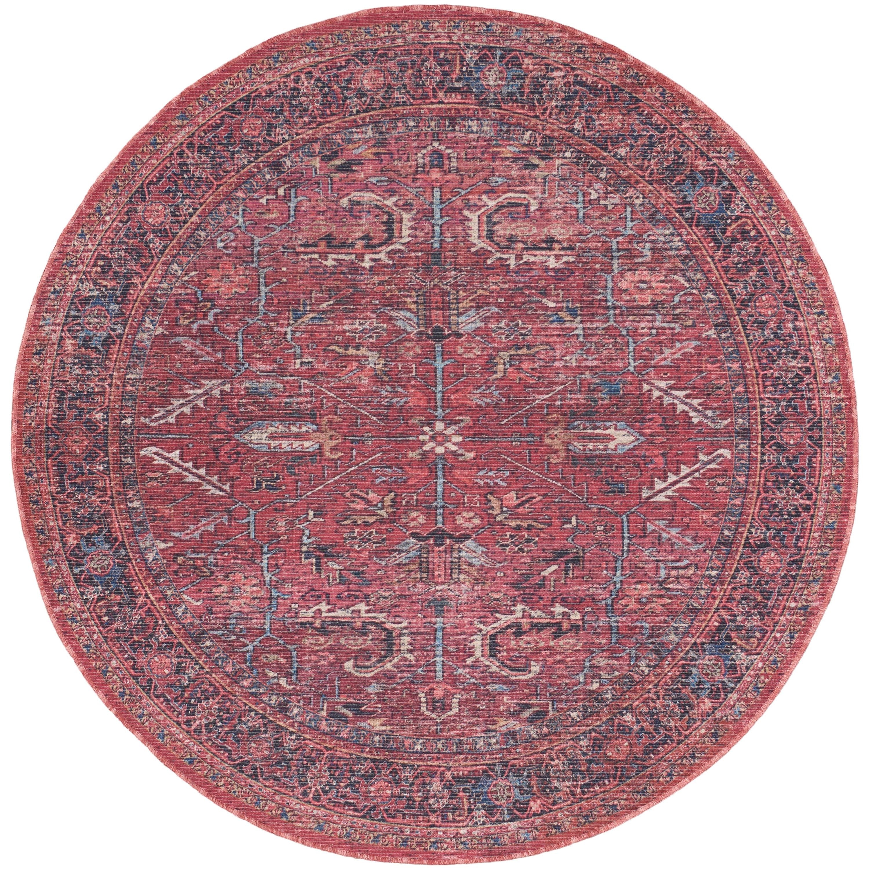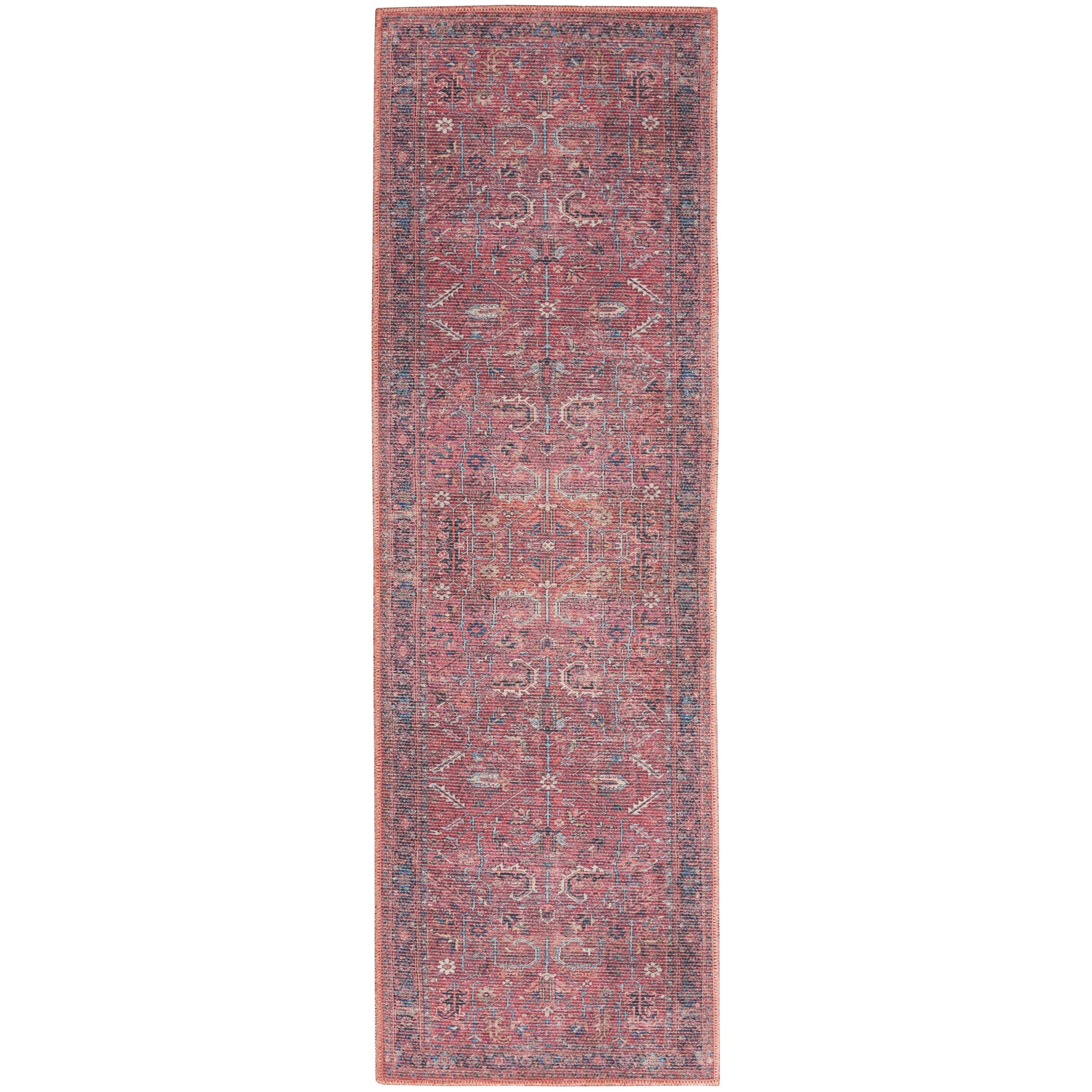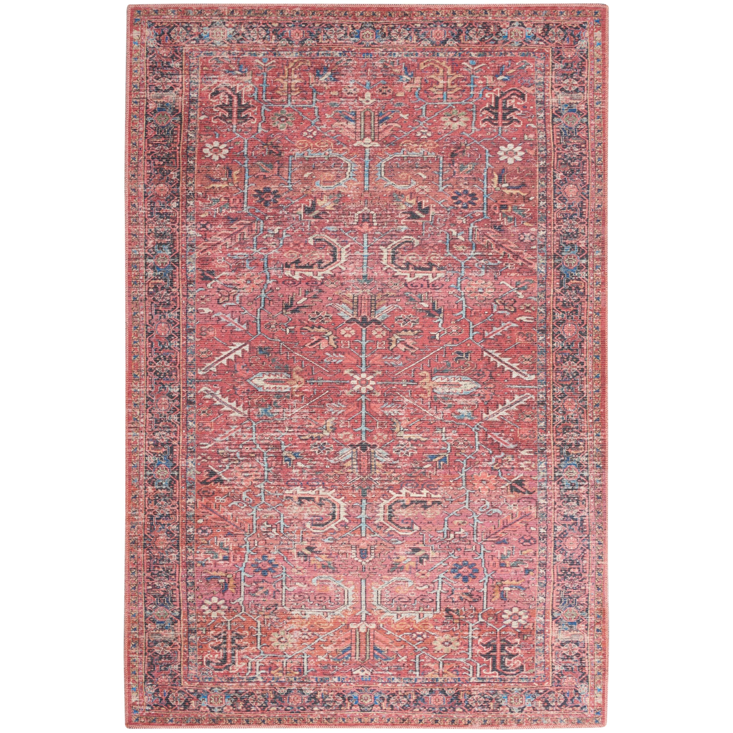 Machine Washable Series 1 SR102 Brick rug from the Nicole Curtis Collection. This rug seamlessly blends traditional and contemporary styles, featuring a timeless Persian pattern in brick red, navy, and ivory hues with a subtle distressed finish. Perfect for adding a touch of rustic charm to your bedroom, home office, or living room.