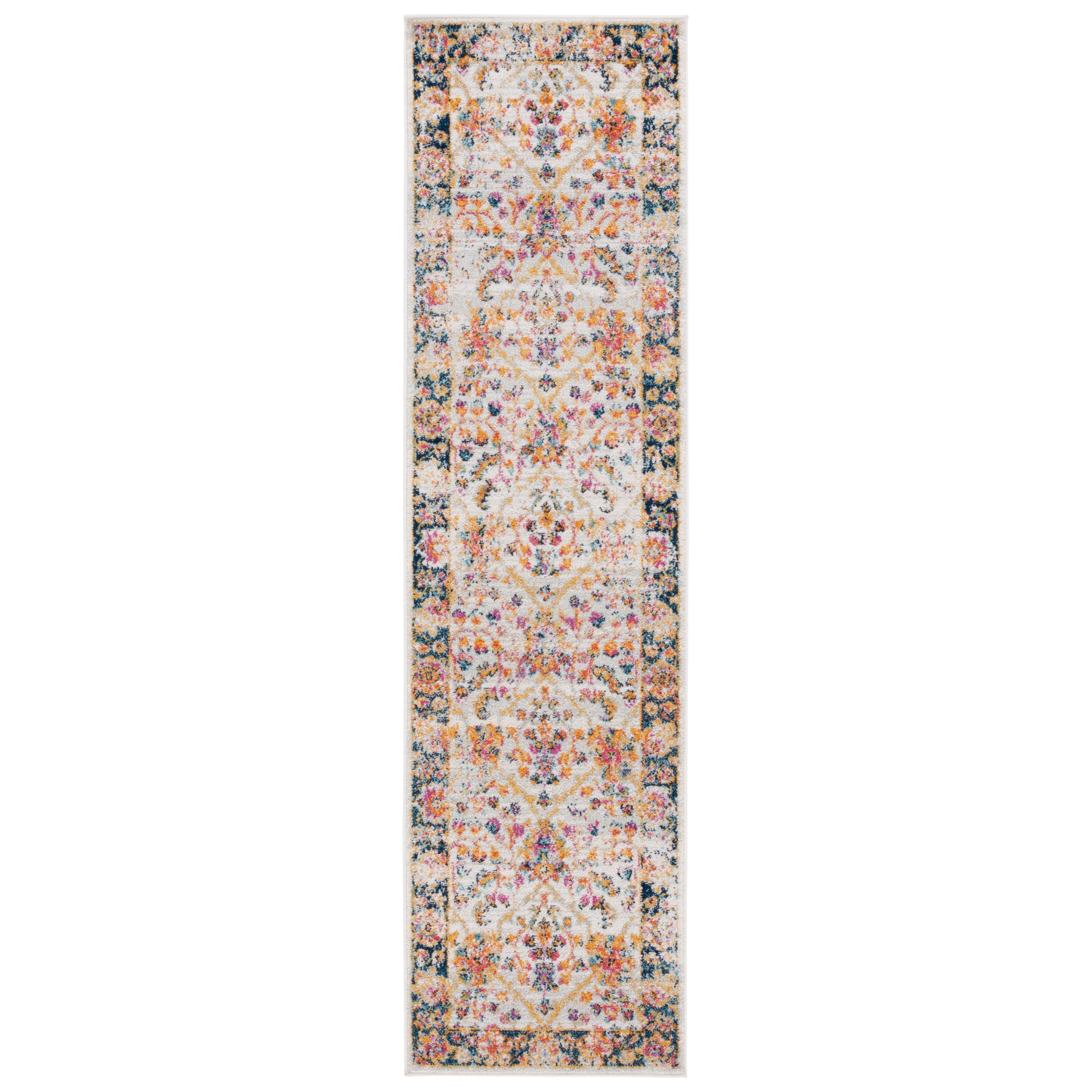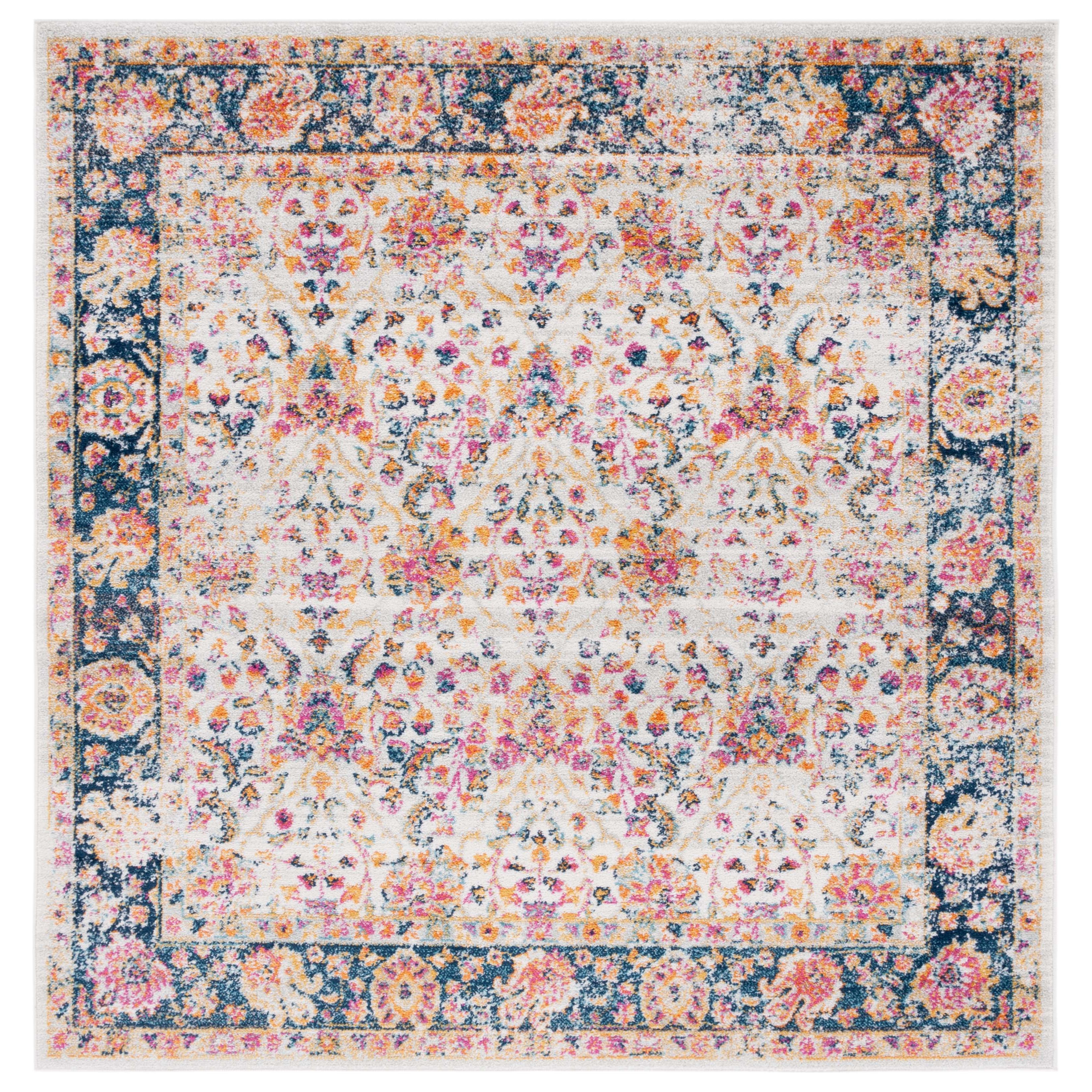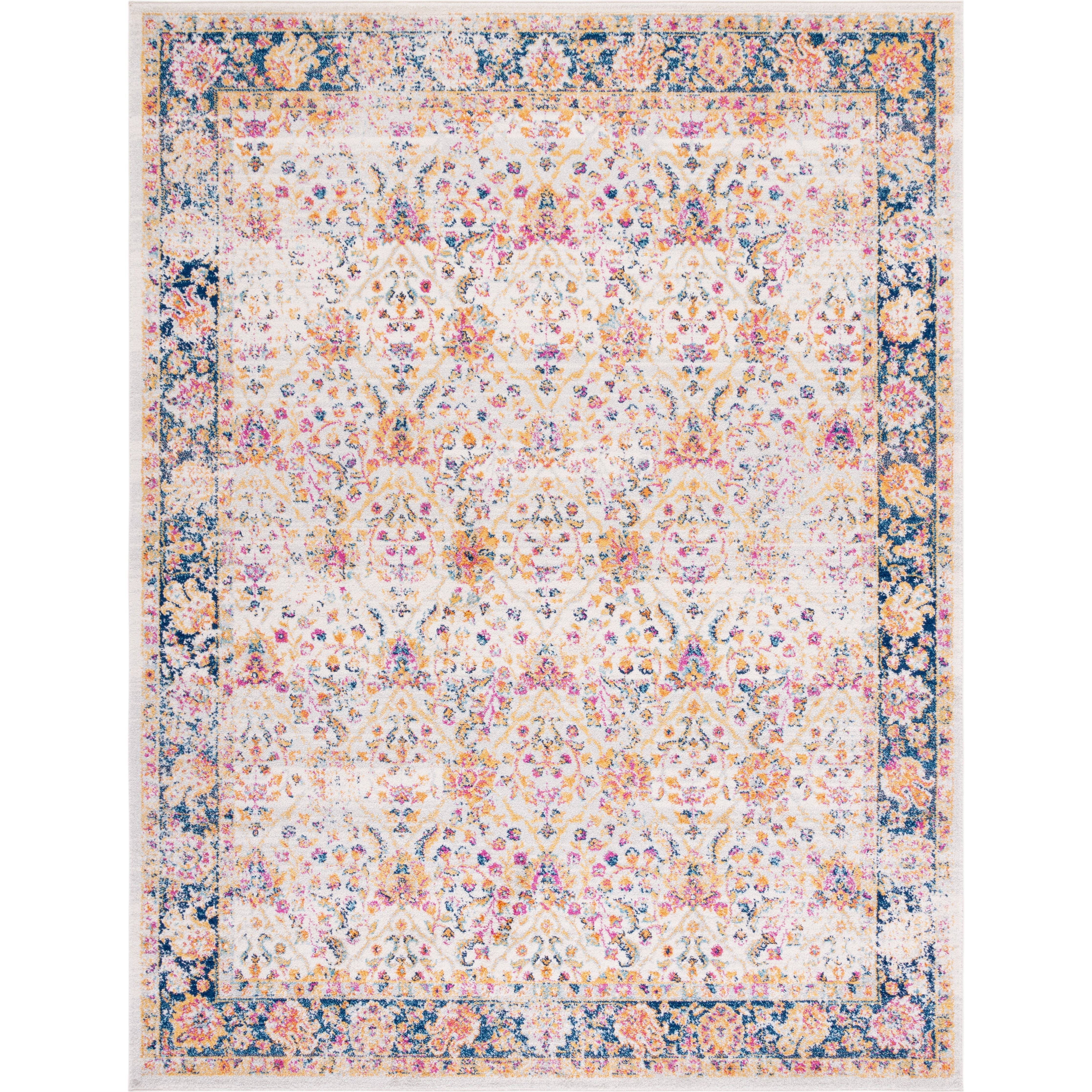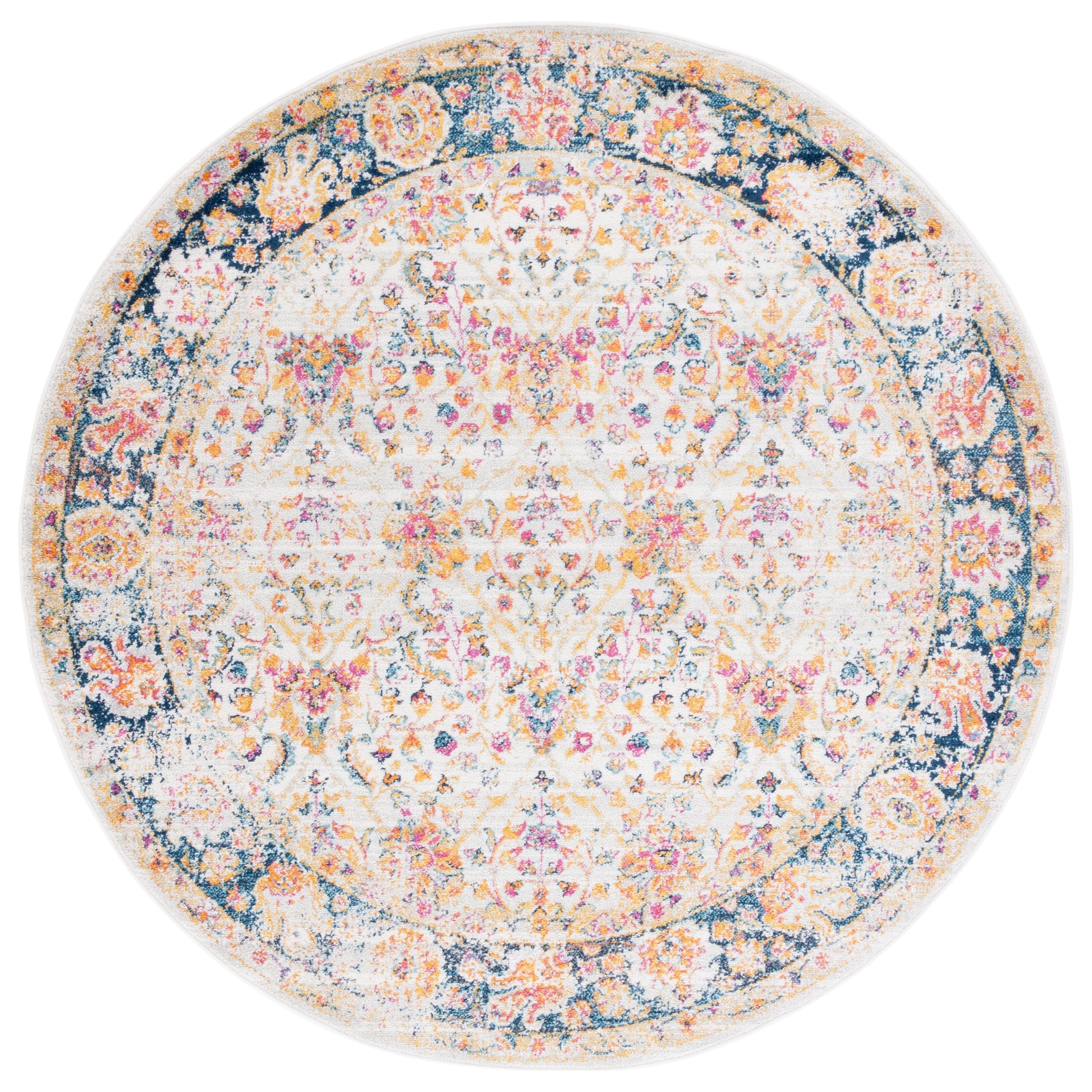 Madison MAD609D Cream Navy rug, a fusion of classic rug patterns with modern flair. This transitional piece combines timeless design elements with contemporary aesthetics for a captivating look that suits any decor. The intricate floral medallions in shades of blue and orange create a stunning gradient effect, giving the rug a vintage, distressed appearance that exudes elegance.