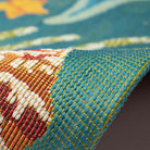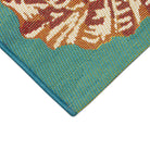 Marina Starfish Song Blue area rug, a stunning piece that will bring a touch of coastal charm to any room. The design showcases a beautiful collage of orange, green, navy, red, and blue scattered seashells and sea plants on a soothing aqua background. Whether you place it indoors or outdoors, this transitional rug will create a relaxing and beachy atmosphere.
