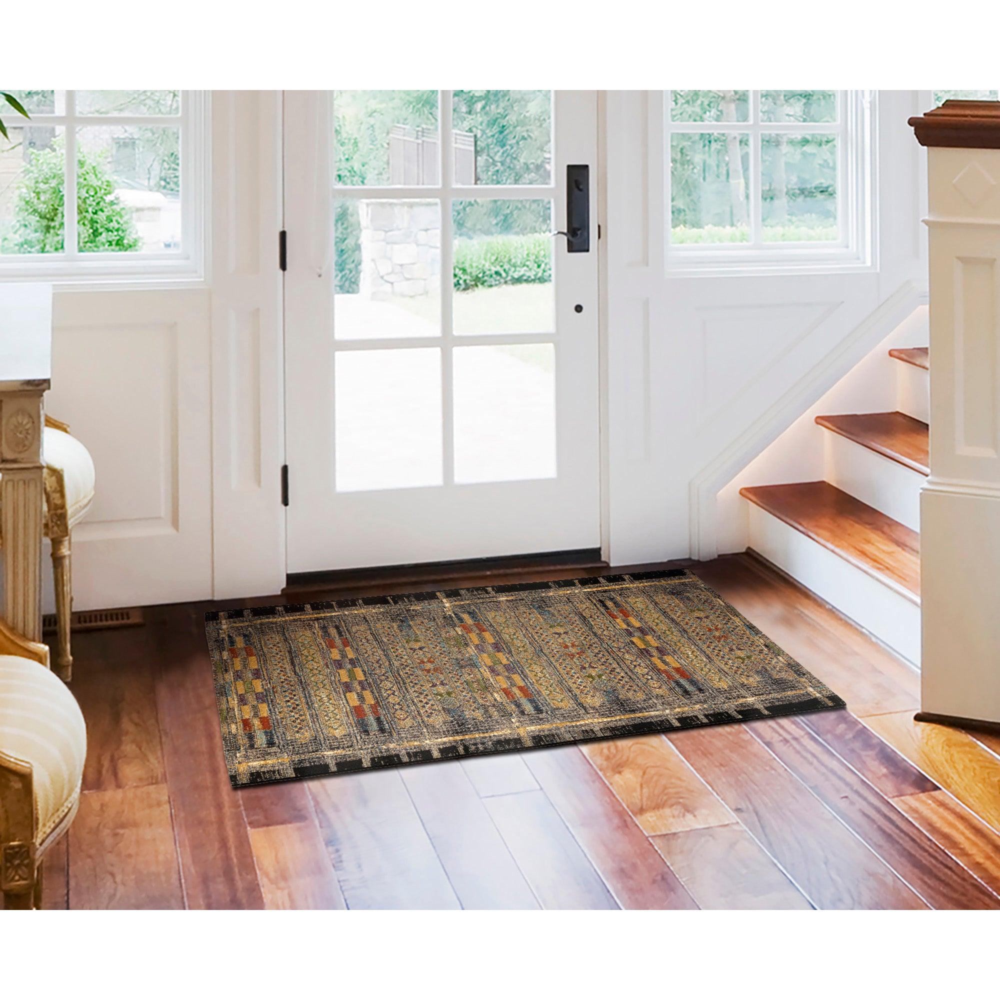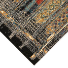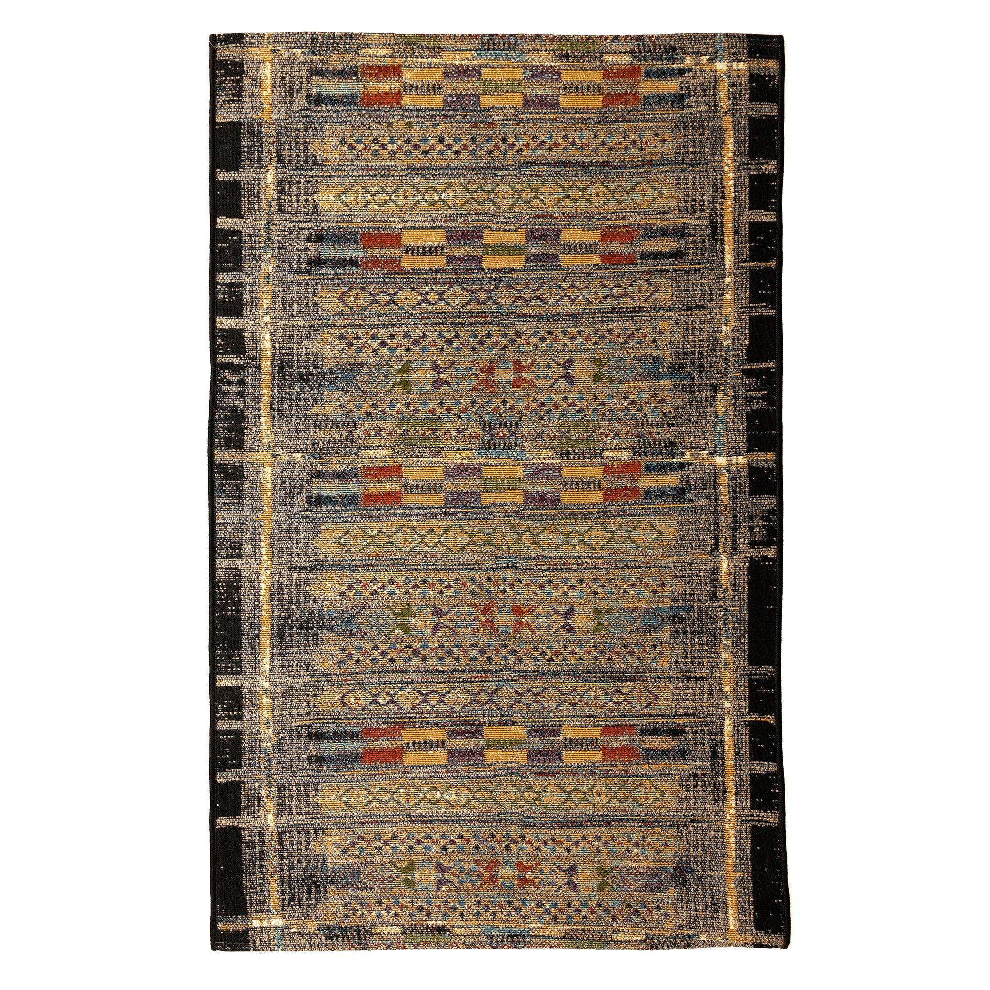Marina Tribal Stripe Black area rug, a vibrant and contemporary addition to your home decor. Inspired by traditional tribal patterns, this rug boasts geometric linear designs in a variety of colors and intricate shapes. Against the sleek black background, the accents in gold, orange, green, blue, grey, and ivory pop beautifully to create a bold and eye-catching look. Whether placed indoors or outdoors, this rug is sure to make a statement in any space. Elevate your home with this unique piece that combines traditional inspiration with a modern twist. Add a touch of color and style to your living area with the Marina Tribal Stripe Black rug today!