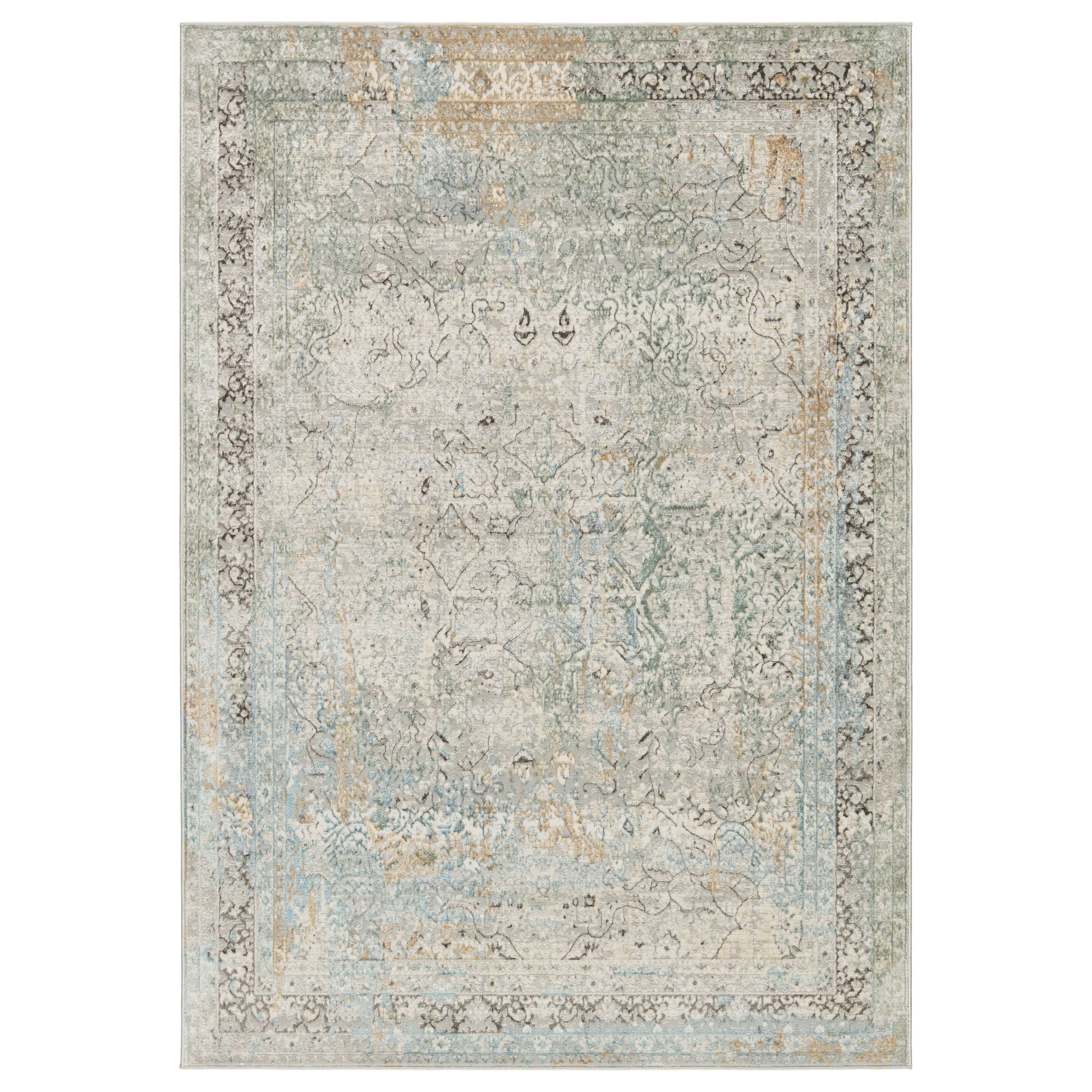 Melo MEL04 Thayer, a stunning addition to the chic and contemporary Melo collection that can elevate any home decor effortlessly. The Thayer rug showcases an exquisite traditional motif in a harmonious blend of green, light gray, cream, gold, light blue, and a touch of dark charcoal. Crafted with precision through power-loomed techniques, this rug exudes a luxurious lustrous sheen and boasts a texture-rich design with varying pile heights that create a sense of dimension and depth in any room.