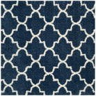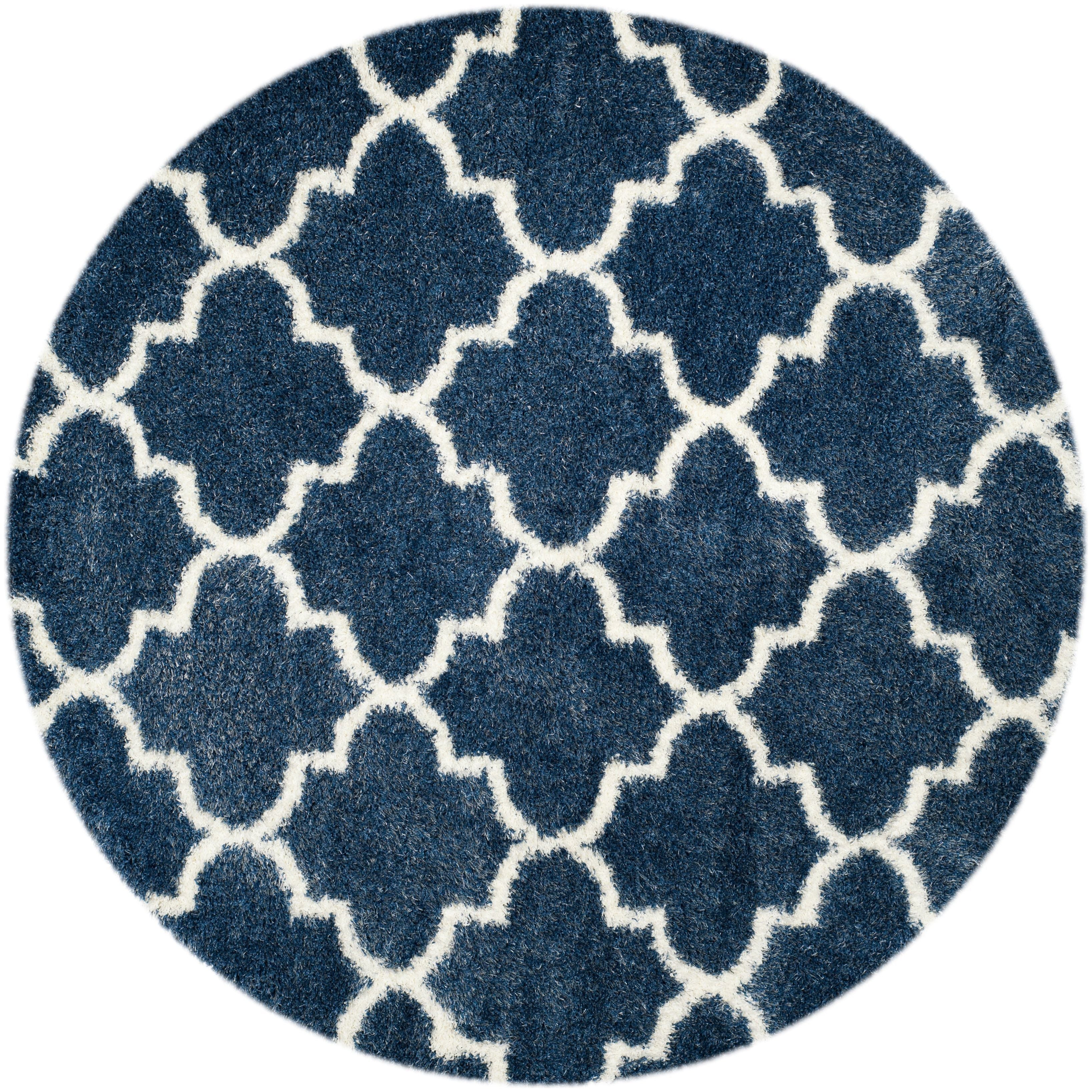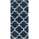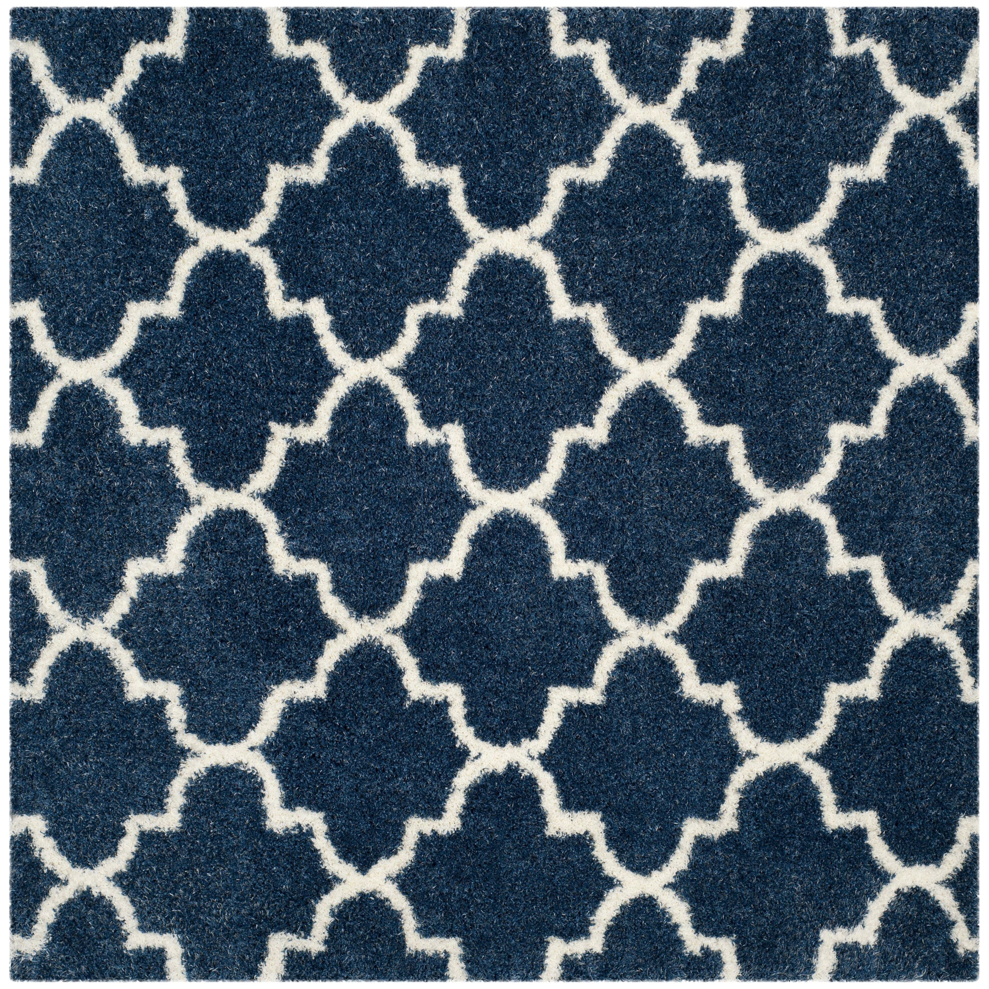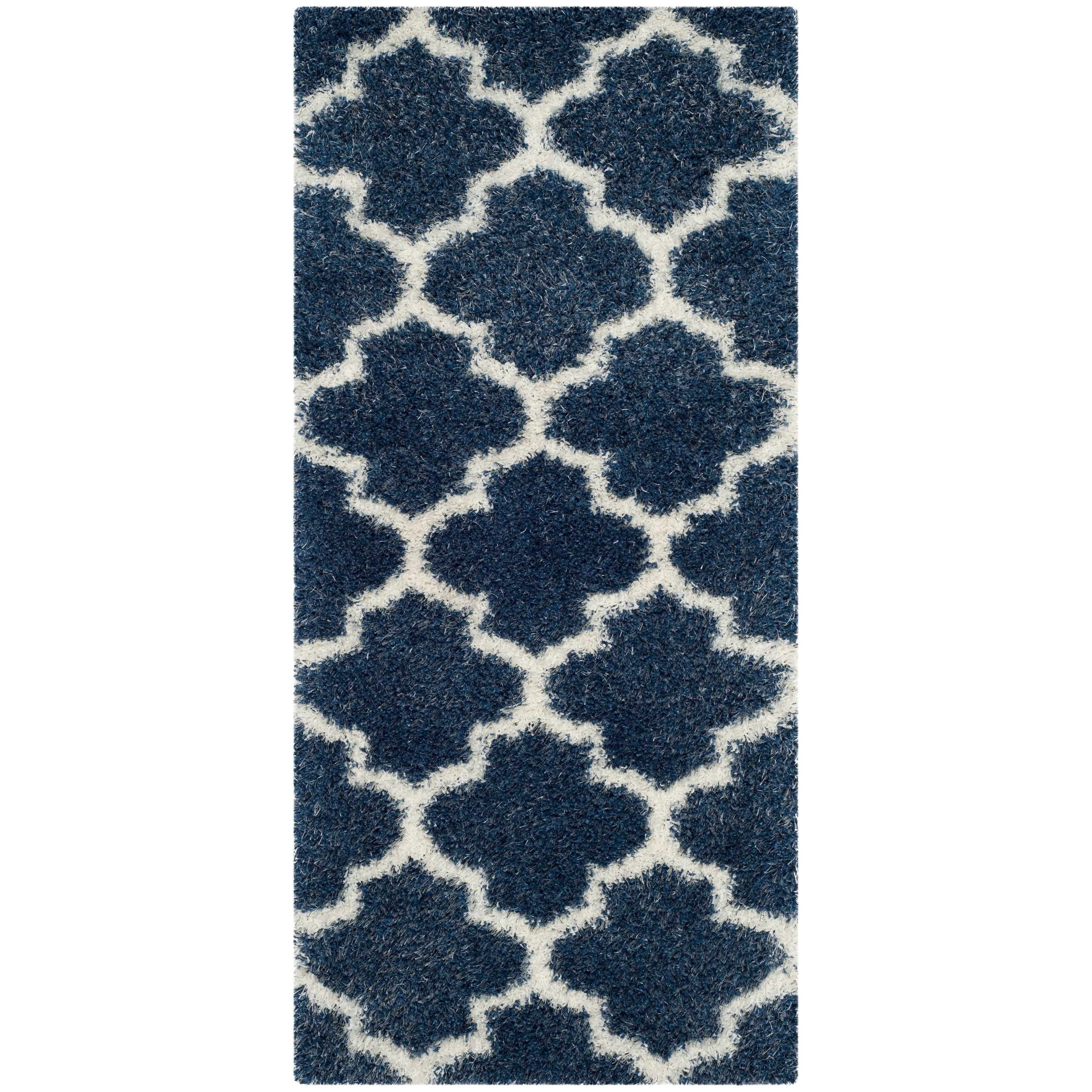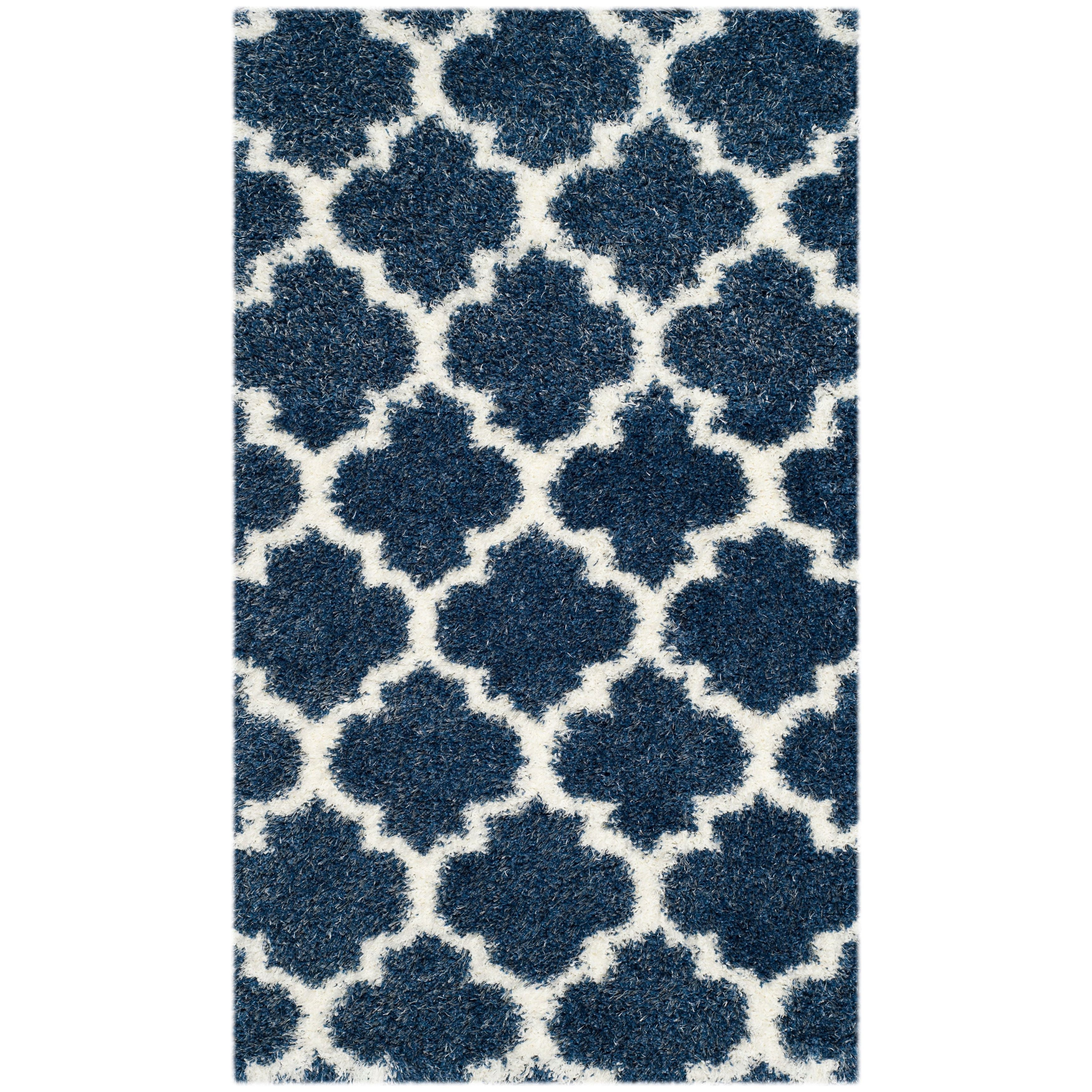Montreal Shag SGM832A, a stunning addition to Safavieh's Montreal Collection. Featuring bright ivory quatrefoils against a deep blue pile, this power-loomed shag rug offers a luxurious and stylish touch to any room. The blend of thick yarns and finely woven fibers creates a unique textural finish that is not only visually appealing but also provides a cushioned feel underfoot.