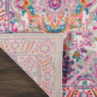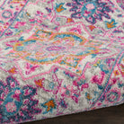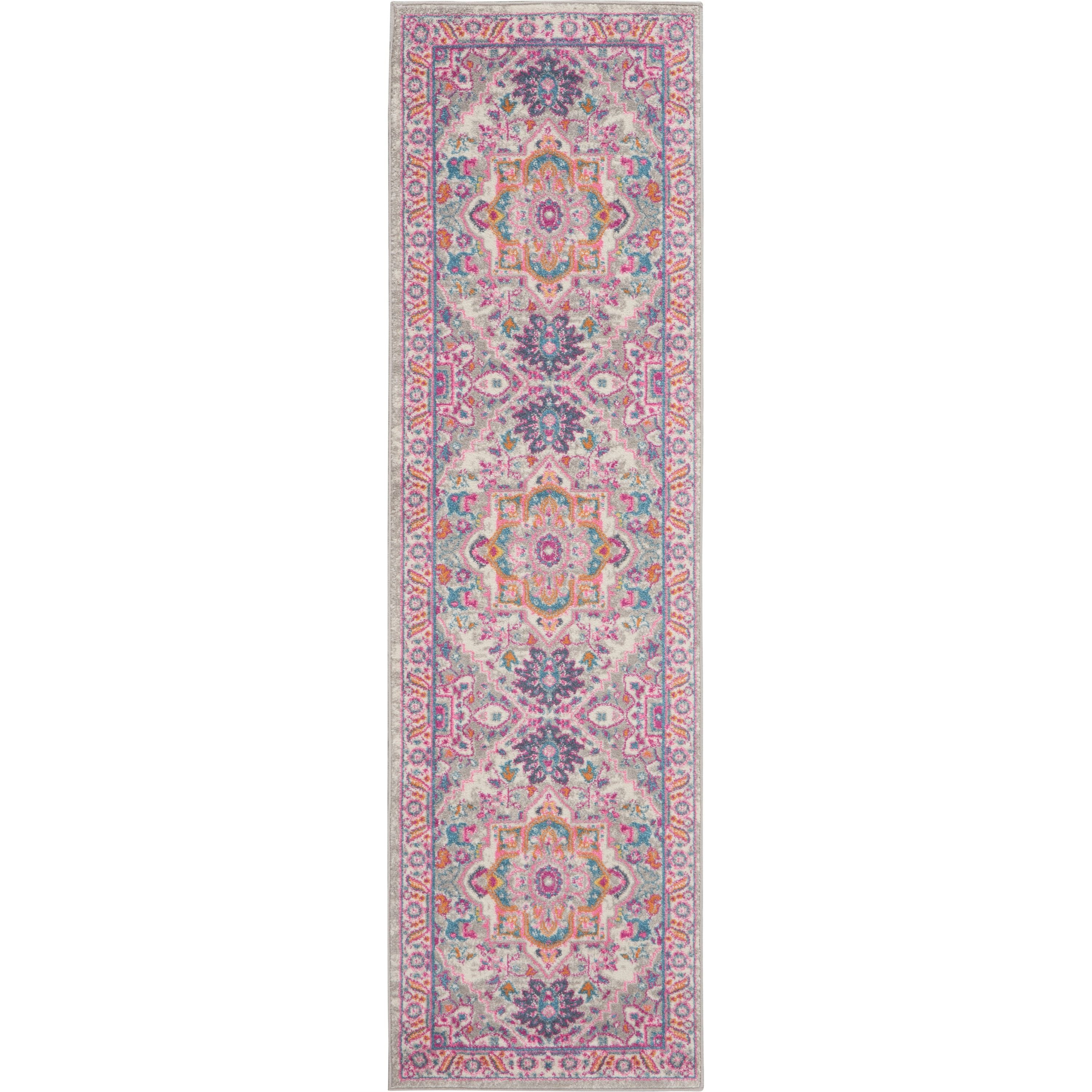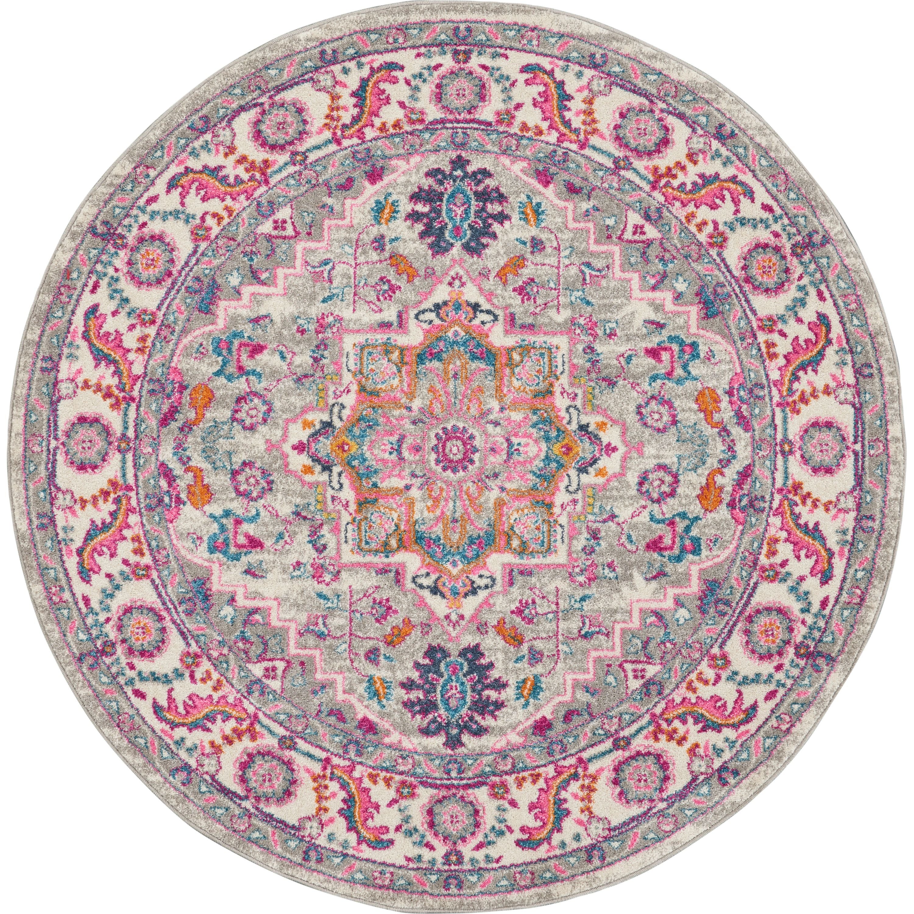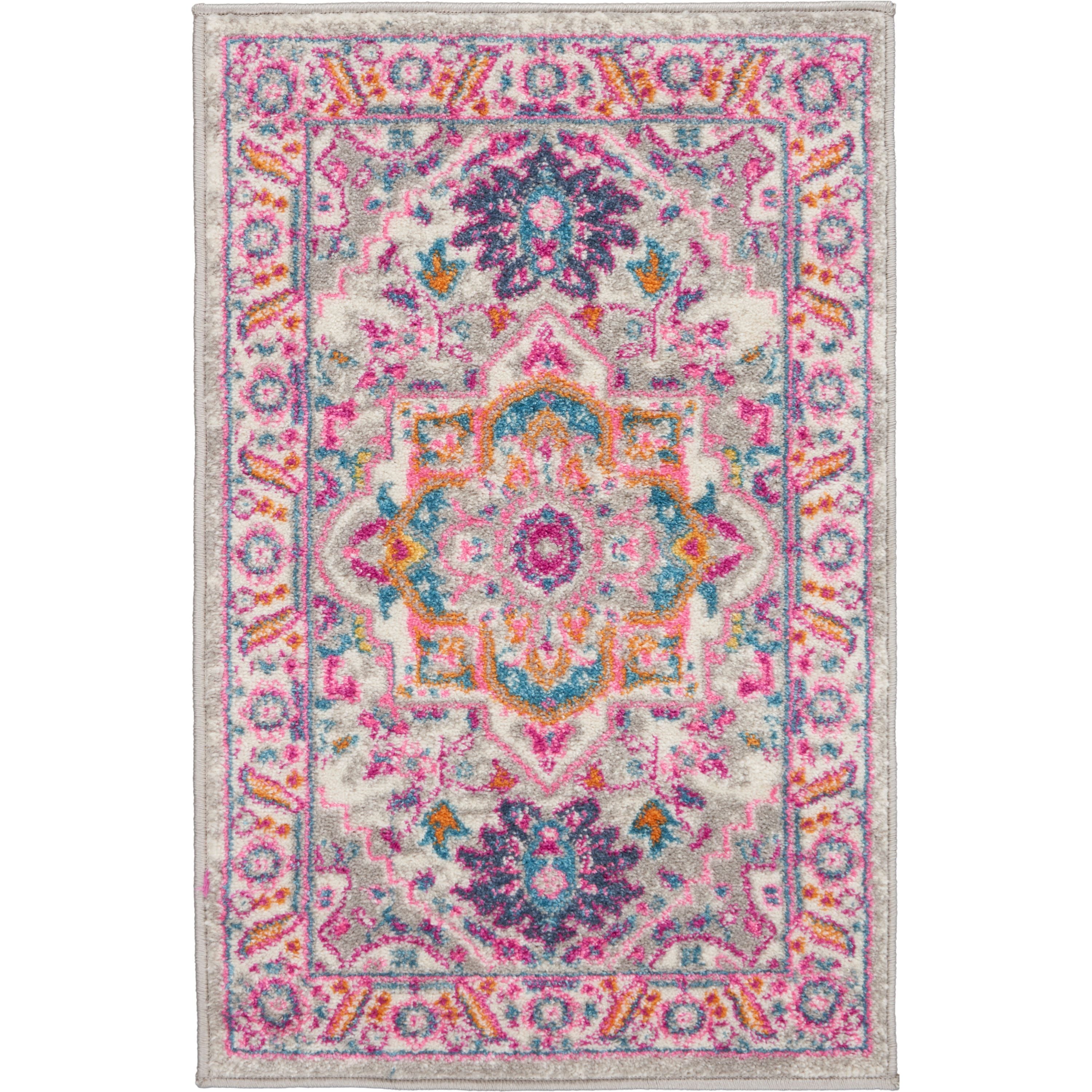 This timeless Oushak star medallion rug design takes on a contemporary tone with brilliant shades of pink on a grey multicolor field. With easy-care fibers, it's the perfect infusion of Boho charm for any space in your home or dorm room.