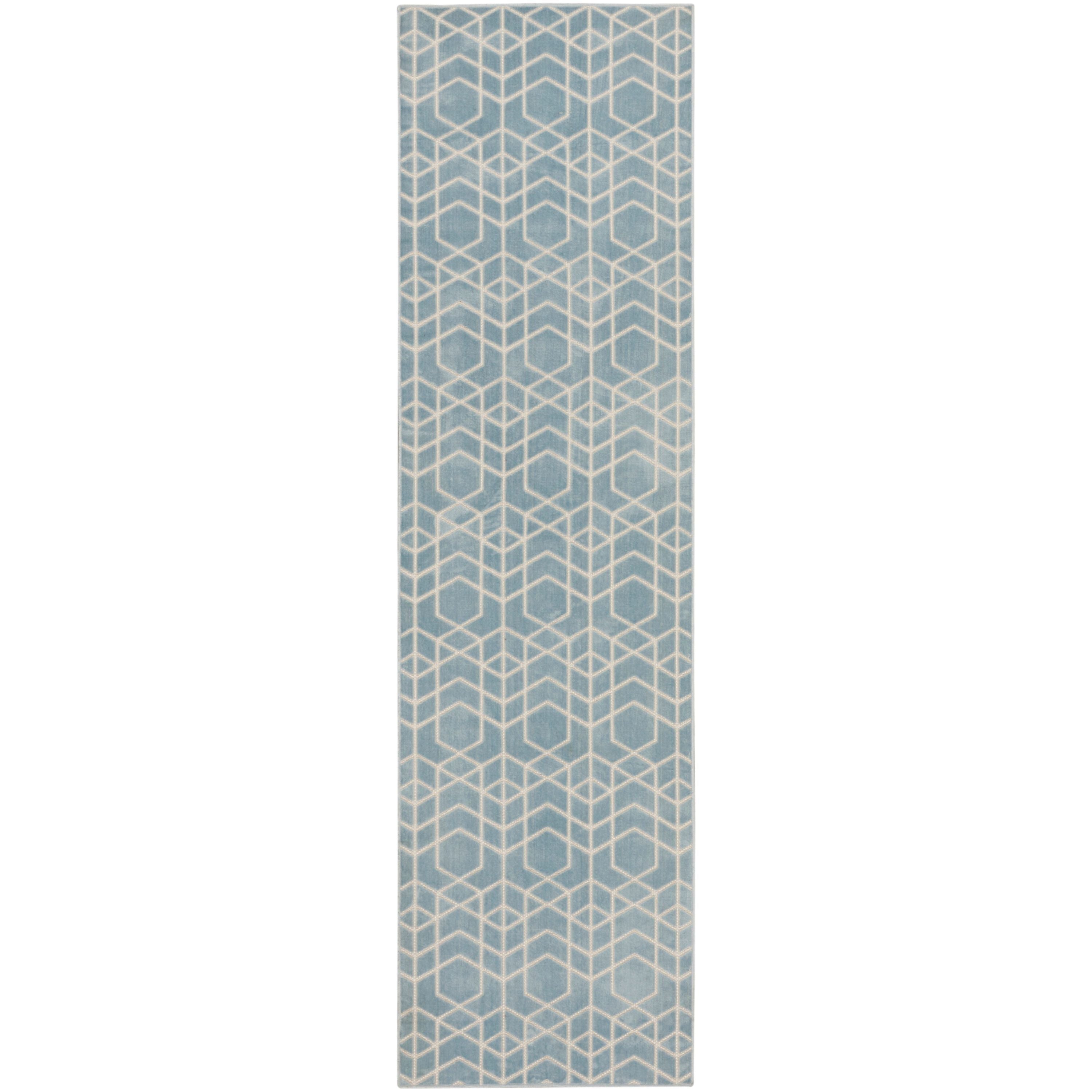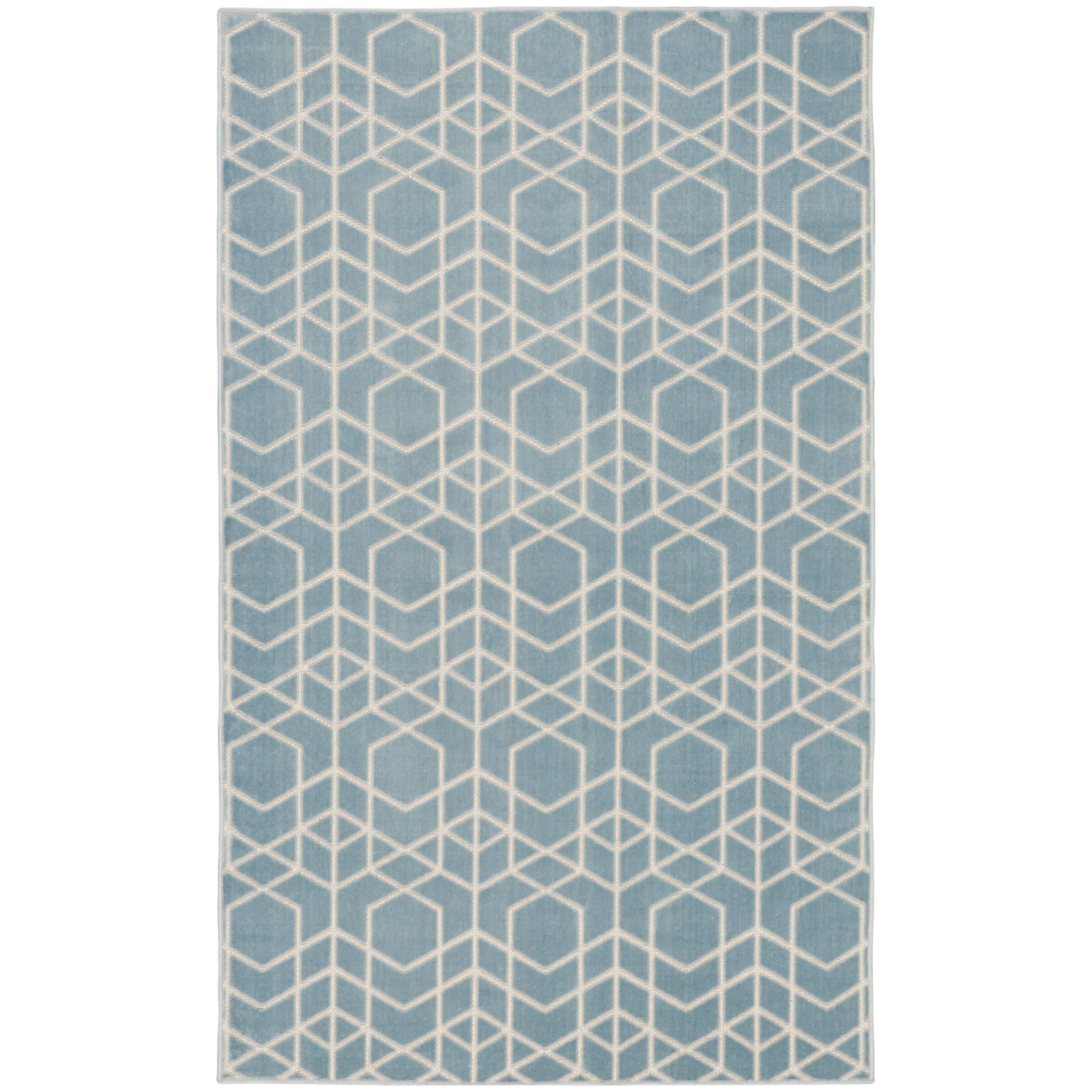 Enhance your space with the clean and modern look of this blue geometric rug from the Washable Charm collection. The crisp repeat pattern creates a mesmerizing effect, made even more stunning by a subtle high-low texture. Stylish and functional in a machine-washable, low-profile construction great for high-traffic areas.