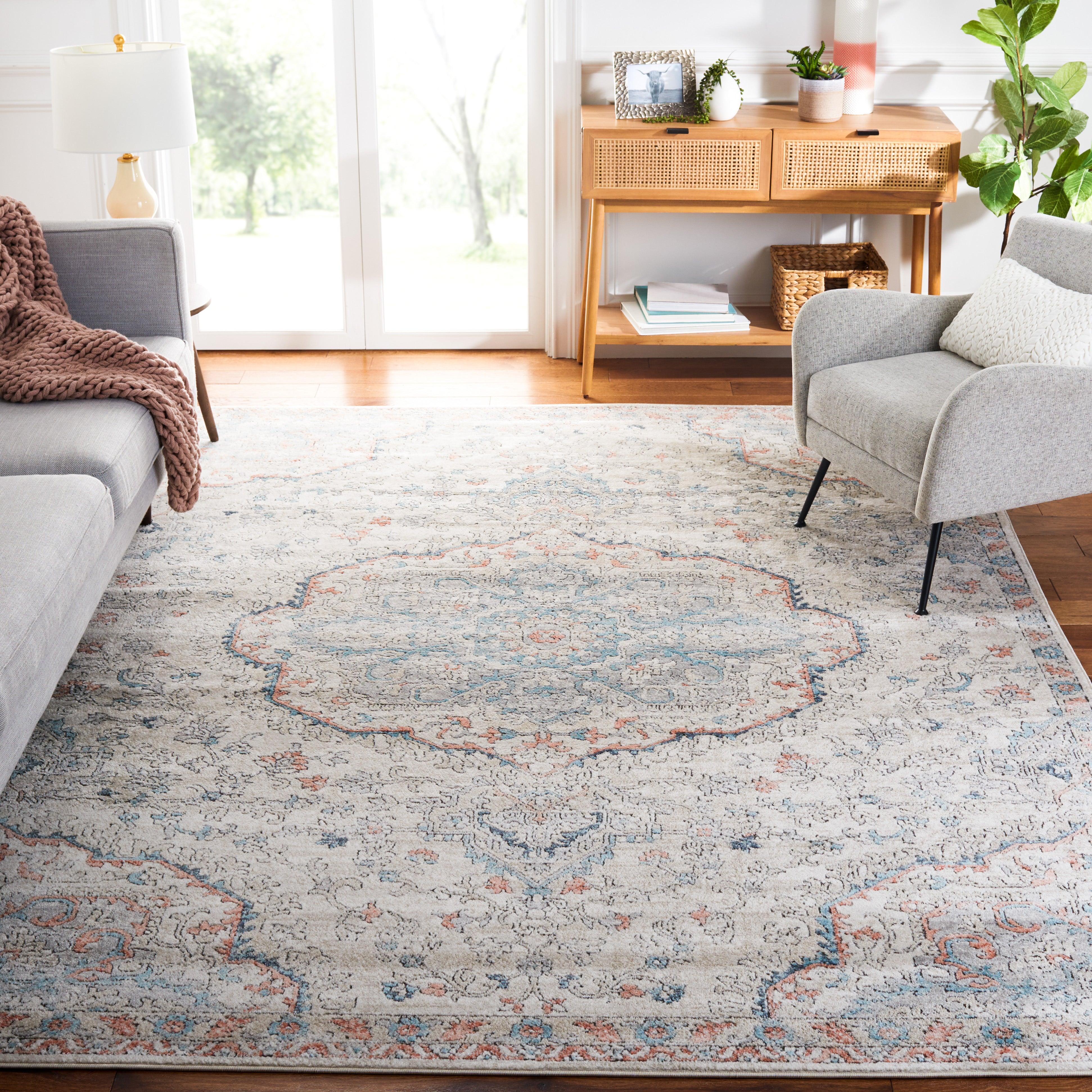 Elevate the ambiance of any space with the Oregon ORE812F area rugs from SAFAVIEH's Oregon Collection. These rugs boast a classic design featuring Oriental patterns and stunning medallions in soft, neutral tones with a distressed finish, adding a touch of vintage charm. Crafted from durable fibers with a low pile height, these rugs are ideal for high-traffic areas like entryways or under furniture. The rug measures approximately 0.35 inches thick, providing comfort and style in one package.