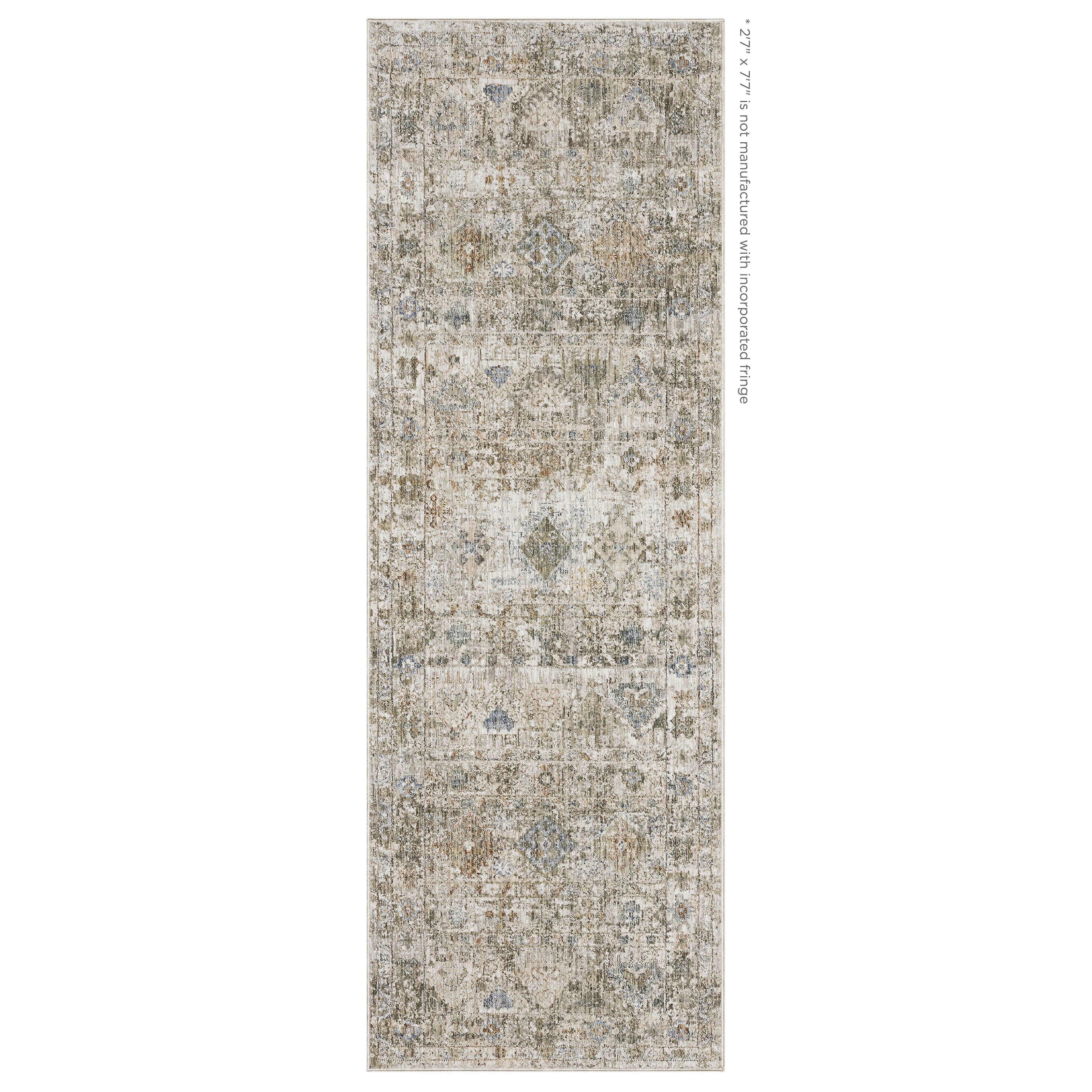 The Avalon collection features beautifully detailed traditional designs in a subtle color palette of warm neutrals with accents of watery blues, golden terracotta tones and touches of mossy green. It is constructed of incredibly soft space-dyed polyester giving the collection a nice hand as well as a look of modern neutrality and textural appeal. (Fringe is not included on the 2'7"x7'7" runner nor the 3'2"x 5' accent rug size.)