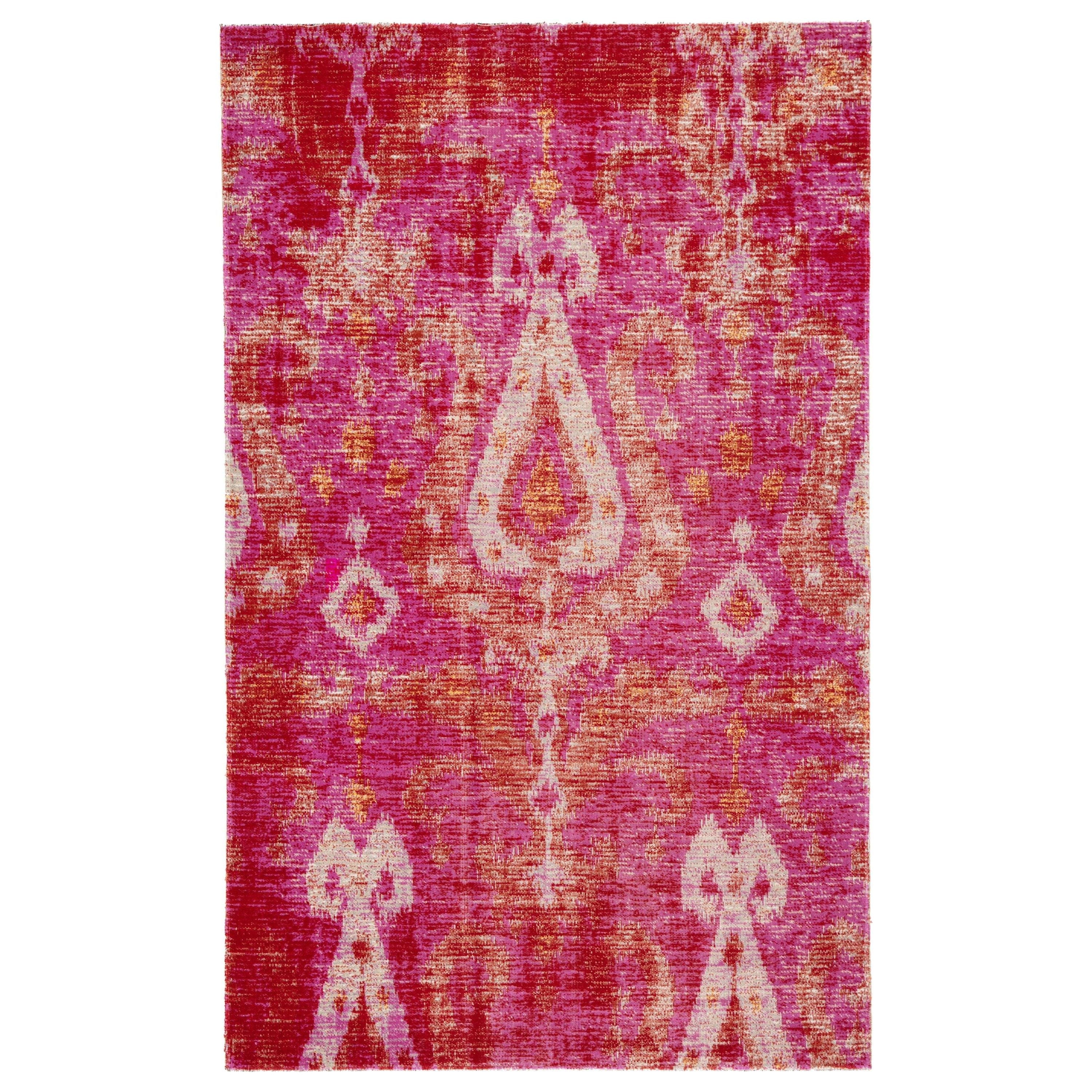 Polaris POL16 Zenith rug from the versatile indoor-outdoor collection. Crafted from a sturdy yet lightweight polypropylene material, this rug effortlessly blends traditional design with modern functionality. The Zenith rug features a striking large-scale ikat pattern that adds a bold global touch to any space. Its vibrant red and pink color palette brings life to the resist dye-inspired design, creating a playful and worldly look. Perfect for kitchens, living rooms, or outdoor patios, this rug is designed to make a statement while offering durability and style in one package. Elevate your decor with the Polaris POL16 Zenith rug today!