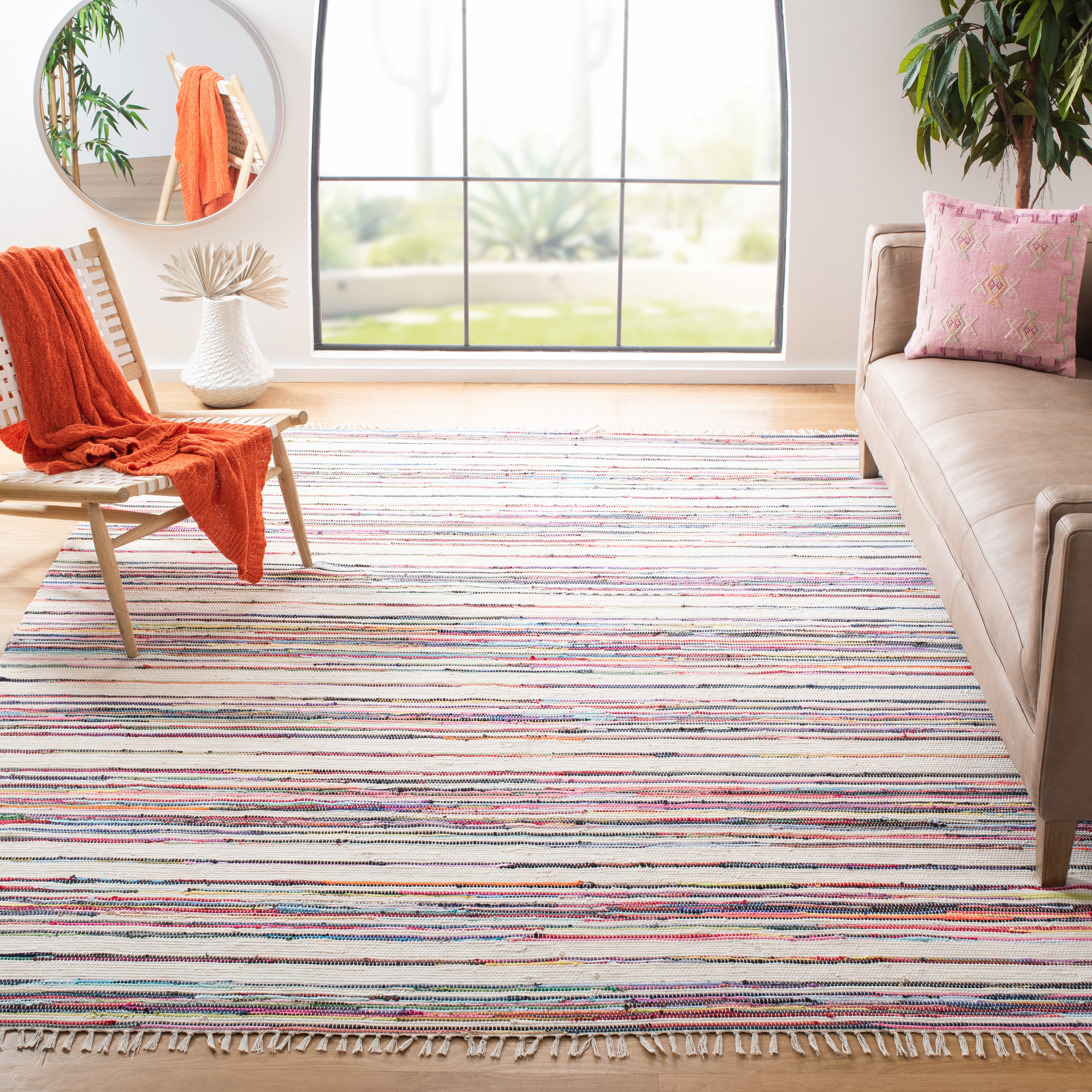 Rag Rug RAR126G in Ivory Multi from the Rag Rug Collection, inspired by American textile art. These rugs feature vibrant colors and a classic flat-weave texture, adding a touch of simple charm to any room. With a soft, hand-woven feel underfoot, they bring warmth and whimsical character to casually styled decor.