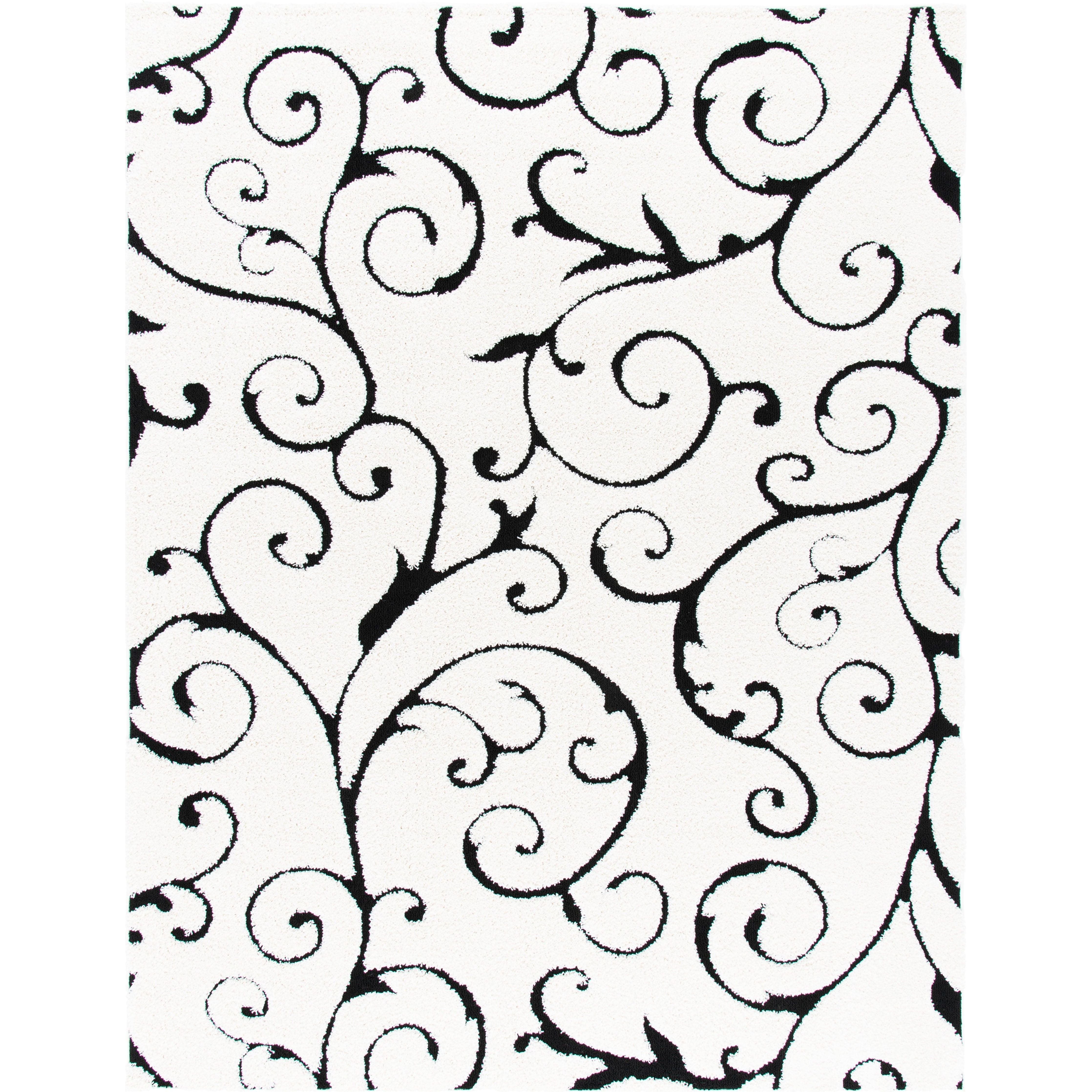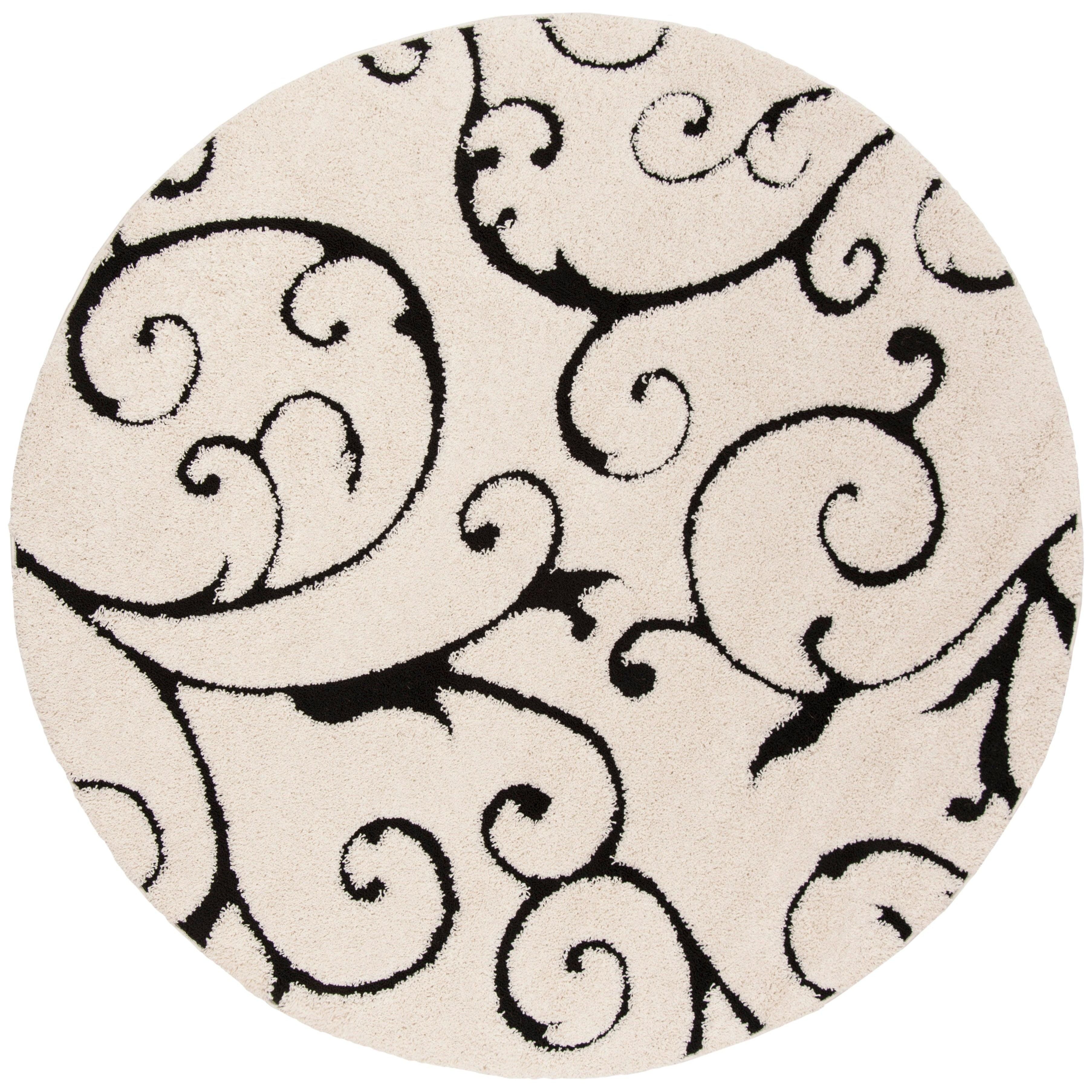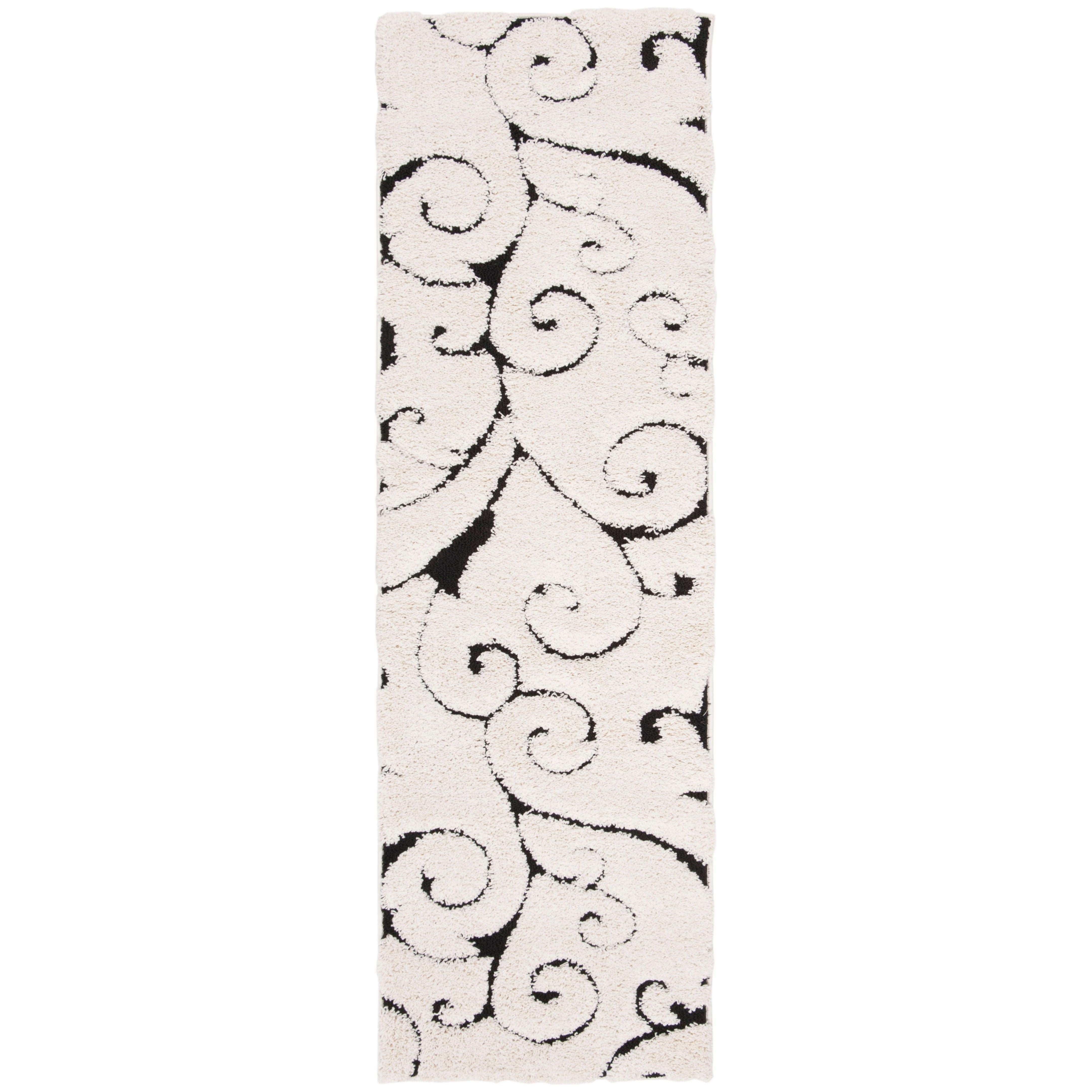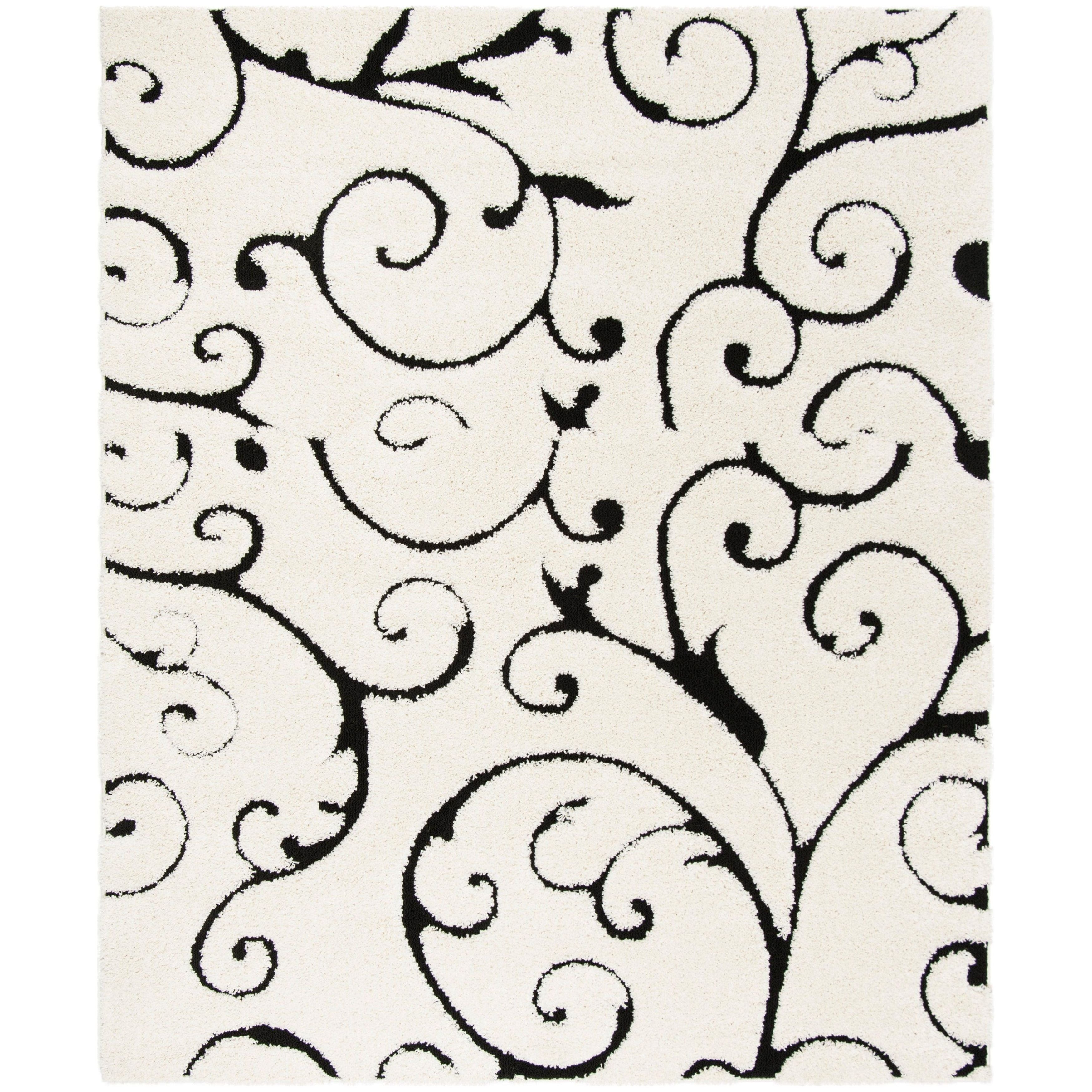Shag SG455 Ivory Black rug from SAFAVIEH, a masterpiece of subtle sophistication. This luxurious rug features a textured scrolling vine design in rich colors, making it a versatile addition to any room in your home, even high-traffic areas. The high-low pile adds visual intrigue and warmth, with an approximate thickness of 1.2 inches for a plush feel.