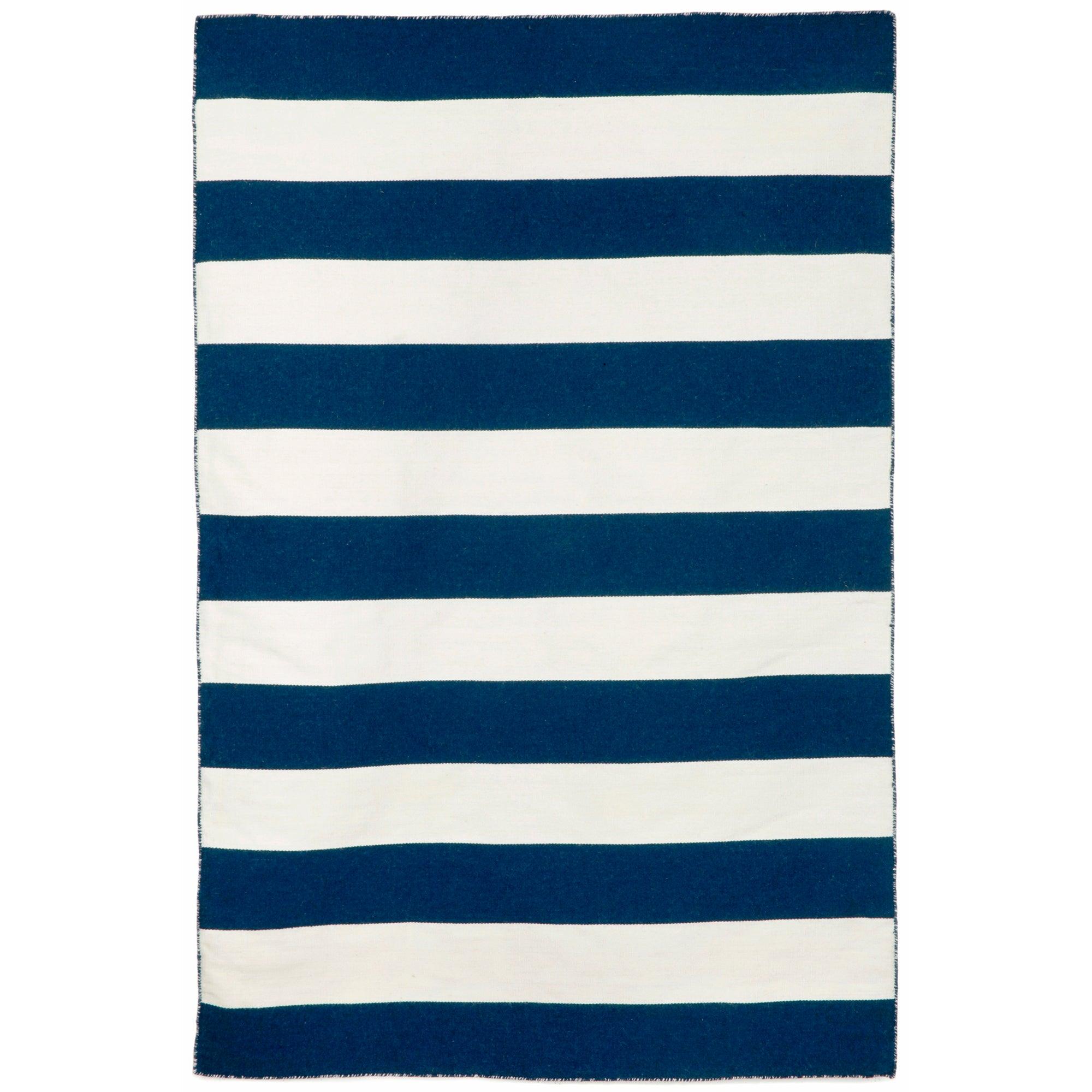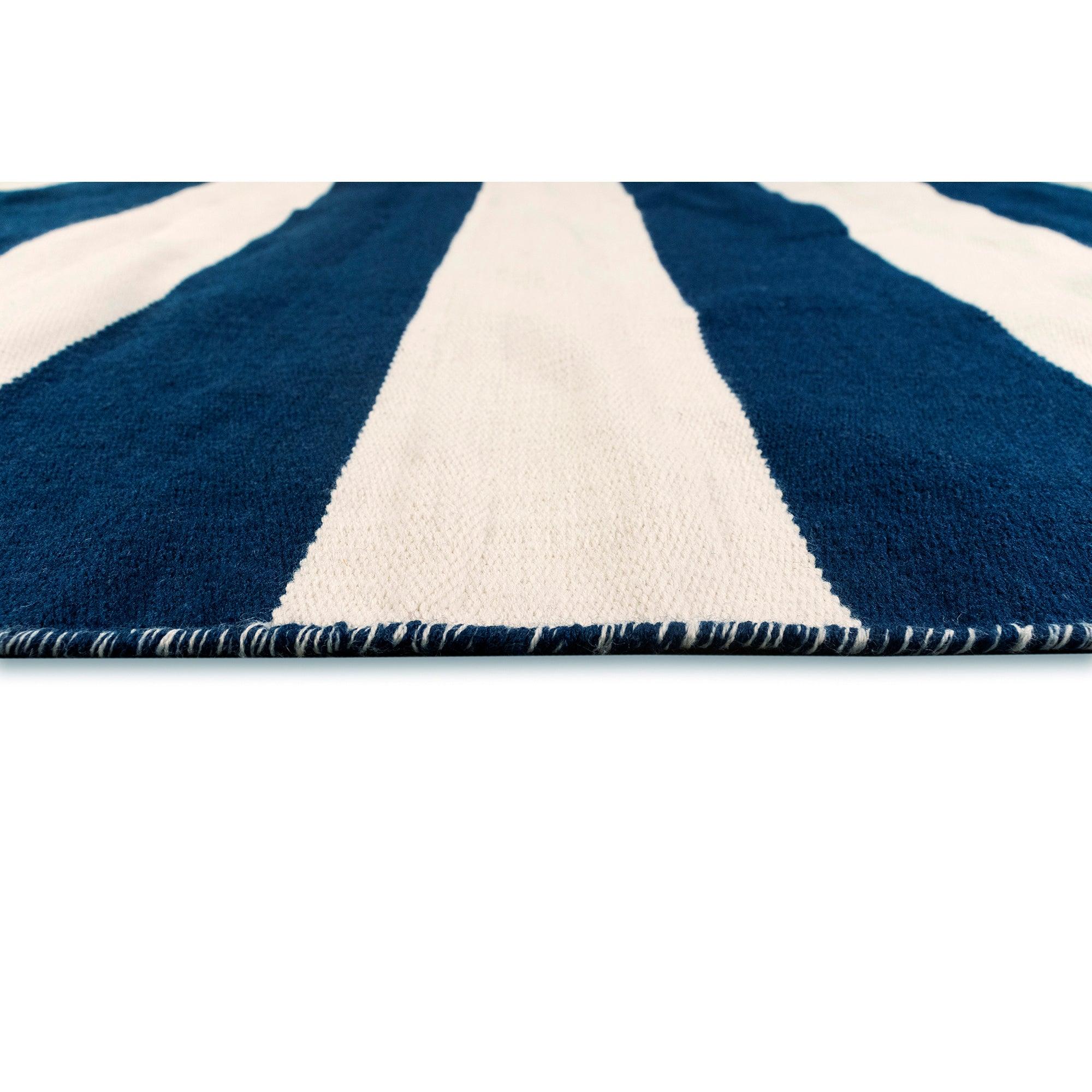Sorrento Rugby Stripe Navy rug, a stylish addition to your indoor or outdoor space. Its handwoven construction showcases a simple yet fashionable pattern, complemented by vibrant blended colors in navy. Crafted from weather-resistant synthetic fiber, this reversible flatweave rug is both durable and versatile.