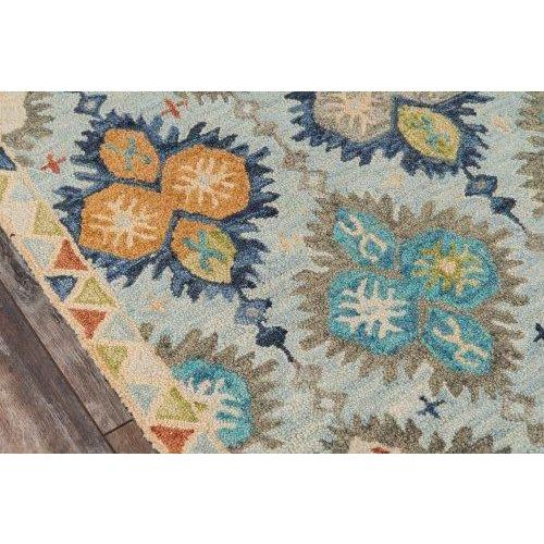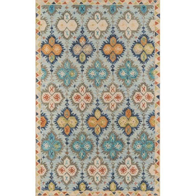 Tangier TAN17 Blue area rug, a unique addition to your home decor. Inspired by global designs and Kazak rug motifs, this traditional rug collection brings a touch of wanderlust to any room. The warm color palette features shades of red, gold, burnt sienna, and sky blue, evoking the essence of desert landscapes.