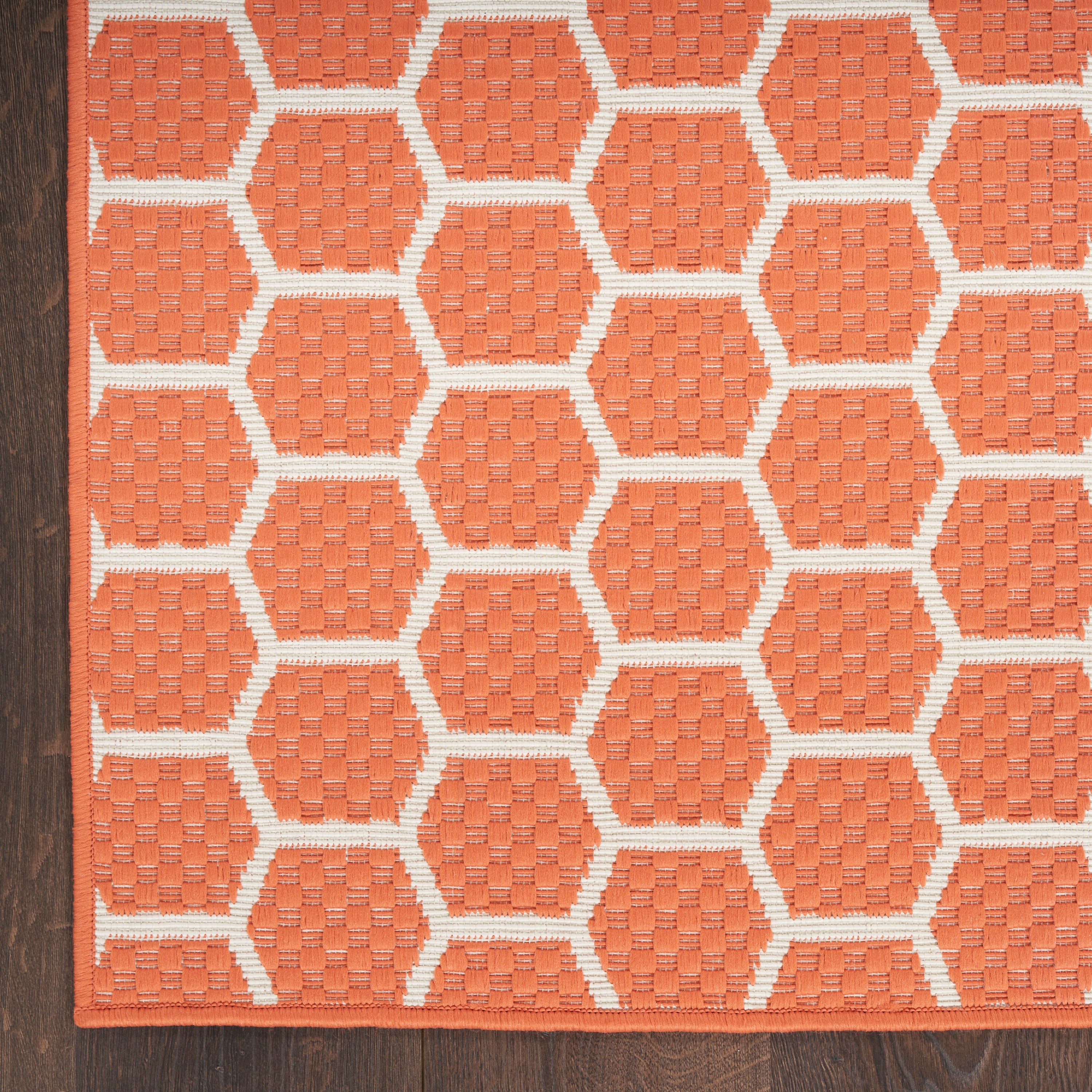 Elevate your outdoor space with the vibrant Twist Reversible TWS01 Coral rug. Featuring a striking coral orange hue and a modern honeycomb design, this rug brings a bold touch to your décor. The beauty of this rug lies in its versatility - simply flip it over to reveal an inverted version of the pattern for a different look. Crafted from durable polypropylene and polyester fibers, this rug is low maintenance and easy to clean, making it perfect for both indoor and outdoor use.