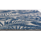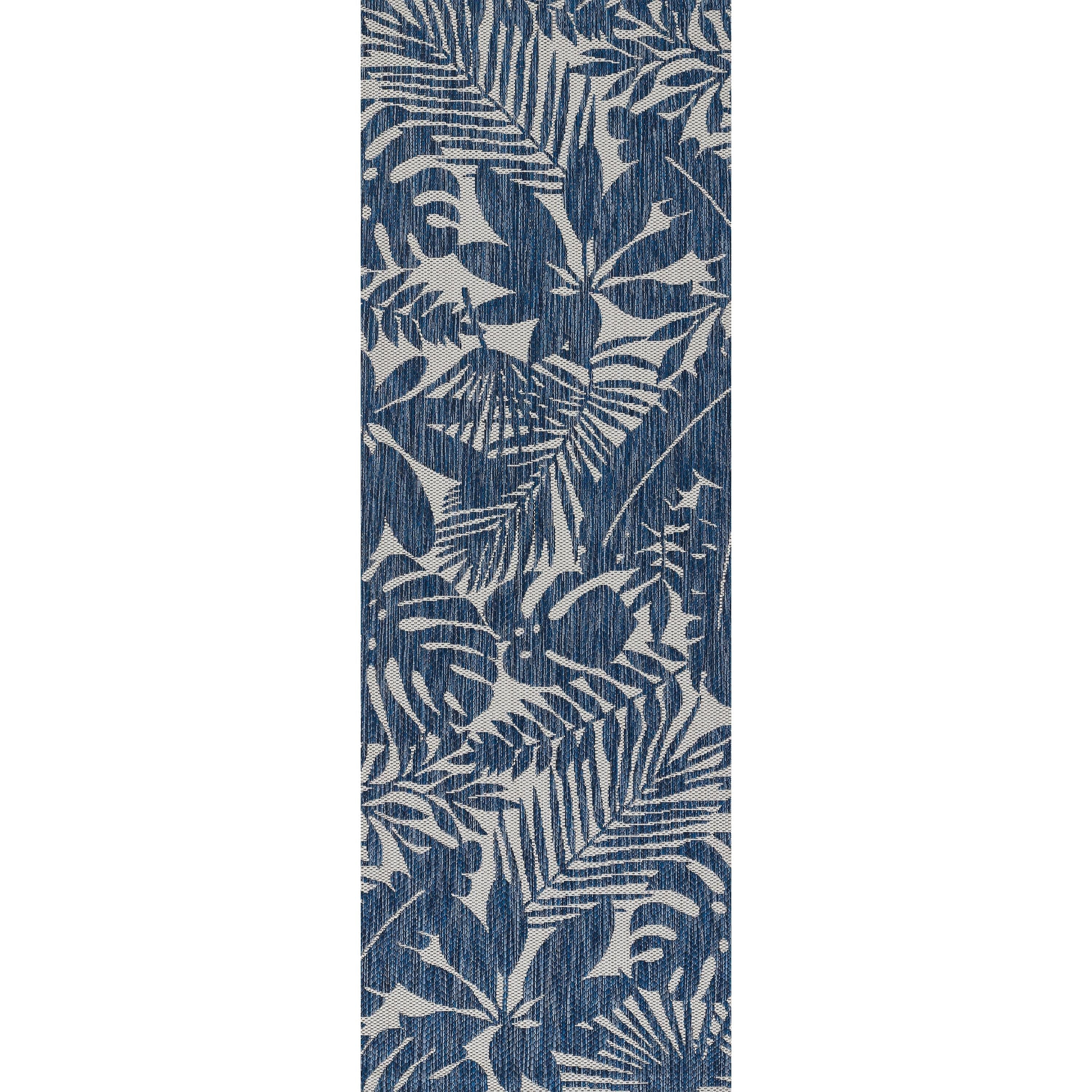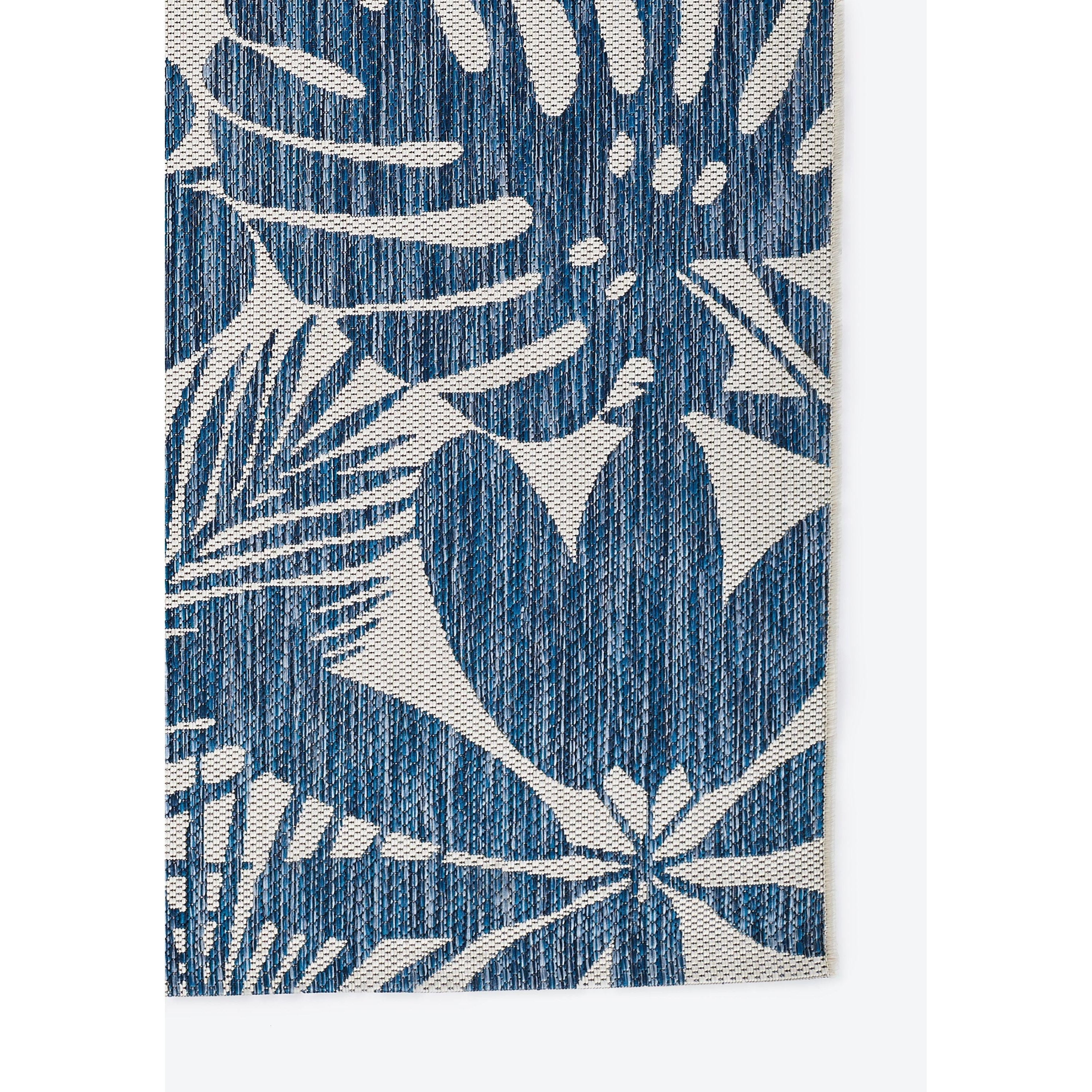Villa Vi 13 Blue indoor/outdoor rug collection, a fusion of modern design and durability. This contemporary rug assortment showcases repetitive patterns influenced by global architectural elements, adding a touch of sophistication to any space. The high contrast colors of charcoal grey, chambray blue, fuchsia pink, and russet red create a striking visual impact on the floor.