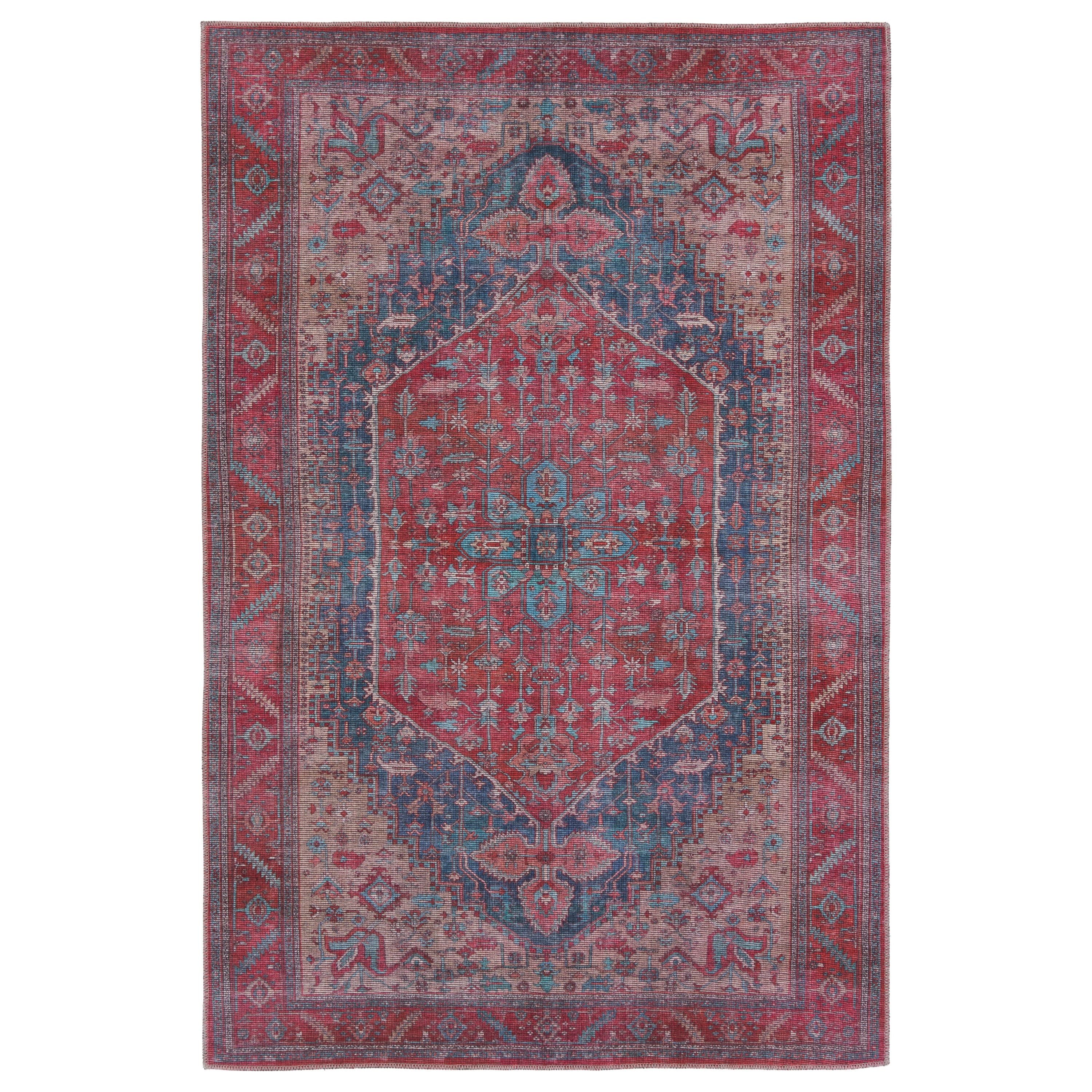 Vindage VIN02 Fairbanks area rug, a perfect blend of vintage charm and modern durability. This collection is designed to bring a touch of old-world elegance to contemporary living spaces. The Fairbanks rug showcases a beautifully distressed medallion pattern with intricate floral detailing in rich hues of red, blues, and beige.